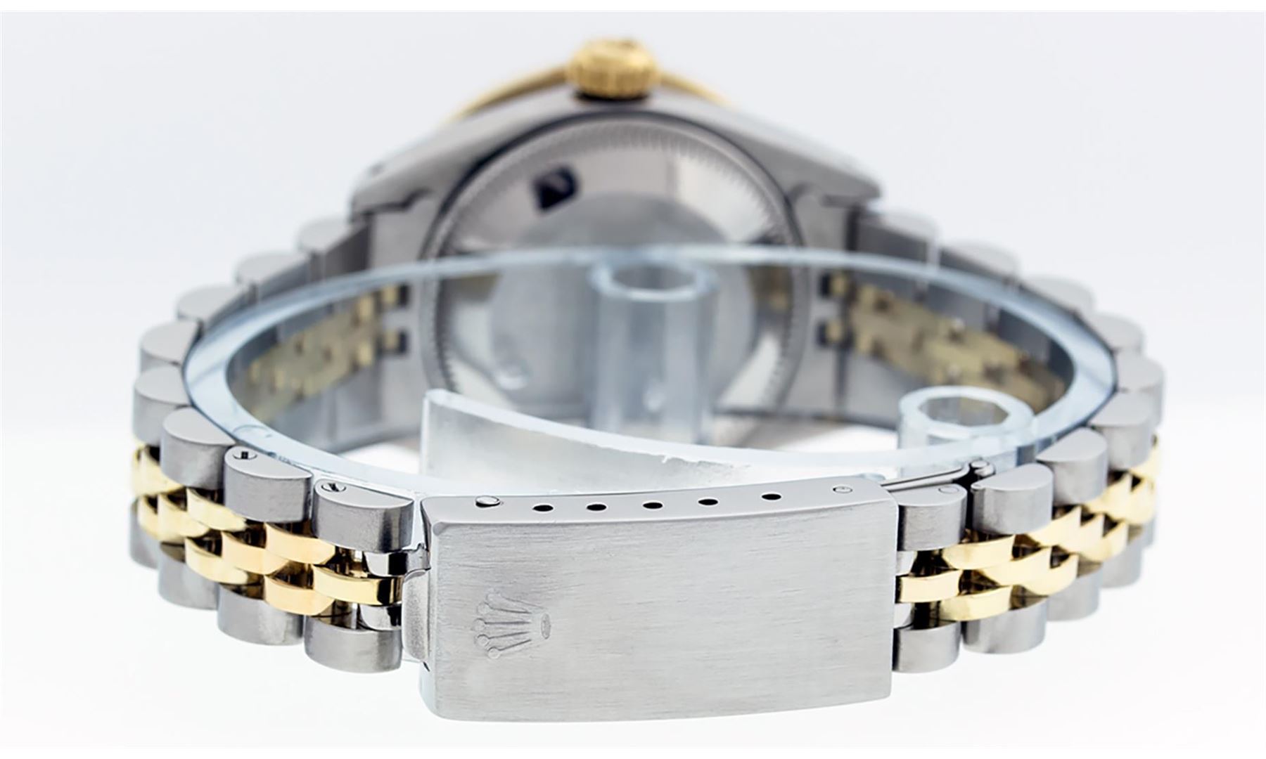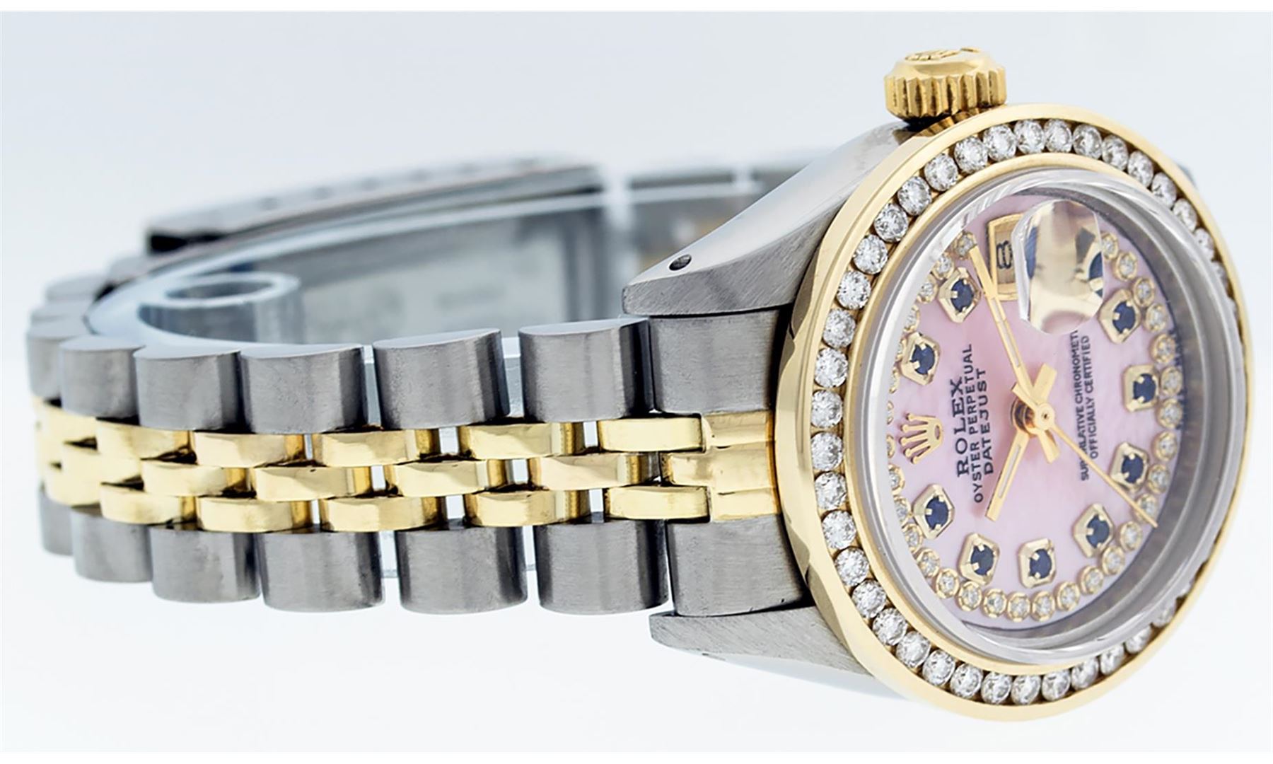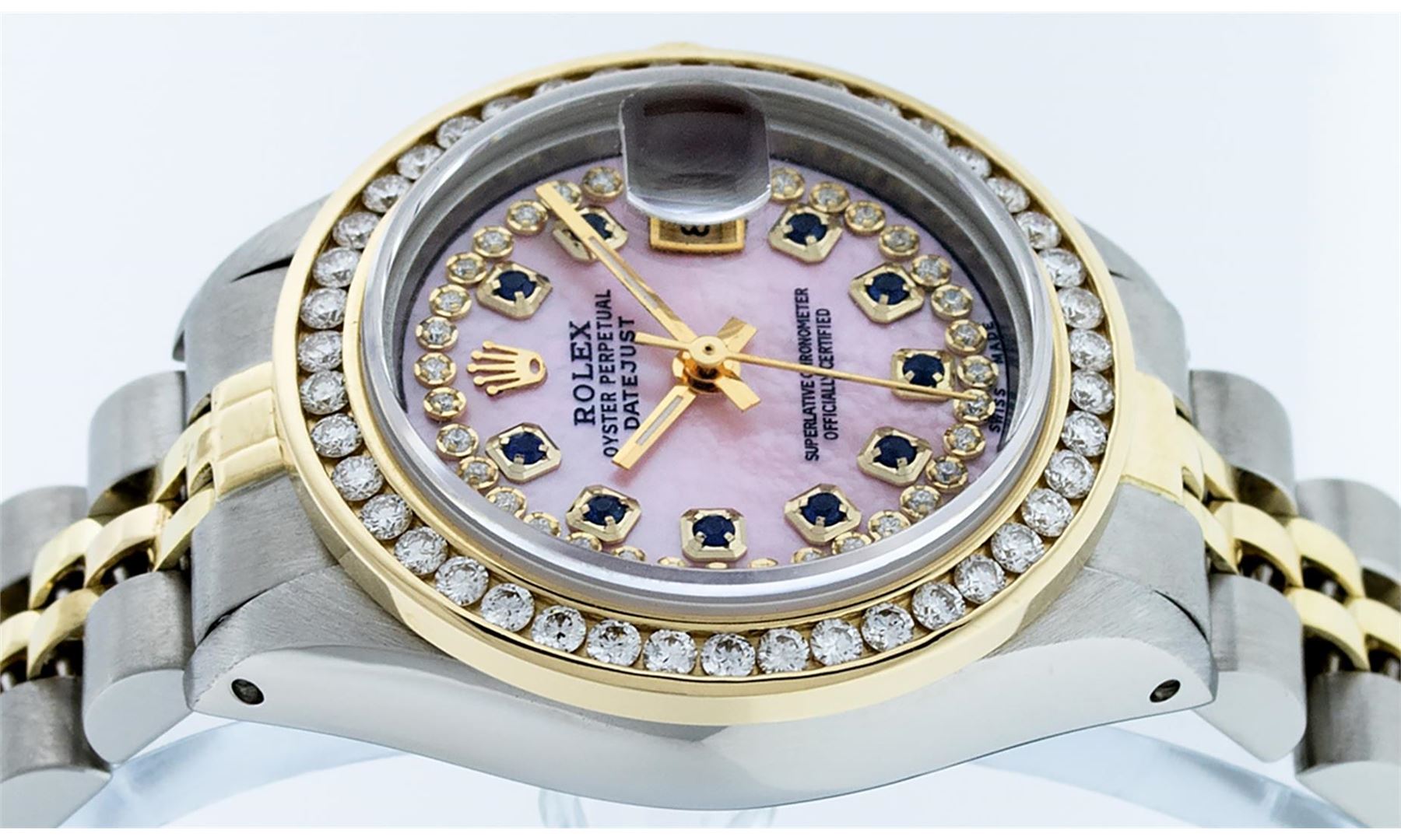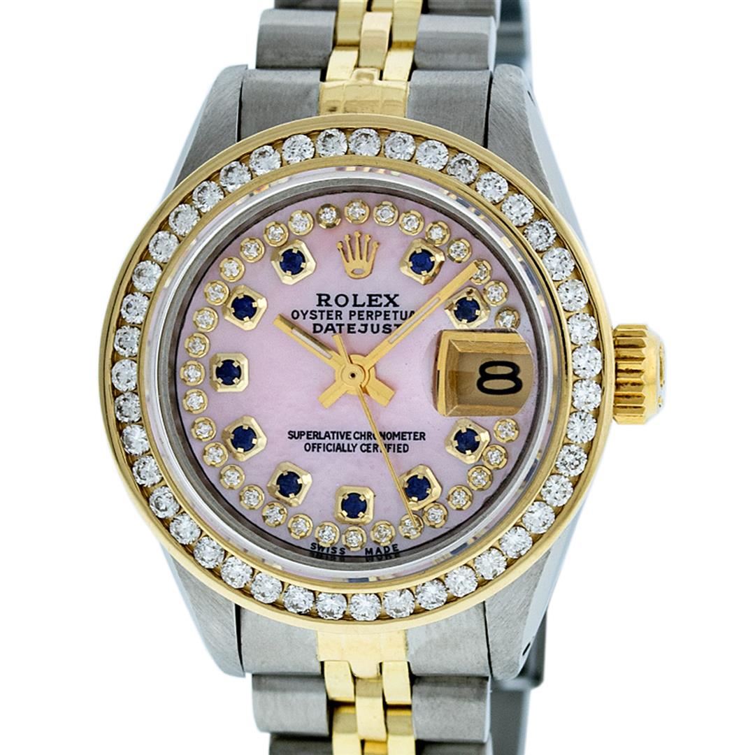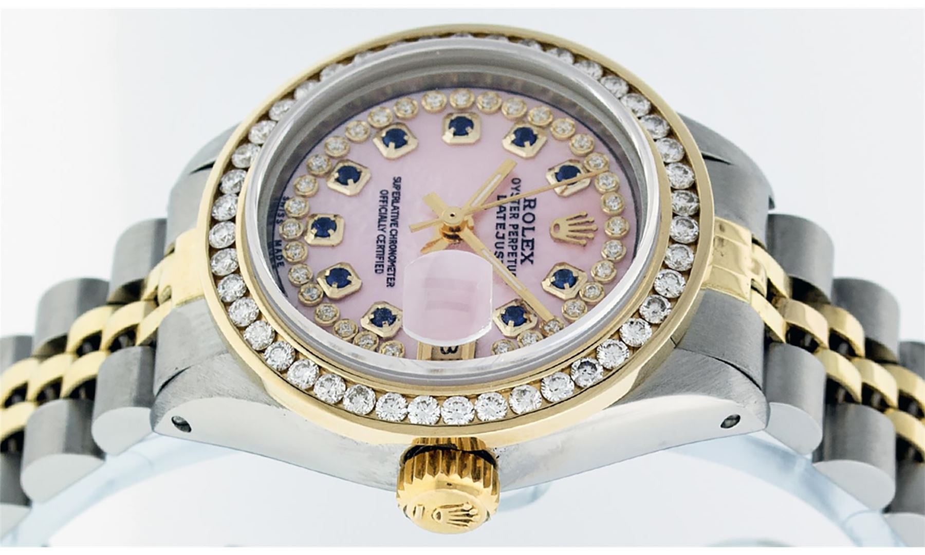 One Ladies Two Tone Rolex Datejust Polished, Serviced & Electronically Tested, Yellow Gold & Stainless Steel Case: 26mm, Yellow Gold Crown, Custom Bezel: New 18K Yellow Gold Channel Set Diamond Bezel, Diamond Count: 43 Diamonds in dial, Total Weight 1.00 Carat, Clarity: SI-VS, Color: G to H. Custom Crystal: New Scratch Resistant Synthetic Sapphire Cyclops Lens. Custom Hands: New Luminescent Hands. Movement: Automatic Winding Movement. Custom Dial: Pink Mother Of Pearl String Diamond and Sapphire Dial, Stone Count: 33 Diamonds + 10 Sapphires, Clarity: SI-VS, Color: G to H. Date Window: 3 O'Clock Position Date Display, Model: Datejust. Condition: G-6 Extra Fine. Bracelet: Two Tone Yellow Gold & Stainless Steel Jubilee Band. Bright Polish. 6.0 Inch Length, Adjustable. Standard Clasp, With Rolex Logo. This Watch Has Been Serviced Time Tested And Is In Excellent Condition It Is Free Of All Scratches And Dents.