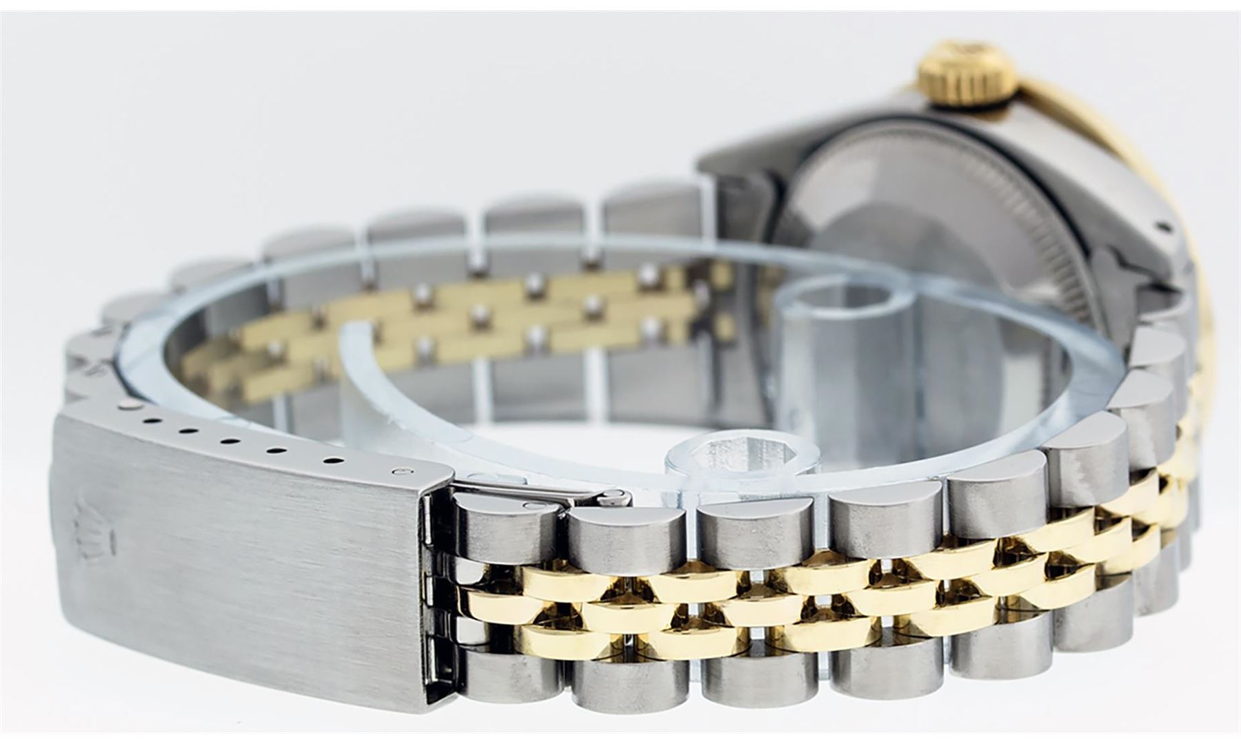 One Ladies Two Tone Rolex Datejust Polished, Serviced & Electronically Tested, Yellow Gold & Stainless Steel Case: 26mm, Yellow Gold Crown, Custom Bezel: New 18K Yellow Gold Channel Set Diamond Bezel, Diamond Count: 43 Diamonds in dial, Total Weight 1.00 Carat, Clarity: SI-VS, Color: G to H. Custom Crystal: New Scratch Resistant Synthetic Sapphire Cyclops Lens. Custom Hands: New Luminescent Hands. Movement: Automatic Winding Movement. Custom Dial: Pink Mother Of Pearl String Diamond and Sapphire Dial, Stone Count: 33 Diamonds + 10 Sapphires, Clarity: SI-VS, Color: G to H. Date Window: 3 O'Clock Position Date Display, Model: Datejust. Condition: G-6 Extra Fine. Bracelet: Two Tone Yellow Gold & Stainless Steel Jubilee Band. Bright Polish. 6.0 Inch Length, Adjustable. Standard Clasp, With Rolex Logo. This Watch Has Been Serviced Time Tested And Is In Excellent Condition It Is Free Of All Scratches And Dents.