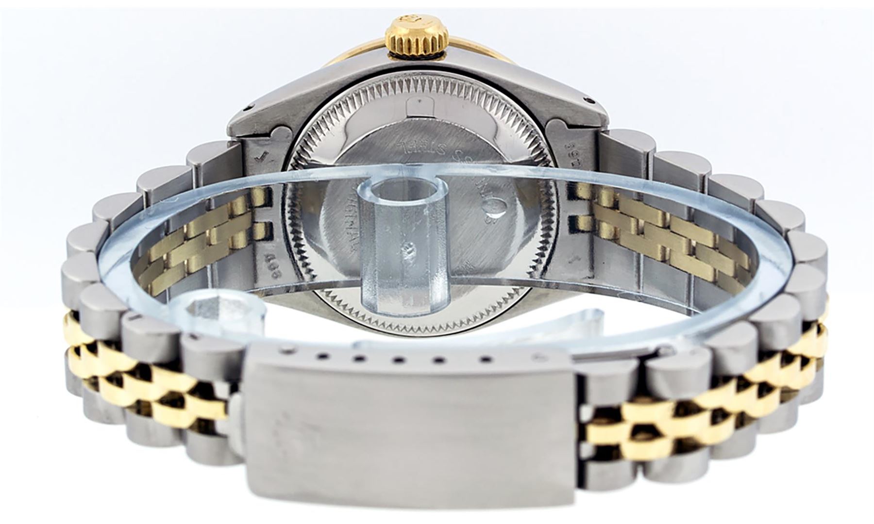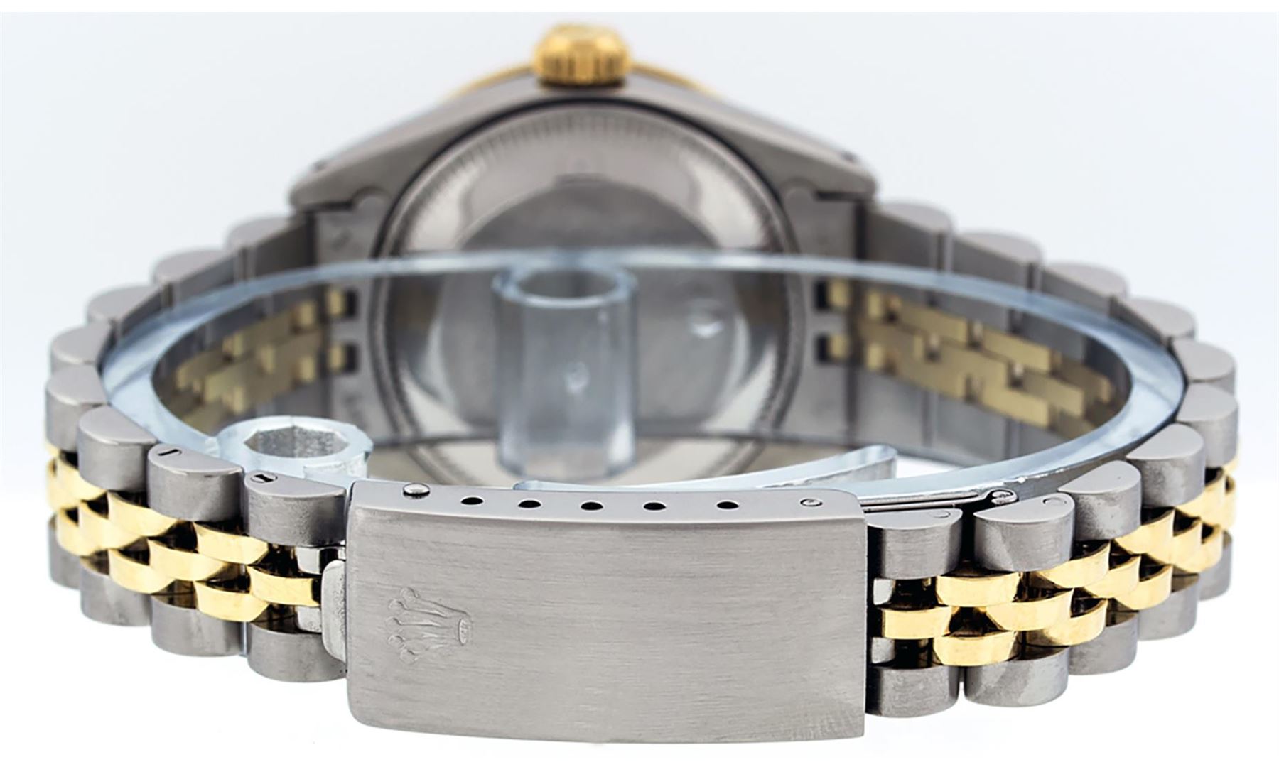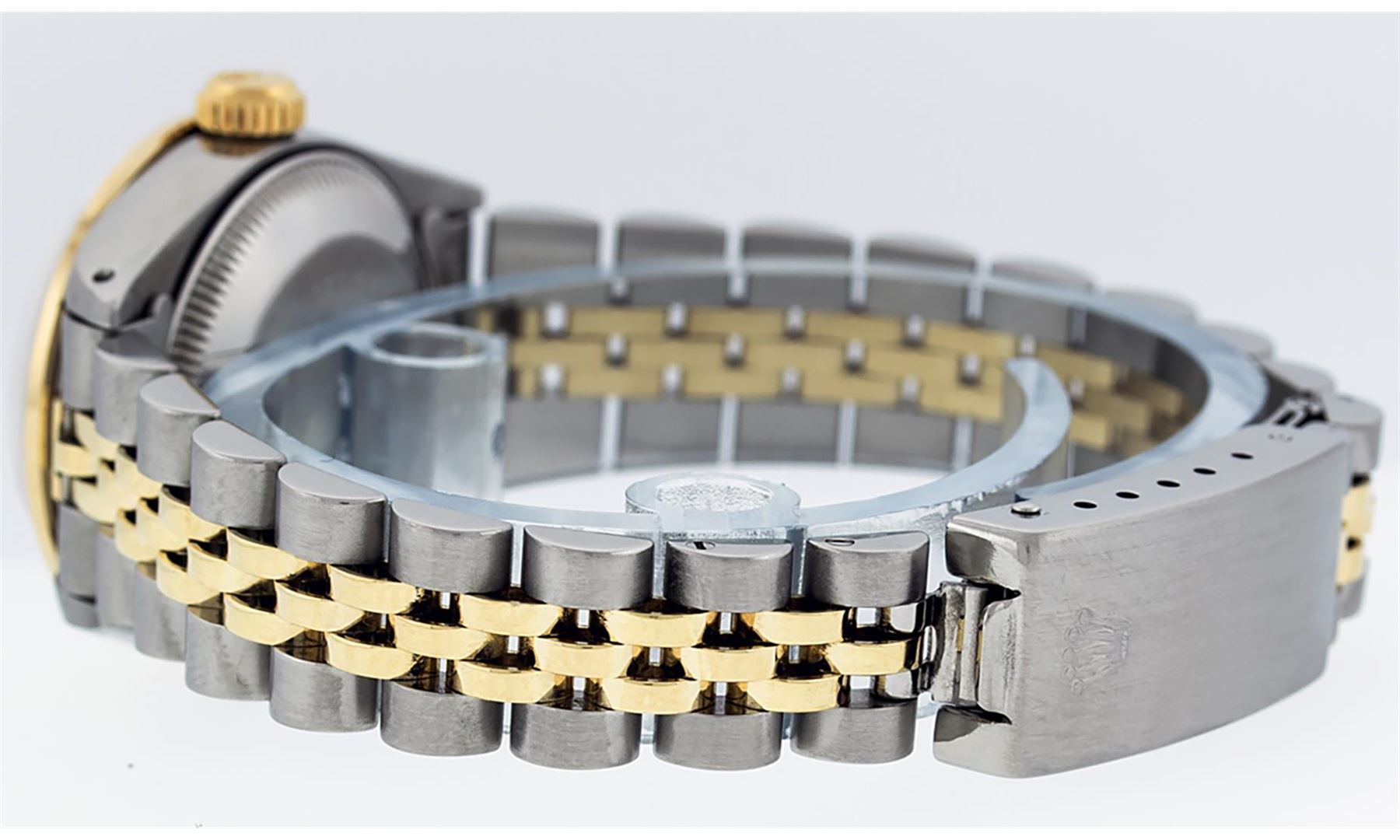 One Ladies Pre Owned Two Tone Rolex Datejust Polished, Serviced & Electronically Tested, Yellow Gold & Stainless Steel Case: 26mm, Yellow Gold Crown, Custom Bezel: New 18K Yellow Gold Sapphire Beadset Diamond Bezel, Diamond + Gem Count: 28 Diamonds + 4 Sa
