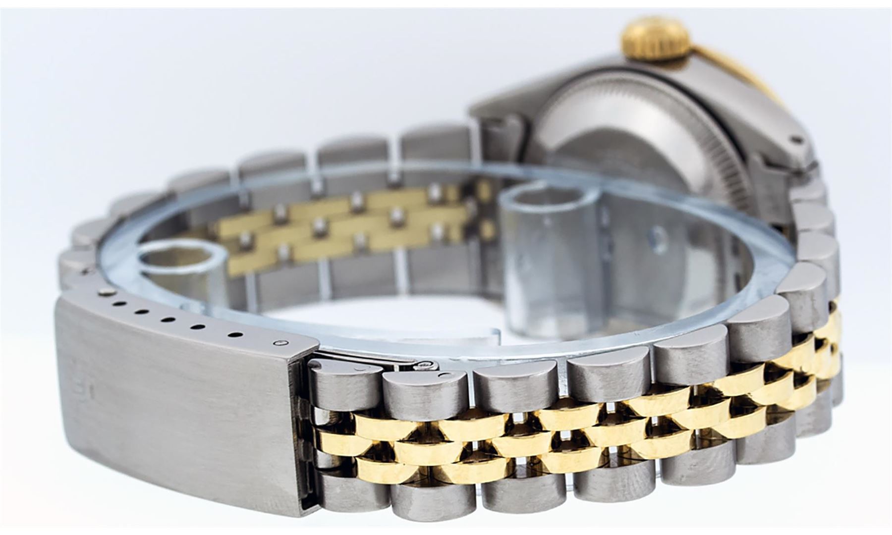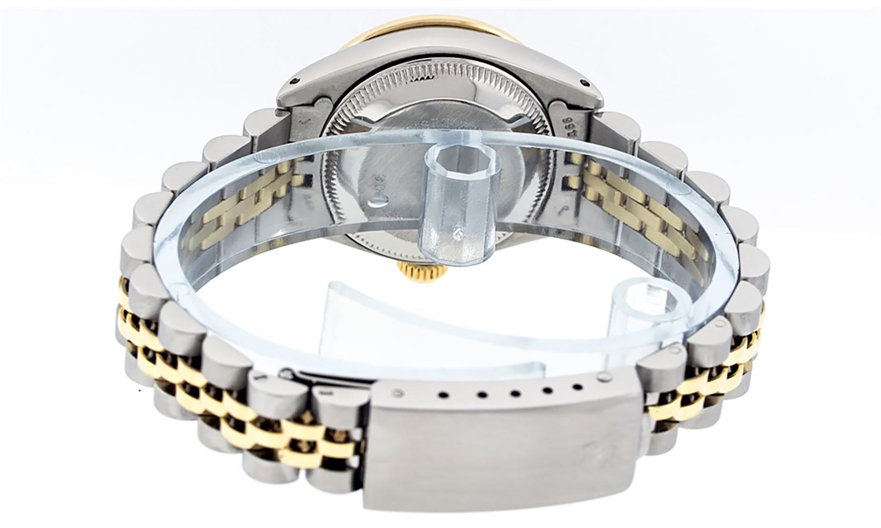 One Ladies Pre Owned Two Tone Rolex Datejust Polished, Serviced & Electronically Tested, Yellow Gold & Stainless Steel Case: 26mm, Yellow Gold Crown, Custom Bezel: New 18K Yellow Gold Sapphire Beadset Diamond Bezel, Diamond + Gem Count: 28 Diamonds + 4 Sa