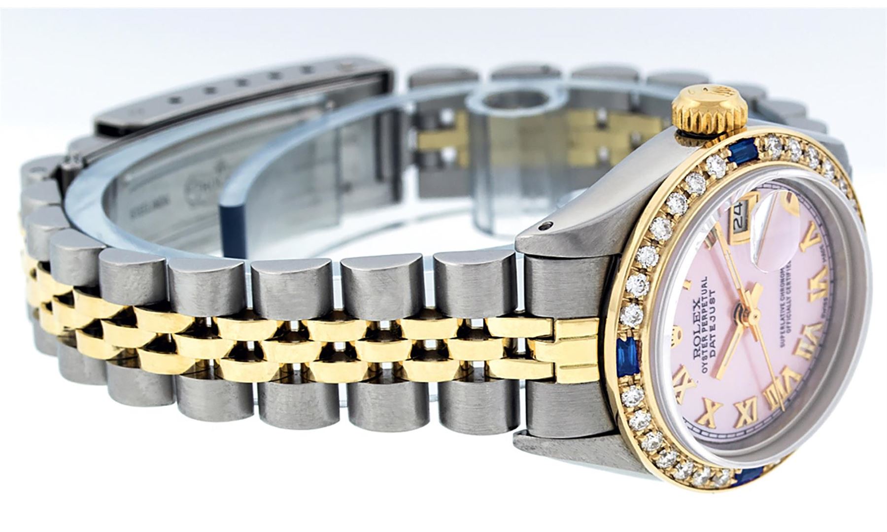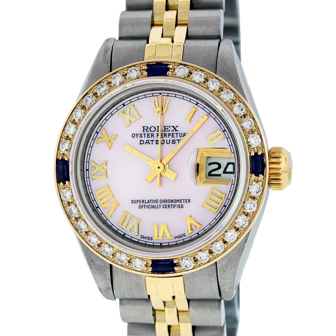 One Ladies Pre Owned Two Tone Rolex Datejust Polished, Serviced & Electronically Tested, Yellow Gold & Stainless Steel Case: 26mm, Yellow Gold Crown, Custom Bezel: New 18K Yellow Gold Sapphire Beadset Diamond Bezel, Diamond + Gem Count: 28 Diamonds + 4 Sapphires, Clarity: SI-VS, Color: G to H. Custom Crystal: New Sapphire With Date Window. Custom Hands: New Luminescent Hands. Rolex Movement: Automatic Winding Movement. Custom Dial: Pink Mother Of Pearl With Roman Hour Markers With Square Track. Date Window: 3 Oclock Position Date Display, Model: Datejust, Condition: G-6 Extra Fine. Rolex Bracelet: Two Tone Yellow Gold & Stainless Steel Jubilee Band. Bright Polish. 6.0 Inch Length, Adjustable. Standard Clasp, With Rolex Logo. This Watch Has Been Serviced Time Tested And Is In Excellent Condition It Is Free Of All Scratches And Dents.