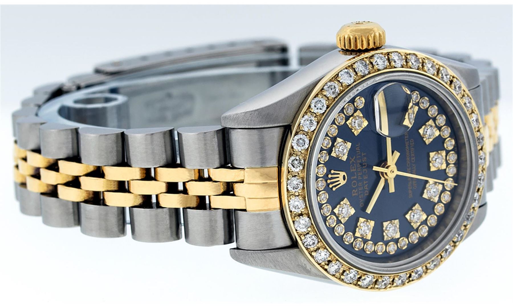 One Ladies Pre Owned 18K Two Tone Quickset Rolex Datejust Polished, Serviced & Electronically Tested, 18K Yellow Gold & Stainless Steel Case: 26mm, 18K Yellow Gold Crown, Custom Bezel: New 18K Yellow Gold Beadset Diamond Bezel, Diamond Count: 43 Diamonds