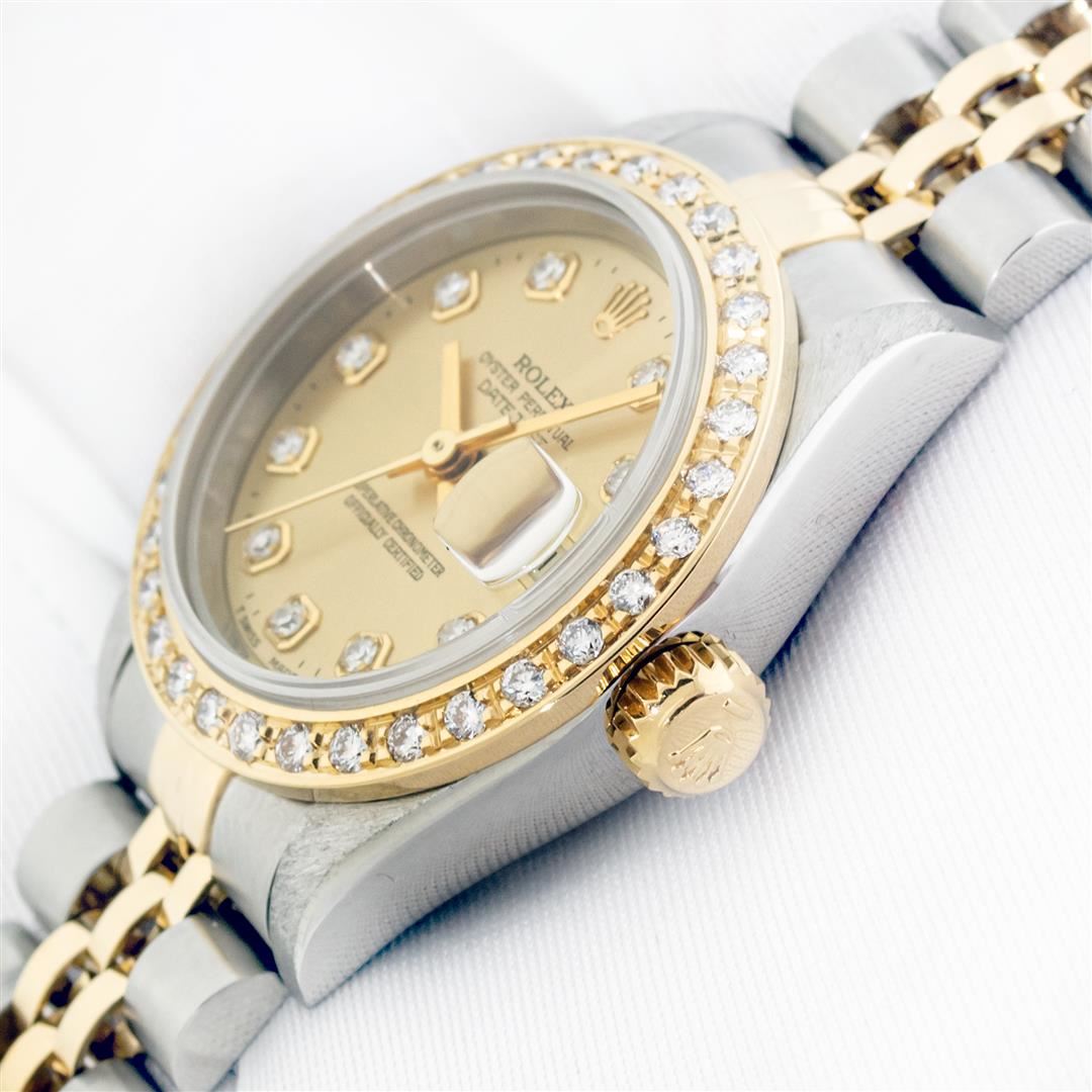 Rolex Ladies Pre Owned Sapphire Quickset 18K Yellow Gold and Stainless Steel Two Tone Datejust Polished Bright with Satin Finish, Serviced & Electronically Tested, Rolex Stainless Steel Case: 26mm, Rolex 18K Yellow Gold Crown, Custom Bezel: New Beadset Diamond Bezel, Diamond Count: 32 Diamonds On Bezel. Custom Crystal: New Sapphire With Magnified Date Window. Custom Hands: New Hands. Rolex Movement: Automatic Winding Movement 2235. Rolex Dial: Factory Champagne Diamond Dial, Diamond Count: 10 Diamonds On Dial. Date Window: 3 O'Clock Position Date Display, Model: Quickset Datejust, Condition: G-6 Extra Fine. Rolex Bracelet: 18K Yellow Gold & Stainless Steel Jubilee Band. Bright Polish & Satin Finish. 6.0 Inch Length, Adjustable. Standard Clasp, With Rolex Logo. This Watch Has Been Serviced Time Tested And Is In Excellent Condition It Is Free Of All Scratches And Dents. This Watch Comes With A Rolex Box.