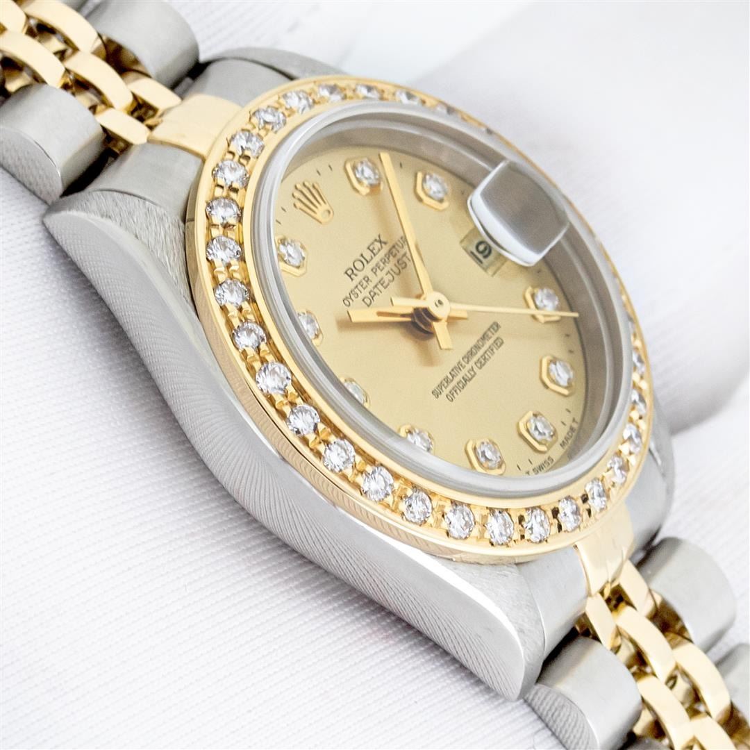 Rolex Ladies Pre Owned Sapphire Quickset 18K Yellow Gold and Stainless Steel Two Tone Datejust Polished Bright with Satin Finish, Serviced & Electronically Tested, Rolex Stainless Steel Case: 26mm, Rolex 18K Yellow Gold Crown, Custom Bezel: New Beadset Diamond Bezel, Diamond Count: 32 Diamonds On Bezel. Custom Crystal: New Sapphire With Magnified Date Window. Custom Hands: New Hands. Rolex Movement: Automatic Winding Movement 2235. Rolex Dial: Factory Champagne Diamond Dial, Diamond Count: 10 Diamonds On Dial. Date Window: 3 O'Clock Position Date Display, Model: Quickset Datejust, Condition: G-6 Extra Fine. Rolex Bracelet: 18K Yellow Gold & Stainless Steel Jubilee Band. Bright Polish & Satin Finish. 6.0 Inch Length, Adjustable. Standard Clasp, With Rolex Logo. This Watch Has Been Serviced Time Tested And Is In Excellent Condition It Is Free Of All Scratches And Dents. This Watch Comes With A Rolex Box.