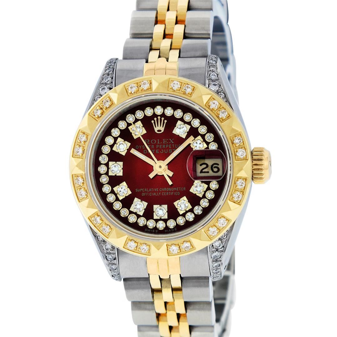 One Ladies Two Tone Rolex Datejust Polished, Serviced & Electronically Tested, Yellow Gold & Stainless Steel Case: 26mm, Yellow Gold Crown, Diamond Lugs: 24 Diamonds On Lugs, Clarity: SI-VS, Color: G to H. Custom Bezel: New 18K Yellow Gold Pyramid Diamond Bezel, Diamond Count: 24 Diamonds On Bezel, Total Weight .50 Carat, Clarity: SI-VS, Color: G to H. Custom Crystal: New Synthetic Scratch Resistant Sapphire Cyclops Lens. Custom Hands: New Luminescent Hands. Movement: Automatic Winding Movement. Custom Dial: Refinished Red Vignette With String Single Cut Diamond Hour Markers, Diamond Count: 43 Diamonds On Dial, Clarity: SI-VS, Color: G to H. Date Window: 3 O'Clock Position Date Display, Model: Datejust. Condition: G-6 Extra Fine. Bracelet: Two Tone Yellow Gold & Stainless Steel Jubilee Band. Bright Polish. 6.0 Inch Length, Adjustable. Standard Clasp, With Rolex Logo. This Watch Has Been Serviced Time Tested And Is In Excellent Condition It Is Free Of All Scratches And Dents.