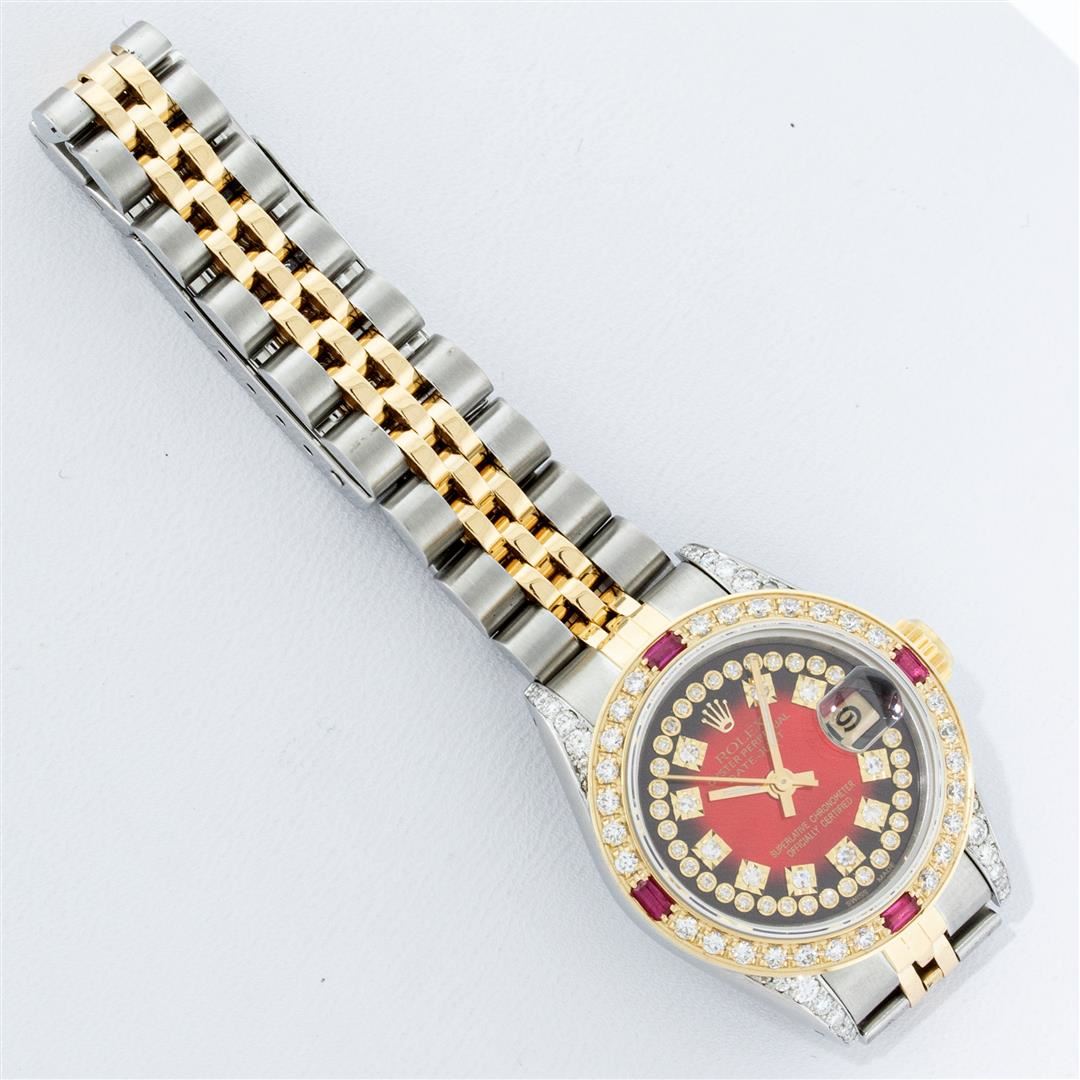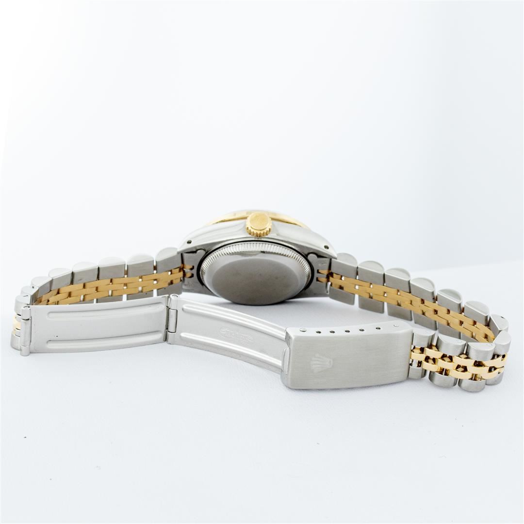 One Ladies Pre Owned Two Tone Rolex Datejust Polished, Serviced & Electronically Tested, Yellow Gold & Stainless Steel Case: 26mm, Yellow Gold Crown, Custom Diamond Lugs: 24 Diamonds On Lugs, Clarity: SI-VS, Color: G to H. Custom Bezel: New 18K Yellow Gol