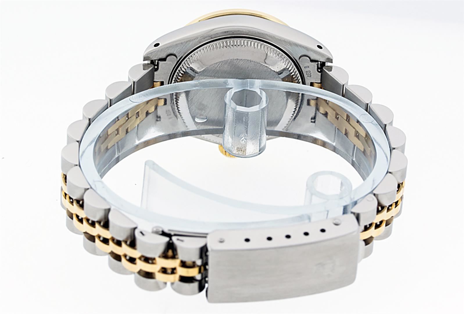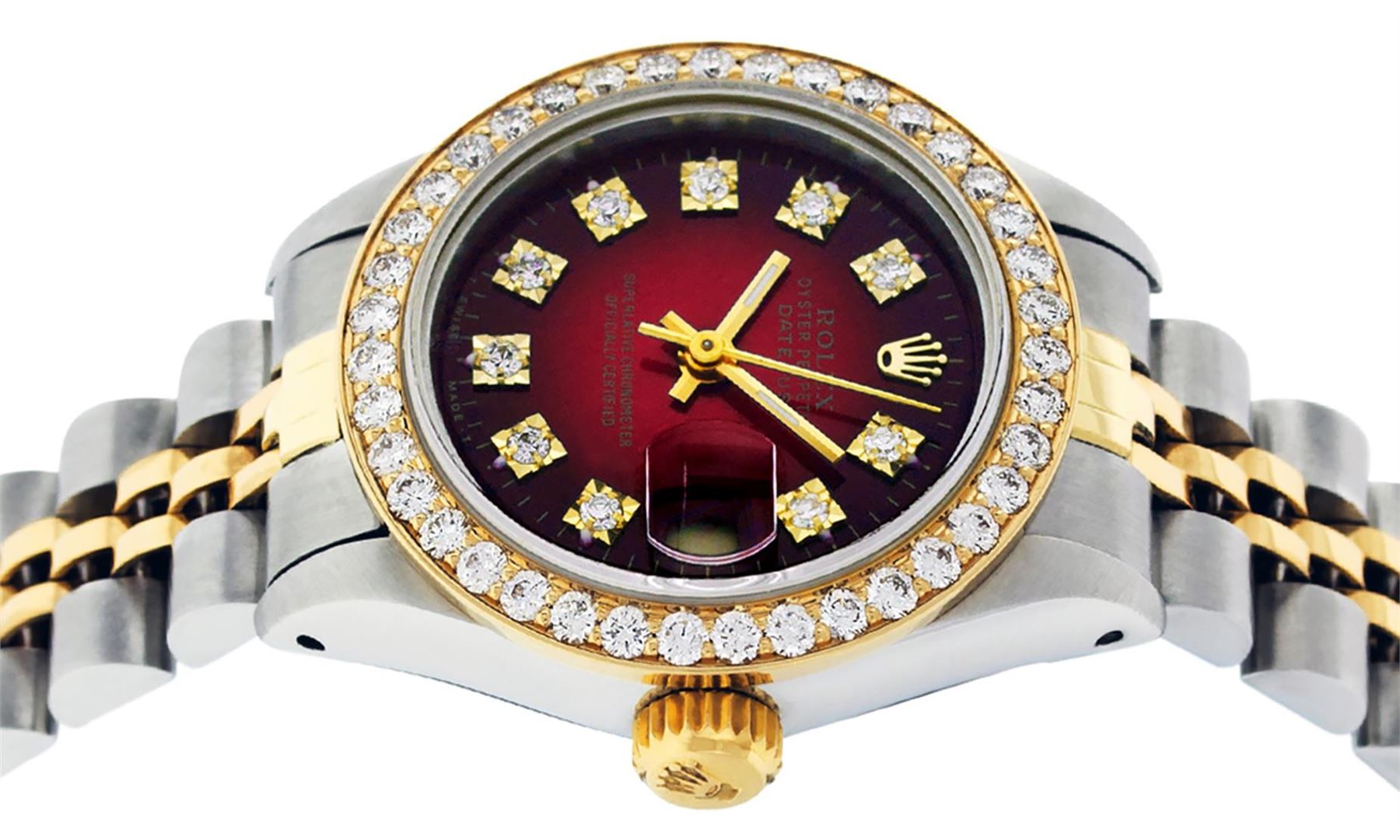 One Ladies Two Tone Rolex Datejust Polished, Serviced & Electronically Tested, Yellow Gold & Stainless Steel Case: 26mm, Yellow Gold Crown, Custom Bezel: New 18K 1ctw Yellow Gold Beadset Diamond Bezel, Diamond Count: 42 Diamonds, Total Weight 1.00 Carat, Clarity: SI-VS, Color: G to H. Custom Crystal: New Scratch Resistant Synthetic Sapphire Cyclops Lens. Custom Hands: New Luminescent Hands. Movement: Automatic Winding Movement. Custom Dial: Red Vignette VS Diamond Dial, Diamond Count: 10 Single Cut Diamonds in Dial, G To H In Color, VS Clarity. Date Window: 3 O'Clock Position Date Display, Model: Datejust, Condition: G-6 Extra Fine. Bracelet: Two Tone Yellow Gold & Stainless Steel Jubilee Band. Bright Polish. 6.0 Inch Length, Adjustable. Standard Clasp, With Rolex Logo. This Watch Has Been Serviced Time Tested And Is In Excellent Condition It Is Free Of All Scratches And Dents.