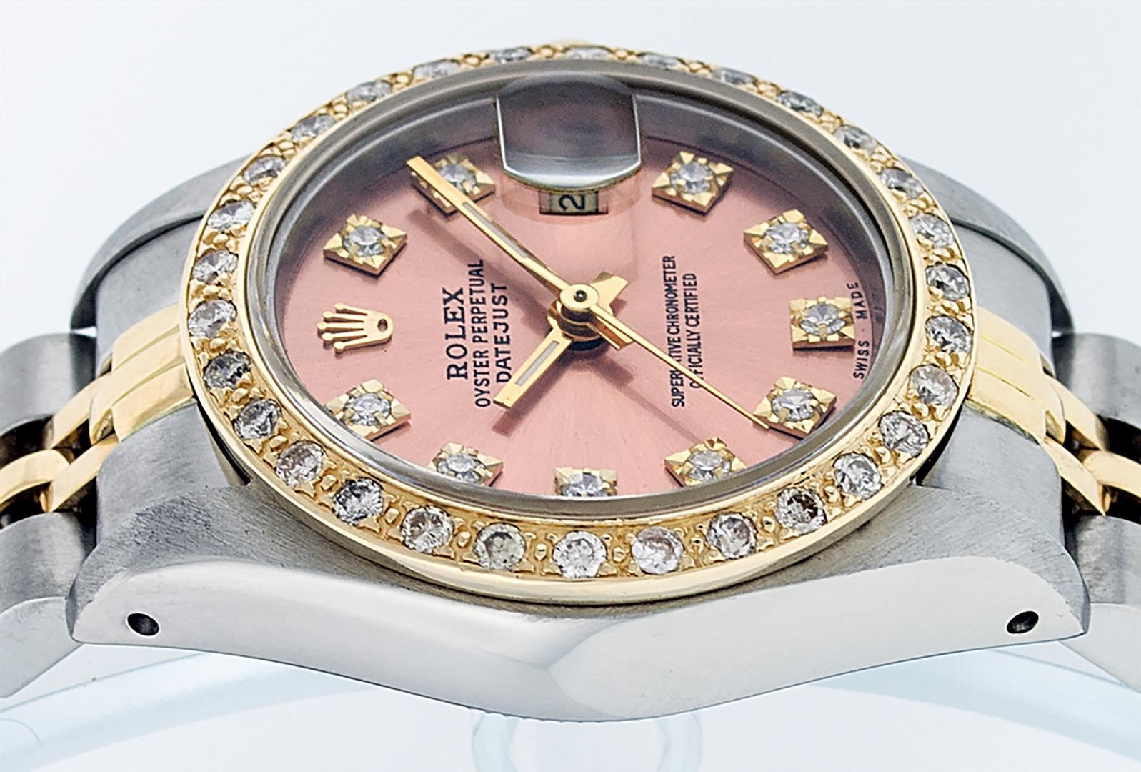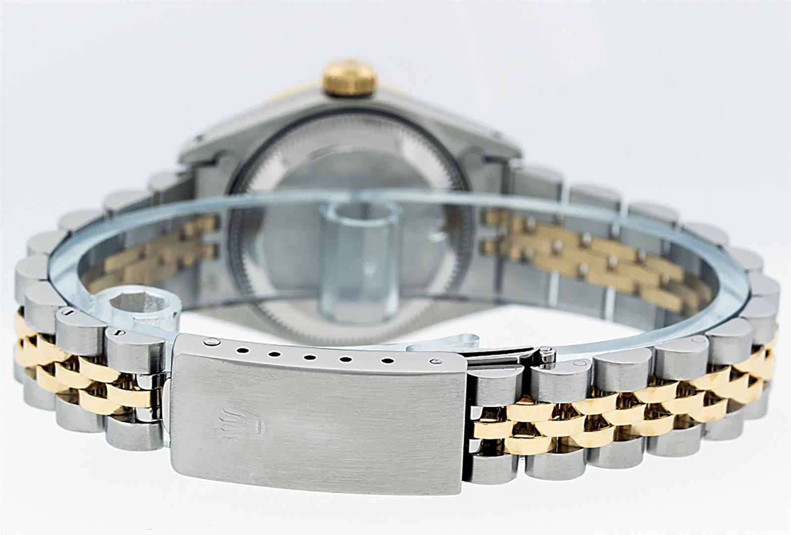 One Ladies Pre Owned Two Tone Rolex Datejust Polished, Serviced & Electronically Tested, Yellow Gold & Stainless Steel Case: 26mm, Yellow Gold Crown, Custom Bezel: New 18K Yellow Gold Beadset Diamond Bezel, Diamond Count: 32 Diamonds On Bezel, Clarity: SI