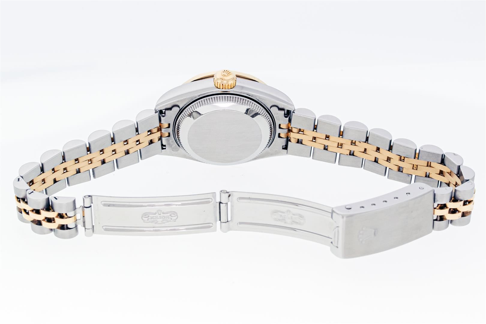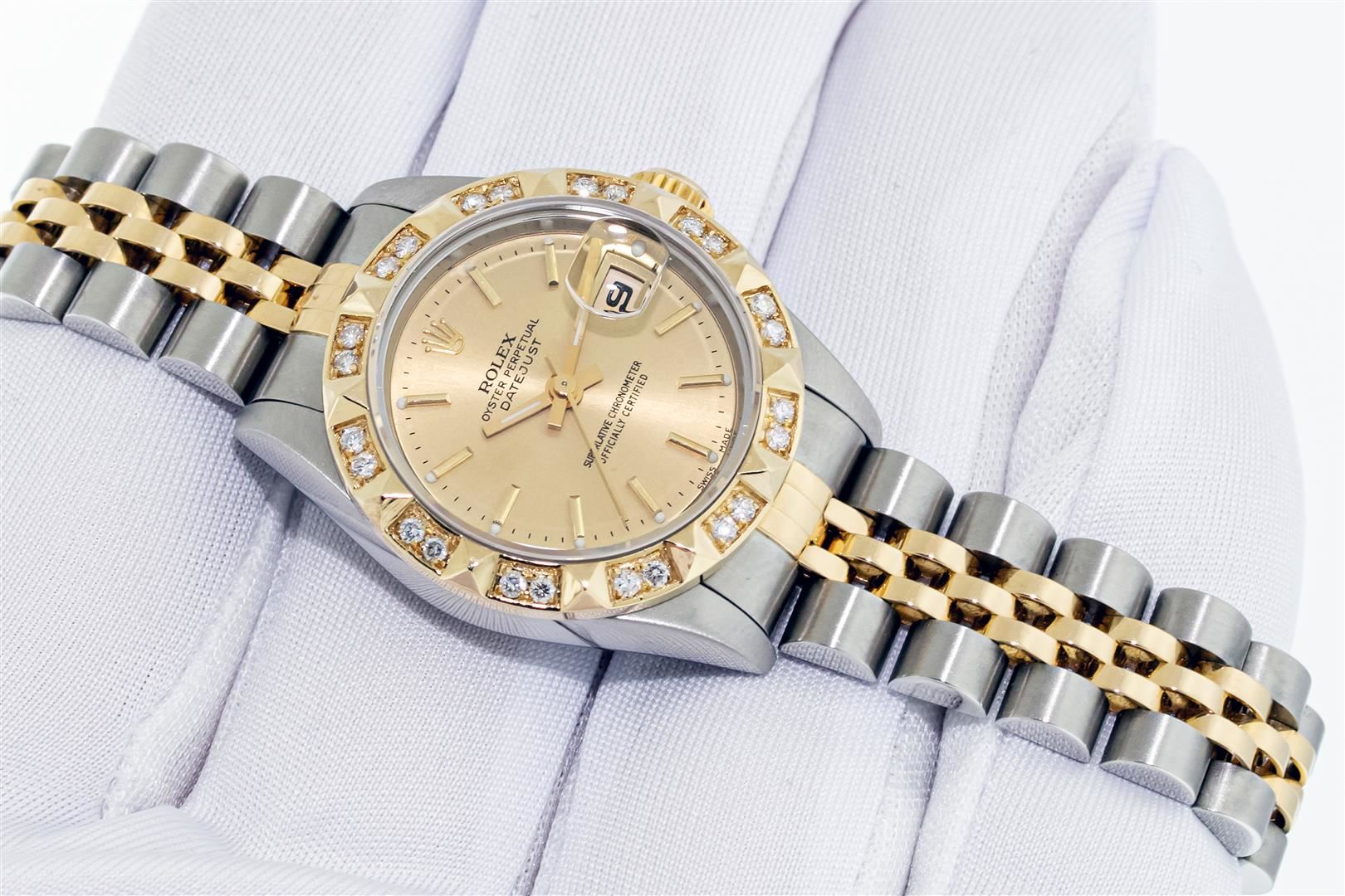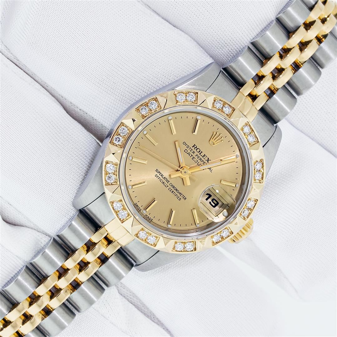Rolex Ladies Pre Owned Sapphire Quickset 18K Yellow Gold and Stainless Steel Two Tone Datejust Polished Bright with Satin Finish, Serviced & Electronically Tested, Rolex Stainless Steel Case: 26mm, Rolex 18K Yellow Gold Crown, Custom Bezel: New Pyramid Diamond Bezel, Diamond Count: 24 Diamonds On Bezel. Custom Crystal: New Sapphire With Magnified Date Window. Custom Hands: New Hands. Rolex Movement: Automatic Winding Movement 2235. Rolex Dial: Champagne With Index Hour Markers And Dash Track. Date Window: 3 O'Clock Position Date Display, Model: Quickset Datejust, Condition: G-6 Extra Fine. Rolex Bracelet: 18K Yellow Gold & Stainless Steel Jubilee Band. Bright Polish & Satin Finish. 6.0 Inch Length, Adjustable. Standard Clasp, With Rolex Logo. This Watch Has Been Serviced Time Tested And Is In Excellent Condition It Is Free Of All Scratches And Dents.