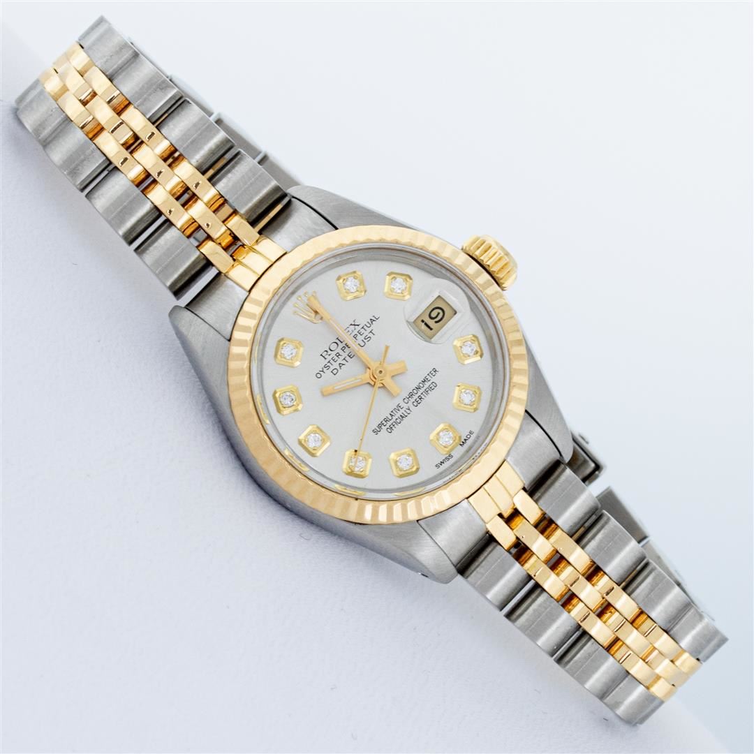One Ladies Two Tone Rolex Datejust Polished, Serviced & Electronically Tested, Yellow Gold & Stainless Steel Case: 26mm, Yellow Gold Crown, Bezel: Yellow Gold Fluted Bezel. Custom Crystal: New Acrylic Cyclops Lens. Custom Hands: New Luminescent Hands. Movement: Automatic Winding Movement. Custom Dial: Silver With Diamond Hour Markers, Diamond Count: 10 Diamonds, Color: G to H, Clarity: VS2-SI1. Date Window: 3 O'Clock Position Date Display, Model: Datejust. Condition: G-6 Extra Fine. Bracelet: Two Tone Yellow Gold & Stainless Steel Jubilee Band. Bright Polish. 6.0 Inch Length, Adjustable. Standard Clasp, With Rolex Logo. This Watch Has Been Serviced Time Tested And Is In Excellent Condition It Is Free Of All Scratches And Dents.