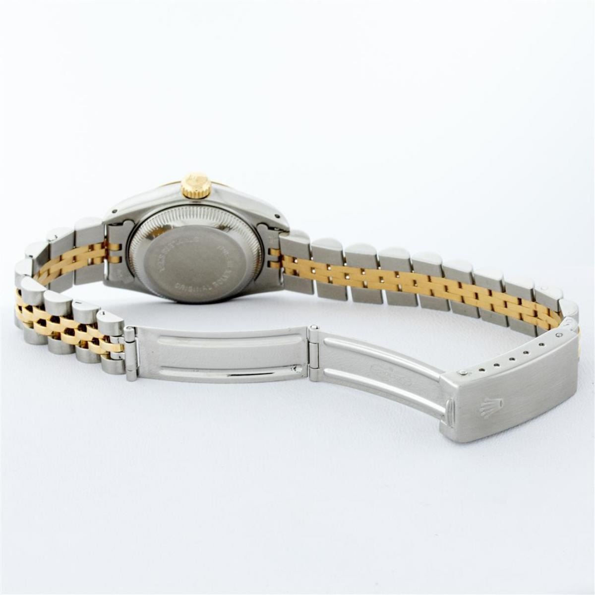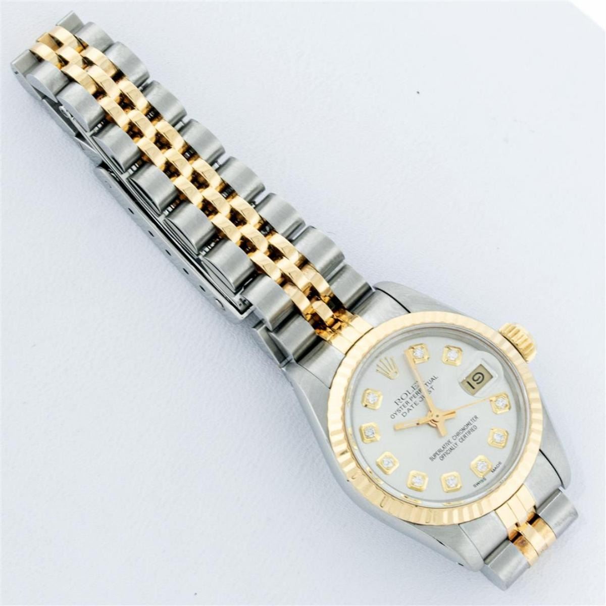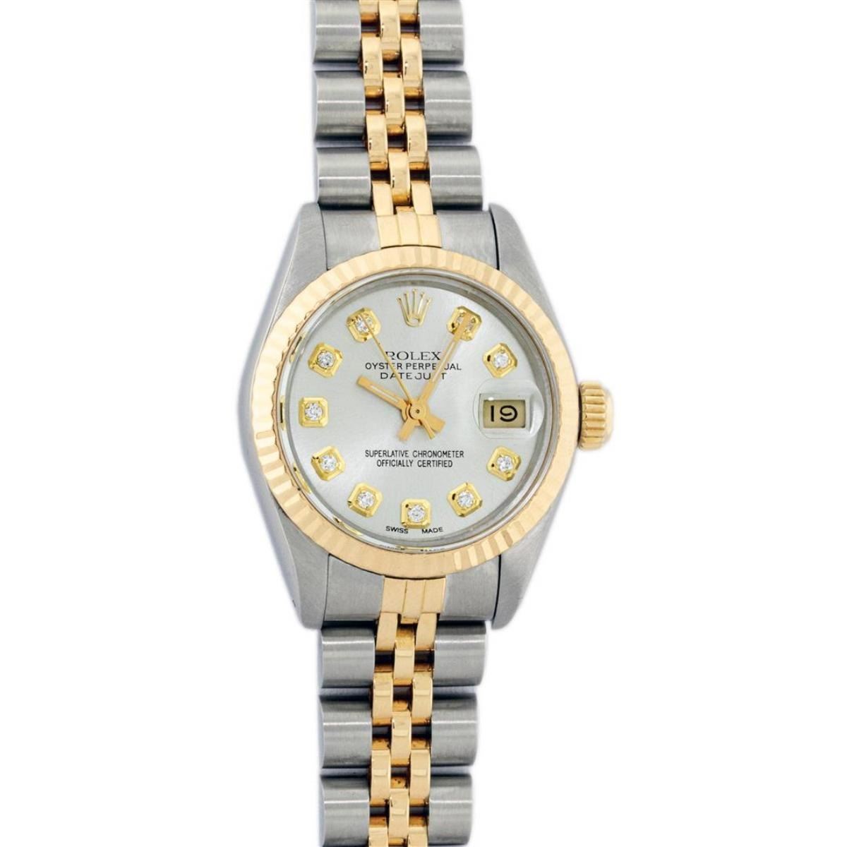 One Ladies Two Tone Rolex Datejust Polished, Serviced & Electronically Tested, Yellow Gold & Stainless Steel Case: 26mm, Yellow Gold Crown, Bezel: Yellow Gold Fluted Bezel. Custom Crystal: New Acrylic Cyclops Lens. Custom Hands: New Luminescent Hands. Movement: Automatic Winding Movement. Custom Dial: Silver With Diamond Hour Markers, Diamond Count: 10 Diamonds, Color: G to H, Clarity: VS2-SI1. Date Window: 3 O'Clock Position Date Display, Model: Datejust. Condition: G-6 Extra Fine. Bracelet: Two Tone Yellow Gold & Stainless Steel Jubilee Band. Bright Polish. 6.0 Inch Length, Adjustable. Standard Clasp, With Rolex Logo. This Watch Has Been Serviced Time Tested And Is In Excellent Condition It Is Free Of All Scratches And Dents.