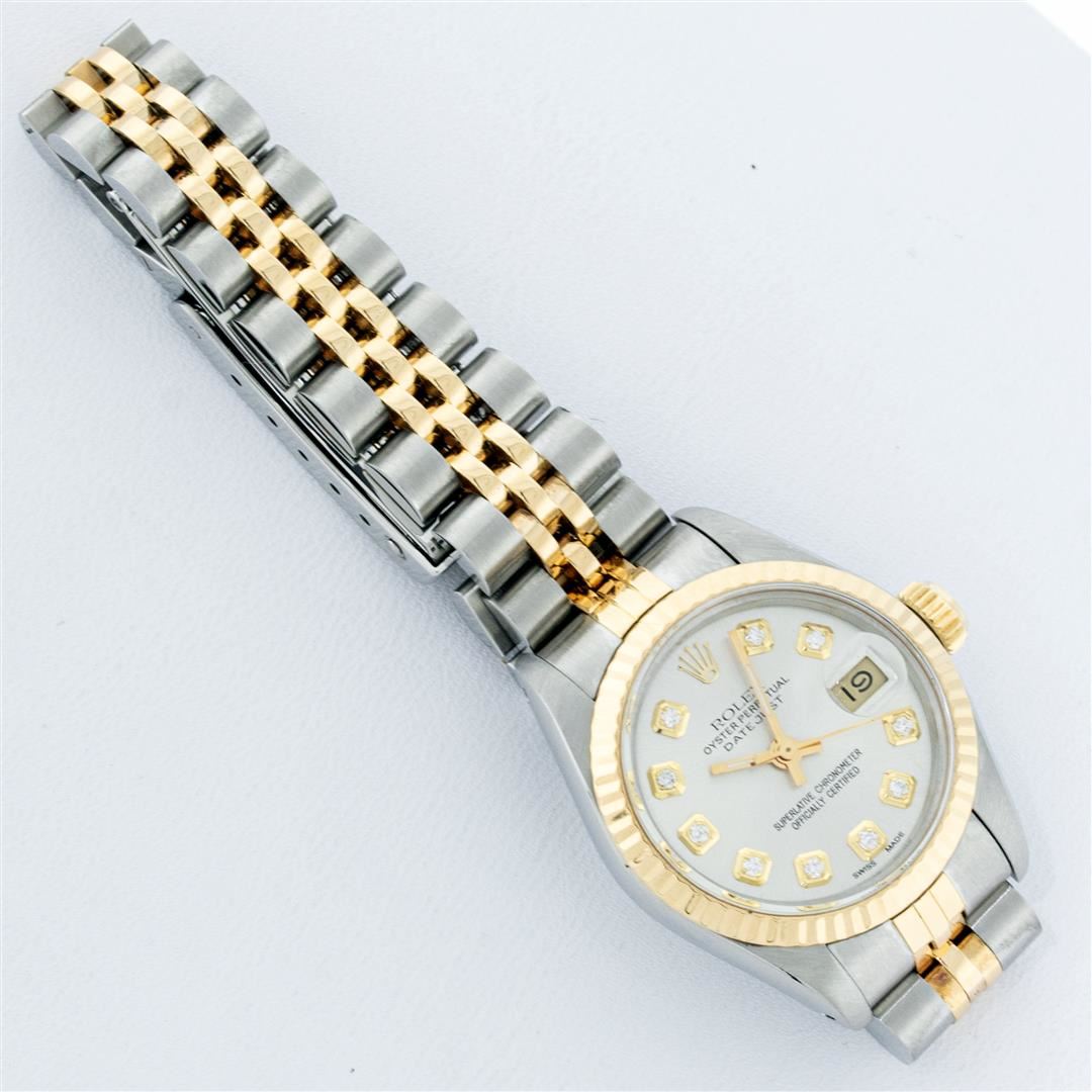 One Ladies Pre Owned Two Tone Rolex Datejust Polished, Serviced & Electronically Tested, Yellow Gold & Stainless Steel Case: 26mm, Yellow Gold Crown, Rolex Bezel: Yellow Gold Fluted Bezel. Custom Crystal: New Acrylic Cyclops Lens. Custom Hands: New Luminescent Hands. Rolex Movement: Automatic Winding Movement. Custom Dial: Refinished To Silver With Custom Added Diamond Hour Markers, Diamond Count: 10 Diamonds, Color: G to H, Clarity: VS2-SI1. Date Window: 3 O'Clock Position Date Display, Model: Datejust. Condition: G-6 Extra Fine. Rolex Bracelet: Two Tone Yellow Gold & Stainless Steel Jubilee Band. Bright Polish. 6.0 Inch Length, Adjustable. Standard Clasp, With Rolex Logo. This Watch Has Been Serviced Time Tested And Is In Excellent Condition It Is Free Of All Scratches And Dents.