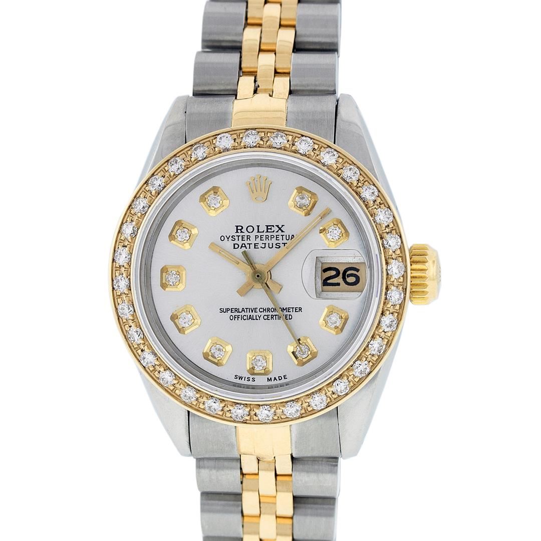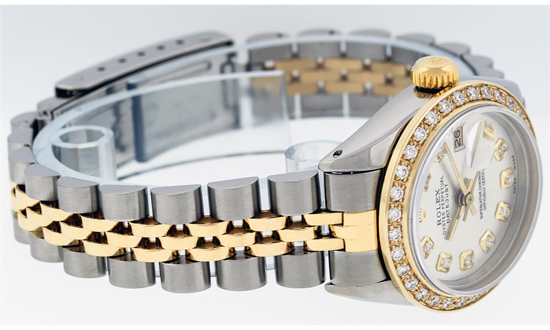 One Ladies Two Tone Rolex Datejust Polished, Serviced & Electronically Tested, Yellow Gold & Stainless Steel Case: 26mm, Yellow Gold Crown, Custom Bezel: 18K Yellow Gold Beadset Diamond Bezel, Diamond Count: 32 Diamonds Total Weight .70 Carat, Clarity: Si-VS, Color: G to H. Custom Crystal: Synthetic Sapphire Cyclops Lens. Custom Hands: New Luminescent Hands. Movement: Automatic Winding Movement. Custom Dial: Silver Dial Set With Diamond Hour Markers, 10 Diamond in Dial G To H In Color, Si-VS Clarity. Date Window: 3 O'Clock Position Date Display, Model: Datejust. Condition: G-6 Extra Fine. Bracelet: Two Tone Yellow Gold & Stainless Steel Jubilee. Bright Polish. 6.0 Inch Length, Adjustable. Standard Clasp, With Rolex Logo. This Watch Has Been Serviced Time Tested And Is In Excellent Condition It Is Free Of All Scratches And Dents.