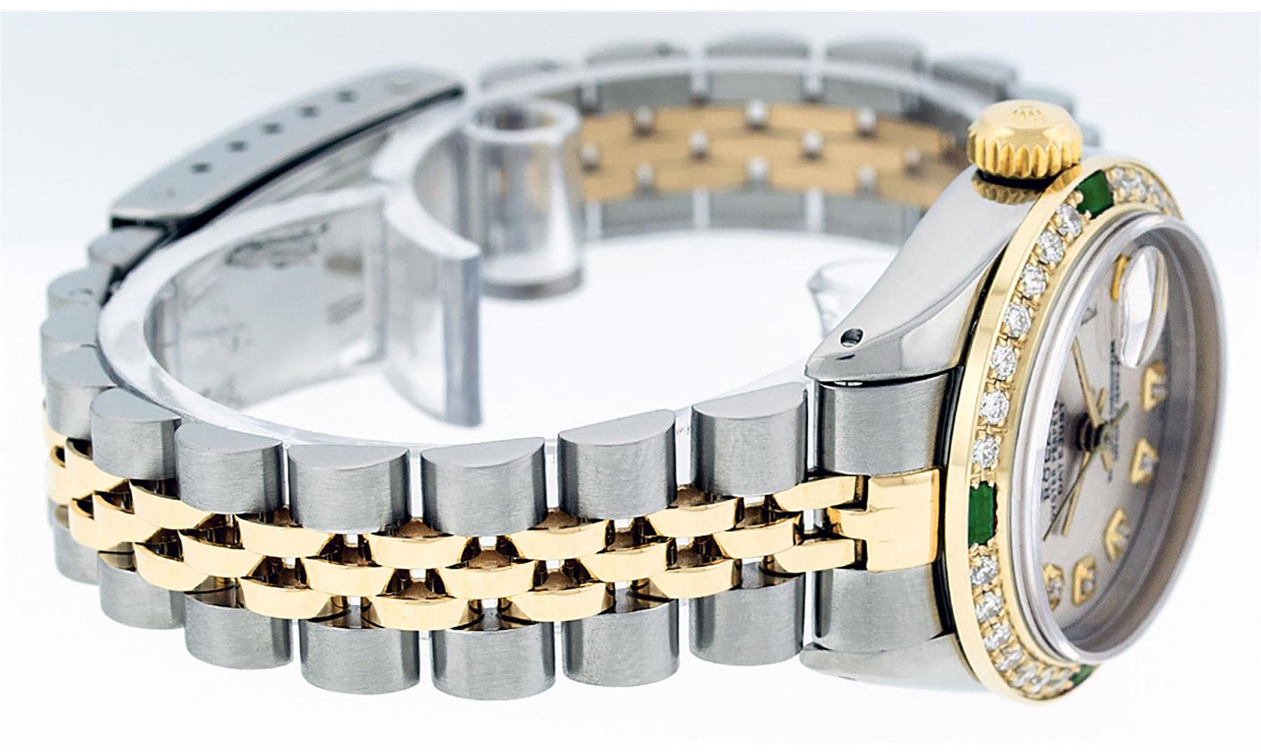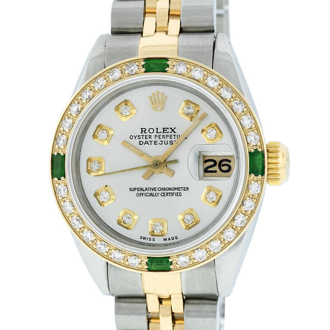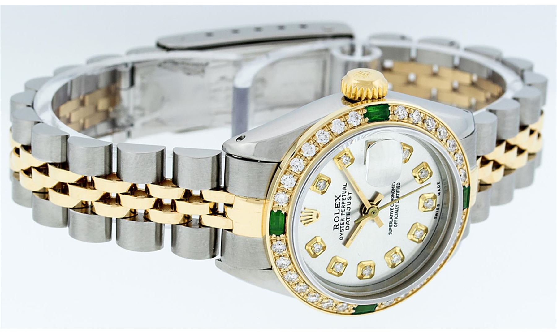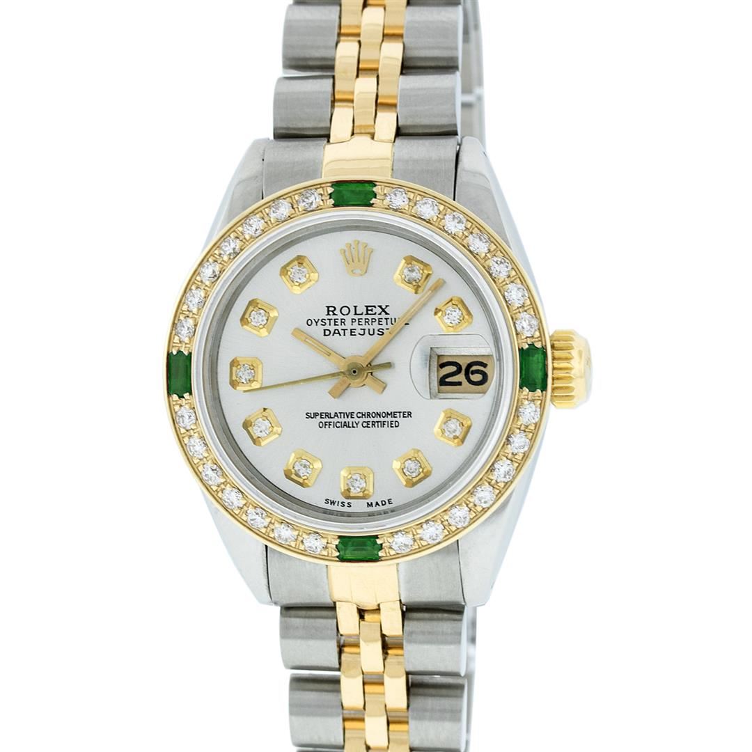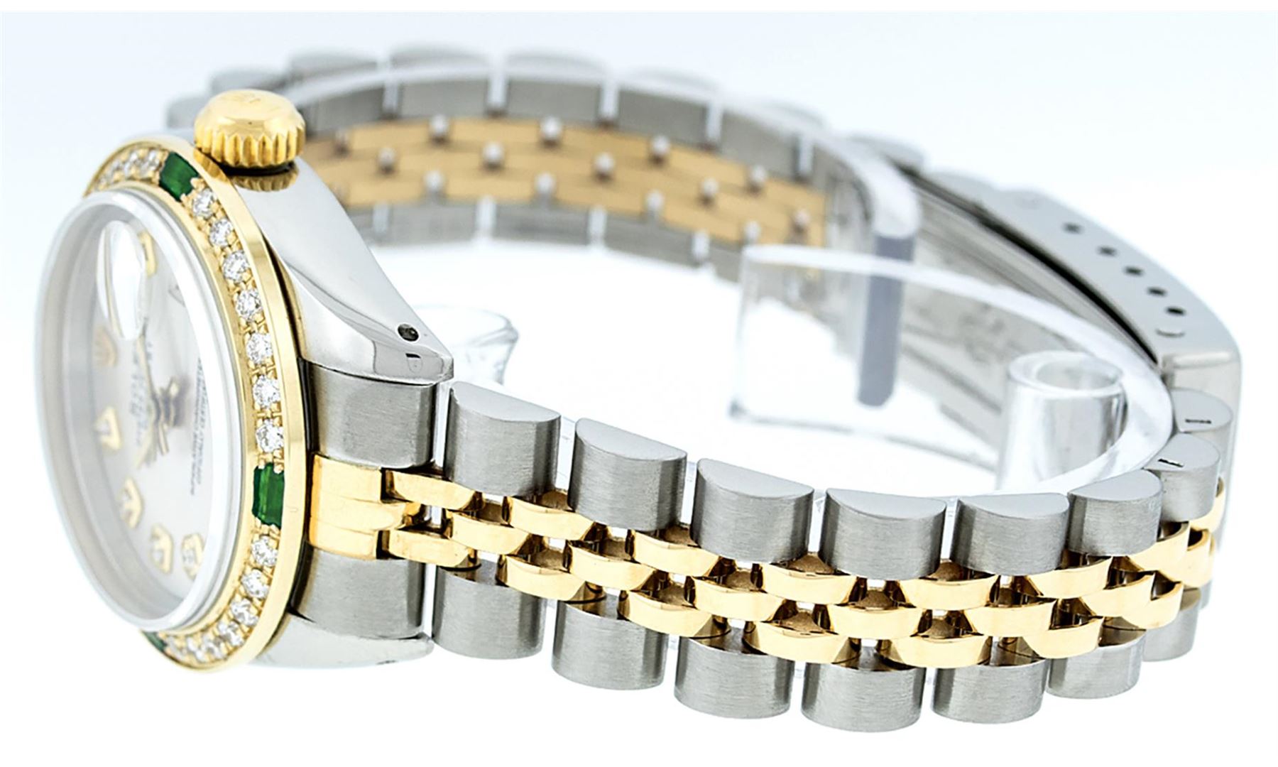 One Ladies Pre Owned Two Tone Rolex Datejust Polished, Serviced & Electronically Tested, Yellow Gold & Stainless Steel Case: 26mm, Yellow Gold Crown, Custom Bezel: New 18K Yellow Gold Emerald Beadset Diamond Bezel, Diamond + Gem Count: 28 Diamonds + 4 Eme