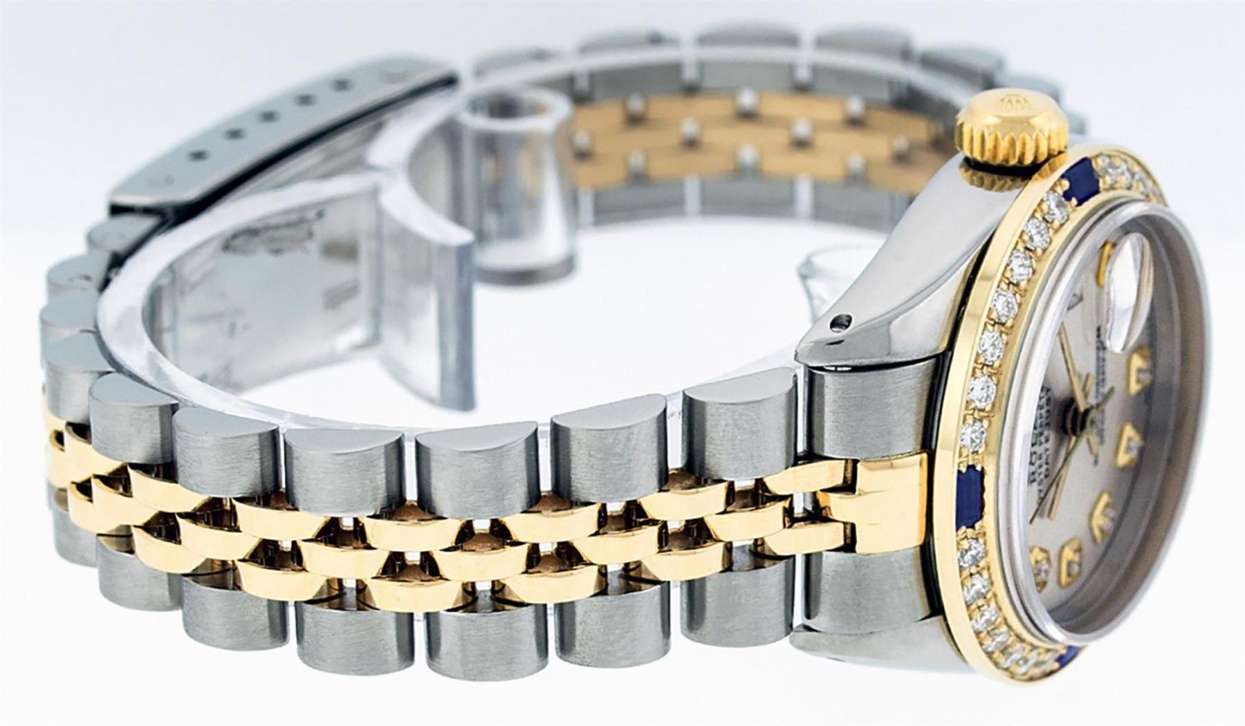 One Ladies Two Tone Rolex Datejust Polished, Serviced & Electronically Tested, Yellow Gold & Stainless Steel Case: 26mm, Yellow Gold Crown, Custom Bezel: New 18K Yellow Gold Sapphire Beadset Diamond Bezel, Diamond + Gem Count: 28 Diamonds + 4 Sapphires, Total Weight .70 Carat, Clarity: SI-VS, Color: G to H. Custom Crystal: New Scratch Resistant Synthetic Sapphire Cyclops Lens. Custom Hands: New Luminescent Hands. Movement: Automatic Winding Movement. Custom Dial: Silver Set With Diamond Hour Markers, Diamond Count: 10 Diamonds in Dial, G To H In Color, SI-VS Clarity. Date Window: 3 O'Clock Position Date Display, Model: Datejust, Condition: G-6 Extra Fine. Bracelet: Two Tone Yellow Gold & Stainless Steel Jubilee Band. Bright Polish. 6.0 Inch Length, Adjustable. Standard Clasp, With Rolex Logo. This Watch Has Been Serviced Time Tested And Is In Excellent Condition It Is Free Of All Scratches And Dents.