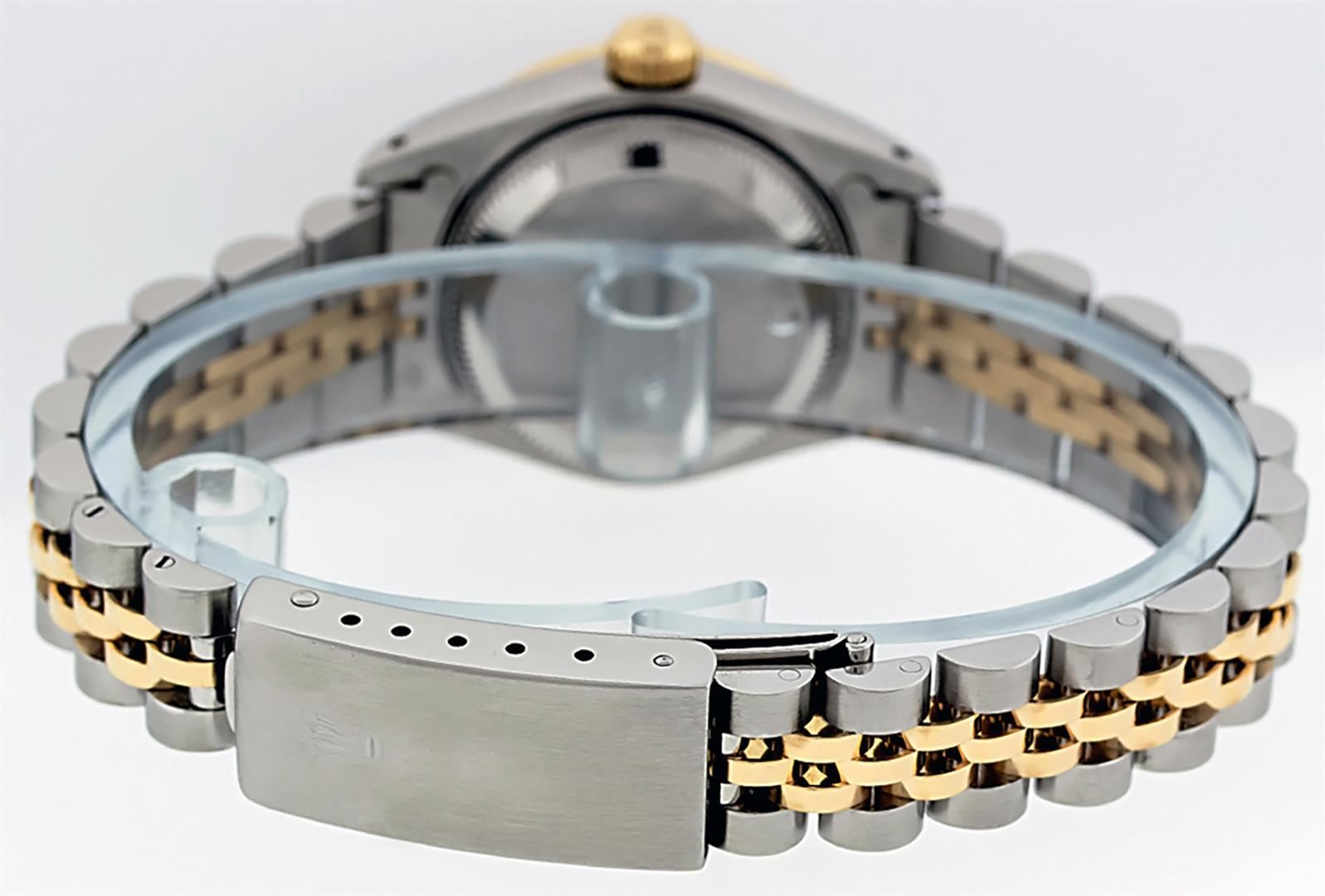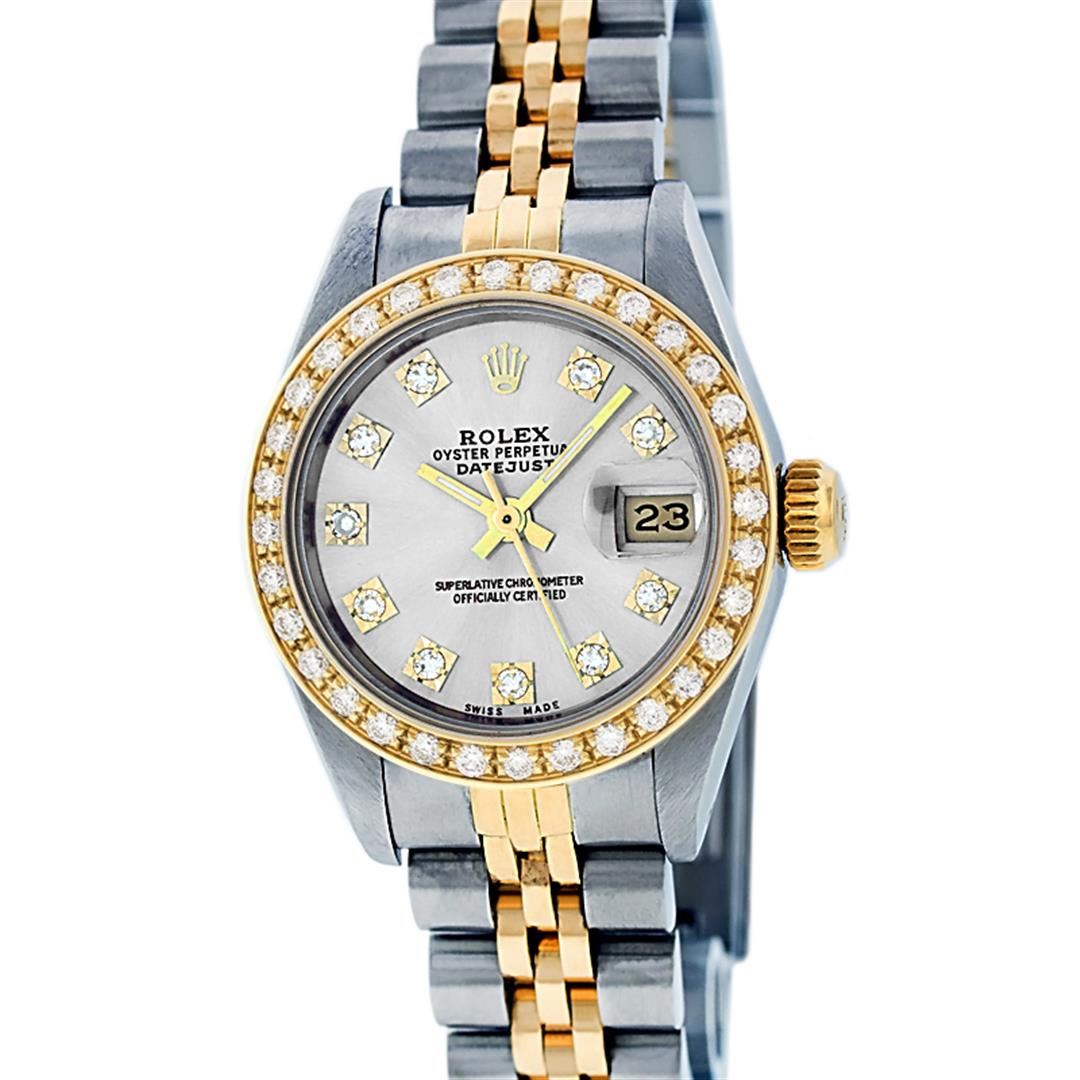One Ladies Pre Owned Two Tone Rolex Datejust Polished, Serviced & Electronically Tested, Yellow Gold & Stainless Steel Case: 26mm, Yellow Gold Crown, Custom Bezel: New 18K 1.0ctw Yellow Gold Beadset Diamond Bezel, Diamond Count: 32 Diamonds, Total Weight