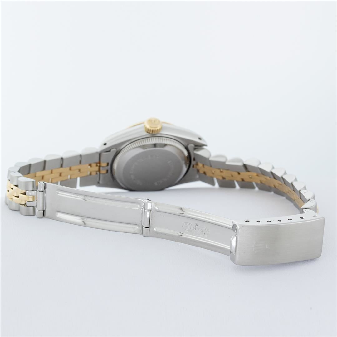 One Ladies Pre Owned Two Tone Rolex Datejust Polished, Serviced & Electronically Tested, Rolex Yellow Gold & Stainless Steel Case: 26mm, Rolex Yellow Gold Crown, Rolex Bezel: Yellow Gold Fluted Bezel. Custom Crystal: New Acrylic Cyclops Lens. Custom Hands: New Luminescent Hands. Rolex Movement: Automatic Winding Movement. Custom Dial: Refinish To Slate Grey With Diamond Hour Markers, Diamond Count: 10 Diamonds, Color: G to H, Clarity: VS2-SI1. Date Window: 3 O'Clock Position Date Display, Model: Datejust. Condition: G-6 Extra Fine. Rolex Bracelet: Two Tone Yellow Gold & Stainless Steel Jubilee Band. Bright Polish. 6.0 Inch Length, Adjustable. Standard Clasp, With Rolex Logo. This Watch Has Been Serviced Time Tested And Is In Excellent Condition It Is Free Of All Scratches And Dents.