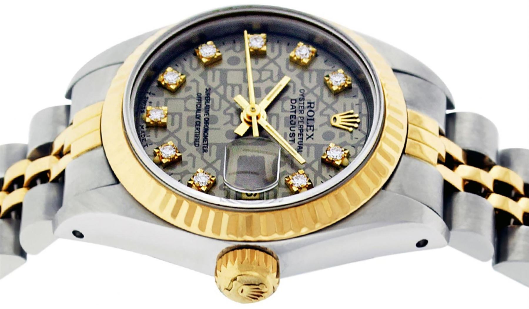 One Ladies Two Tone Rolex Datejust Polished, Serviced & Electronically Tested, Yellow Gold & Stainless Steel Case: 26mm, Yellow Gold Crown, Bezel: Yellow Gold Fluted Bezel. Custom Crystal: New Acrylic Cyclops Lens. Custom Hands: New Luminescent Hands. Movement: Automatic Winding Movement. Custom Dial: Slate Grey Jubilee With Single Cut Diamond Hour Markers, Diamond Count: 10 Diamonds On Dial, Color: G to H, Clarity: VS2-SI1. Date Window: 3 O'Clock Position Date Display, Model: Datejust. Condition: G-6 Extra Fine. Bracelet: Two Tone Yellow Gold & Stainless Steel Jubilee. Bright Polish. 6.0 Inch Length, Adjustable. Standard Clasp, With Rolex Logo. This Watch Has Been Serviced Time Tested And Is In Excellent Condition It Is Free Of All Scratches And Dents.