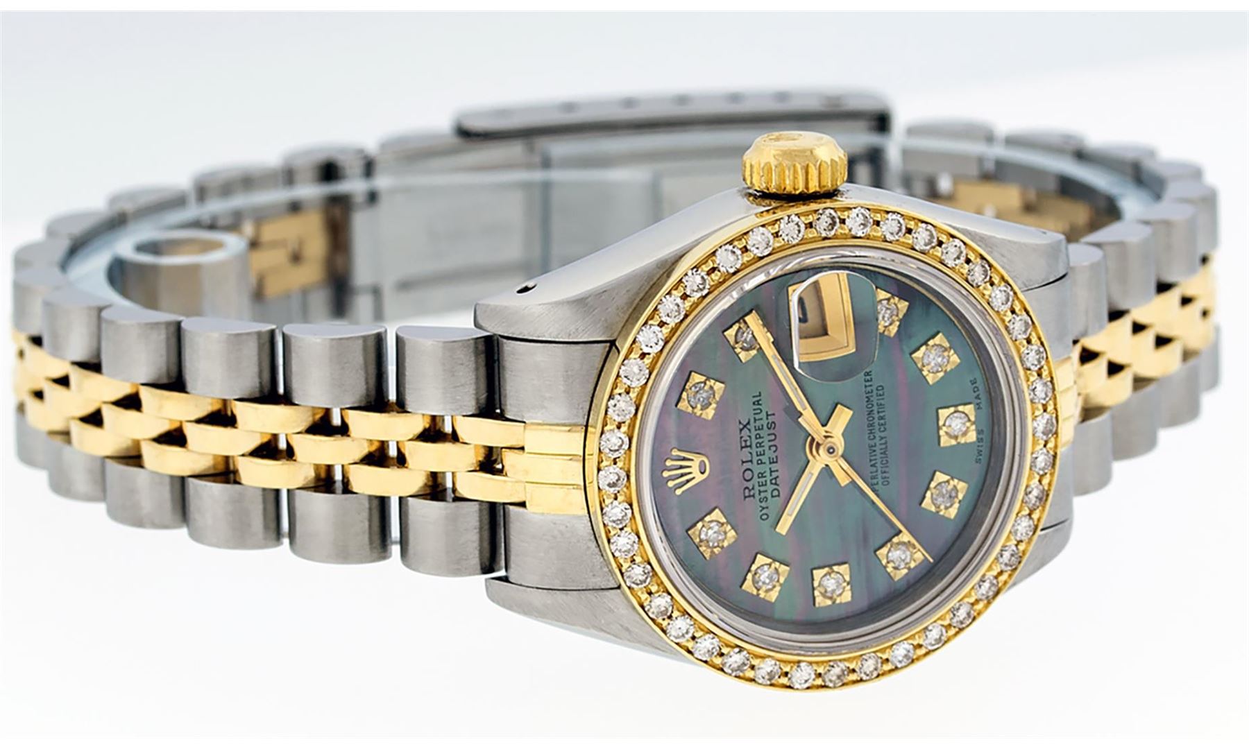 One Ladies Pre Owned Two Tone Rolex Datejust Polished, Serviced & Electronically Tested, Yellow Gold & Stainless Steel Case: 26mm, Yellow Gold Crown, Custom Bezel: New 18K Yellow Gold Beadset Diamond Bezel, Diamond Count: 32 Diamonds On Bezel, Clarity: SI-VS, Color: G to H. Custom Crystal: New Sapphire With Date Window. Custom Hands: New Luminescent Hands. Rolex Movement: Automatic Winding Movement. Custom Dial: Tahitian MOP With Single Cut Diamond Hour Markers, 10 Diamonds In Dial, G To H In Color, SI-VS Clarity. Date Window: 3 Oclock Position Date Display, Model: Datejust. Condition: G-6 Extra Fine. Rolex Bracelet: Two Tone Yellow Gold & Stainless Steel Jubilee Band. Bright Polish. 6.0 Inch Length, Adjustable. Standard Clasp, With Rolex Logo. This Watch Has Been Serviced Time Tested And Is In Excellent Condition It Is Free Of All Scratches And Dents.