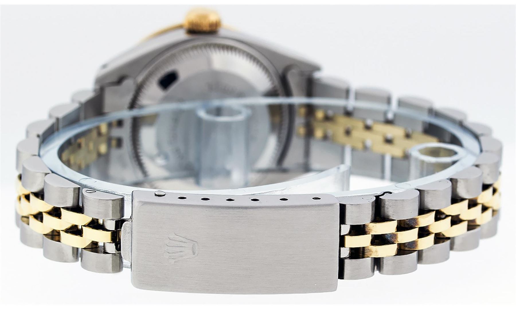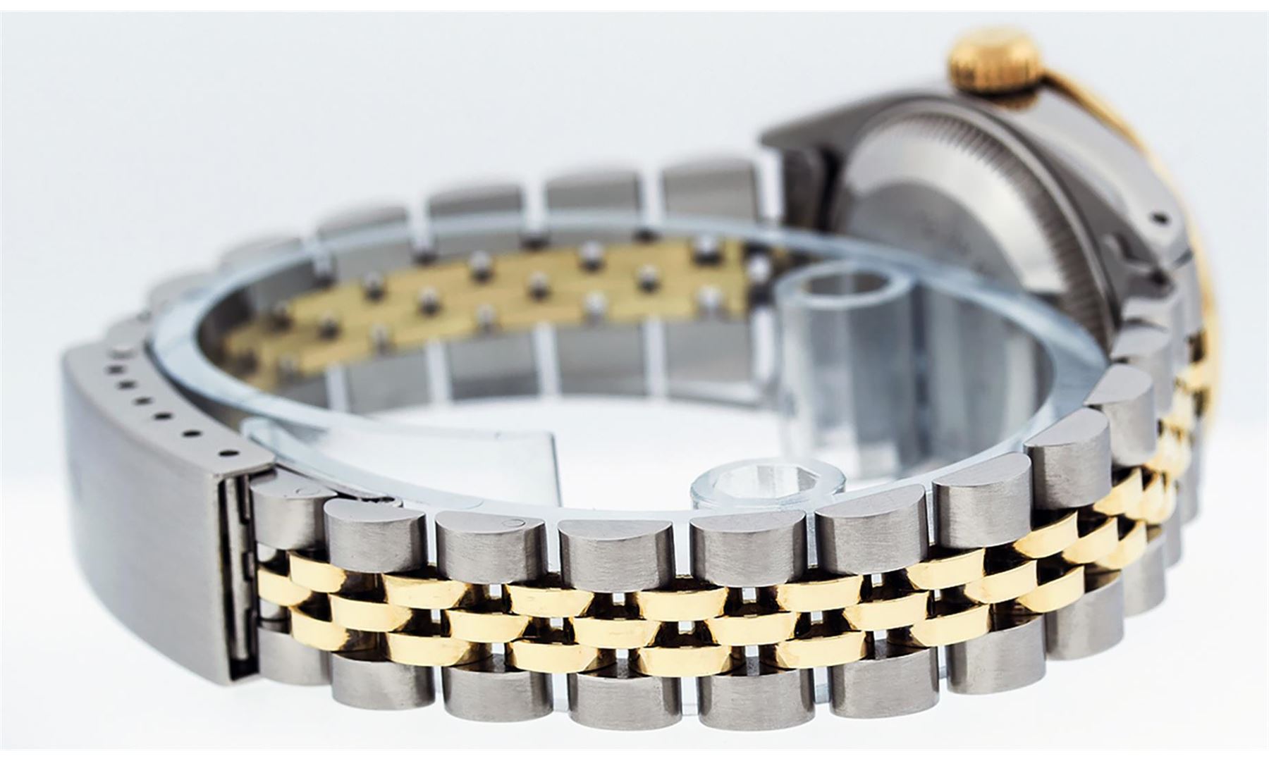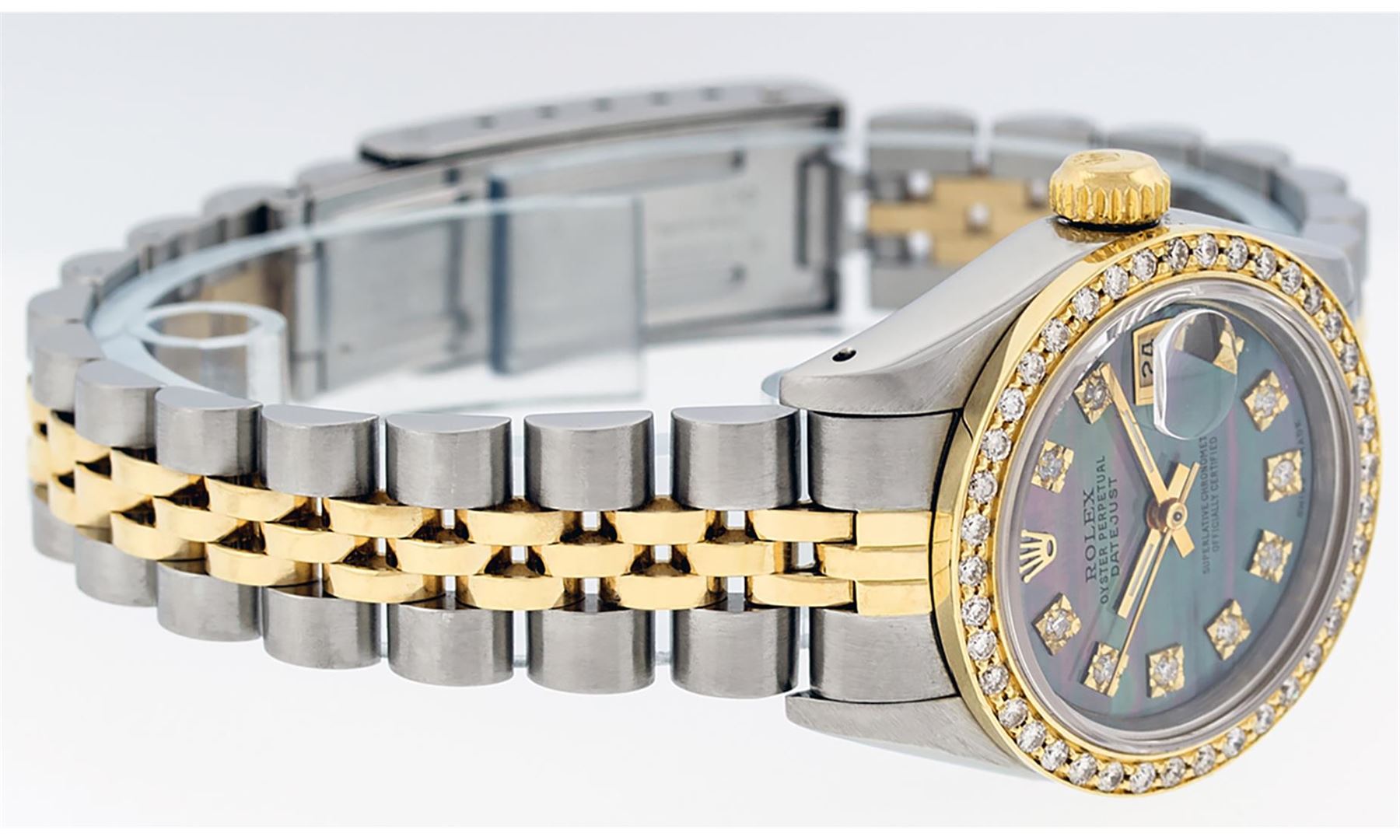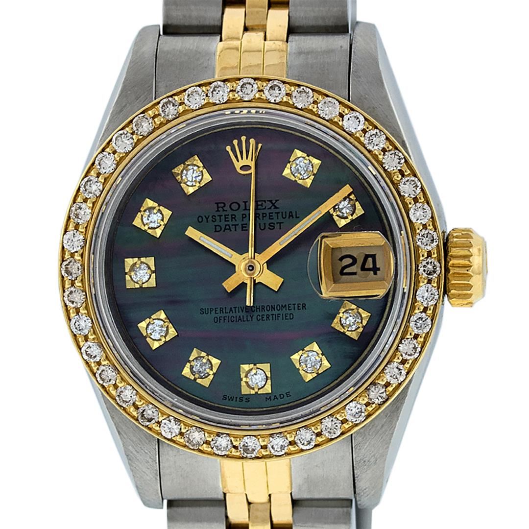 One Ladies Pre Owned Two Tone Rolex Datejust Polished, Serviced & Electronically Tested, Yellow Gold & Stainless Steel Case: 26mm, Yellow Gold Crown, Custom Bezel: New 18K Yellow Gold Beadset Diamond Bezel, Diamond Count: 32 Diamonds On Bezel, Clarity: SI-VS, Color: G to H. Custom Crystal: New Sapphire With Date Window. Custom Hands: New Luminescent Hands. Rolex Movement: Automatic Winding Movement. Custom Dial: Tahitian MOP With Single Cut Diamond Hour Markers, 10 Diamonds In Dial, G To H In Color, SI-VS Clarity. Date Window: 3 Oclock Position Date Display, Model: Datejust. Condition: G-6 Extra Fine. Rolex Bracelet: Two Tone Yellow Gold & Stainless Steel Jubilee Band. Bright Polish. 6.0 Inch Length, Adjustable. Standard Clasp, With Rolex Logo. This Watch Has Been Serviced Time Tested And Is In Excellent Condition It Is Free Of All Scratches And Dents.