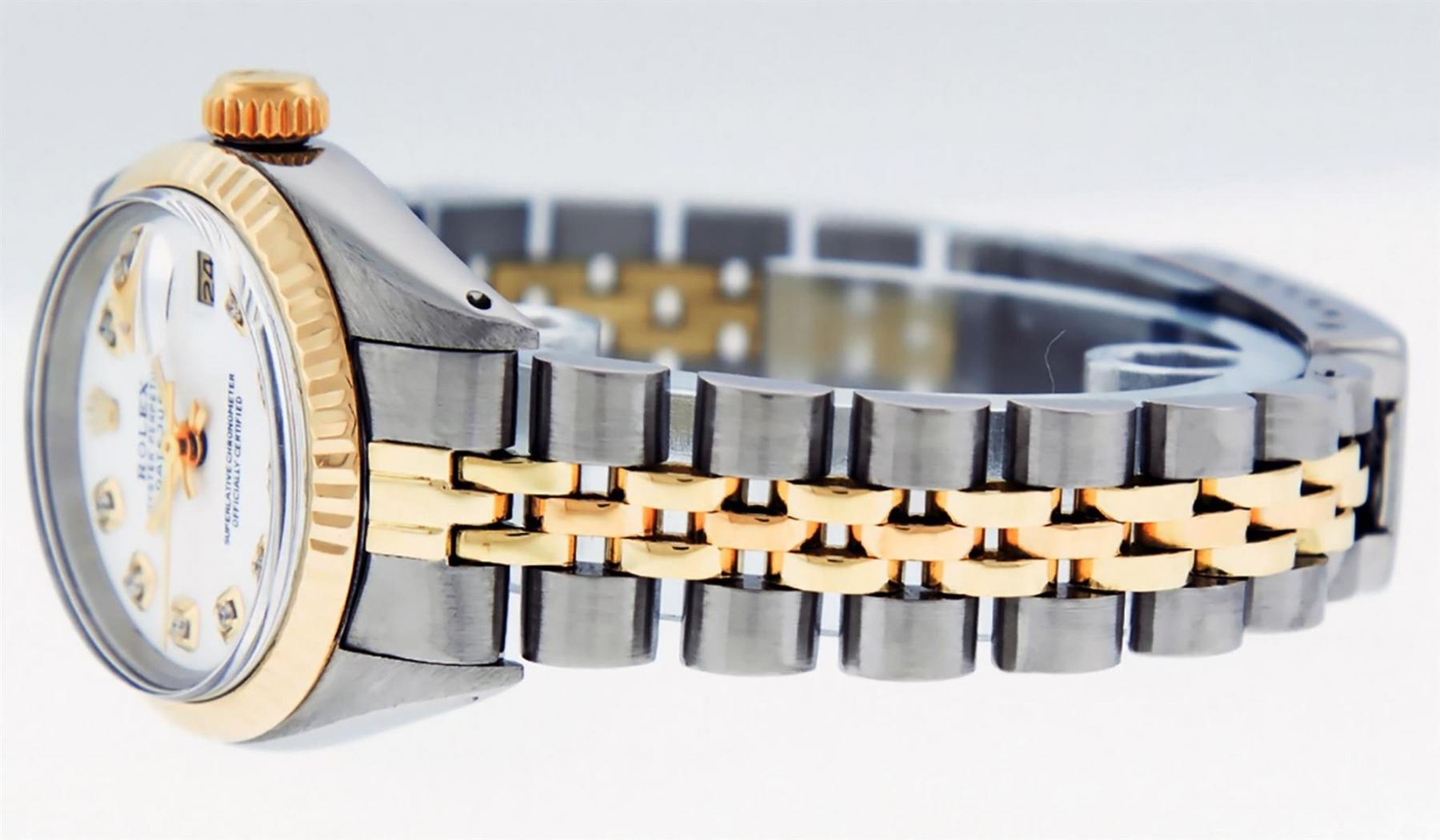 One Ladies Two Tone Rolex Datejust Polished, Serviced & Electronically Tested, Yellow Gold & Stainless Steel Case: 26mm, Yellow Gold Crown, Bezel: Yellow Gold Fluted Bezel. Custom Crystal: New Acrylic Cyclops Lens. Custom Hands: New Luminescent Hands. Movement: Automatic Winding Movement. Custom Dial: Mother Of Pearl With Diamond Hour Markers, Diamond Count: 10 Diamonds, Color: G to H, Clarity: VS2-SI1. Date Window: 3 O'Clock Position Date Display, Model: Datejust. Condition: G-6 Extra Fine. Bracelet: Two Tone Yellow Gold & Stainless Steel Jubilee. Bright Polish. 6.0 Inch Length, Adjustable. Standard Clasp, With Rolex Logo. This Watch Has Been Serviced Time Tested And Is In Excellent Condition It Is Free Of All Scratches And Dents.