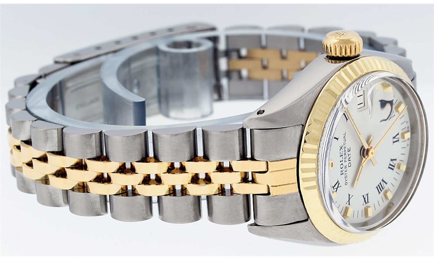 One Ladies Pre Owned Two Tone Yellow Gold And Stainless Steel Rolex Datejust Polished, Serviced & Electronically Tested, Rolex Yellow Gold & Stainless Steel Case: 26mm, Rolex Yellow Gold Crown, Rolex Bezel: Yellow Gold Fluted Bezel. Custom Crystal: New Acrylic Cyclops Lens. Hands: Luminescent Hands. Rolex Movement: Automatic Winding Movement. Rolex Dial: White Index With Dash Track & Lumi Dots. Date Window: 3 O'Clock Position Date Display, Model: Datejust. Condition: G-6 Extra Fine. Rolex Bracelet: Two Tone Yellow Gold & Stainless Steel Jubilee Band. Bright Polish. 6.0 Inch Length, Adjustable. Standard Clasp, With Rolex Logo. This Watch Has Been Serviced Time Tested And Is In Excellent Condition It Is Free Of All Scratches And Dents.