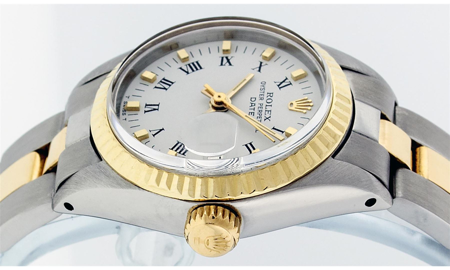 One Ladies Pre Owned Two Tone 14K Yellow Gold & Stainless Steel Rolex Polished, Serviced & Electronically Tested, Rolex 14K Yellow Gold & Stainless Steel Case: 26mm, Rolex Yellow Gold Crown, Rolex Bezel: 14K Yellow Gold Fluted Bezel. Custom Crystal: New Plexiglass With Date Window. Hands: Luminescent Hands. Rolex Movement: Automatic Winding Movement 2030. Rolex Dial: White With Dash Track & Lumi Dots. Date Window: 3 O'Clock Position Date Display, Model: Datejust. Condition: G-6 Extra Fine. Rolex Bracelet: Two Tone 14K Yellow Gold & Stainless Steel Oyster Band. Bright Polish. 6.0 Inch Length, Adjustable. Standard Clasp, With Rolex Logo. This Watch Has Been Serviced Time Tested And Is In Excellent Condition It Is Free Of All Scratches And Dents.