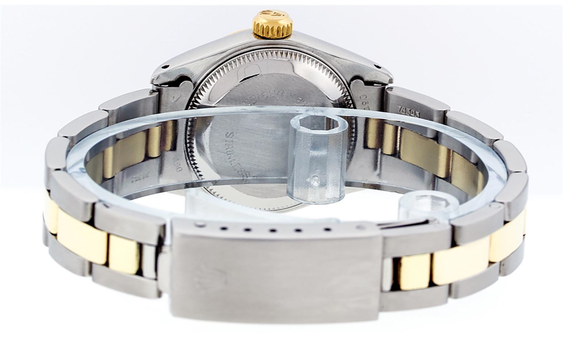 One Ladies Pre Owned Two Tone 14K Yellow Gold & Stainless Steel Rolex Polished, Serviced & Electronically Tested, Rolex 14K Yellow Gold & Stainless Steel Case: 26mm, Rolex Yellow Gold Crown, Rolex Bezel: 14K Yellow Gold Fluted Bezel. Custom Crystal: New Plexiglass With Date Window. Hands: Luminescent Hands. Rolex Movement: Automatic Winding Movement 2030. Rolex Dial: White With Dash Track & Lumi Dots. Date Window: 3 O'Clock Position Date Display, Model: Datejust. Condition: G-6 Extra Fine. Rolex Bracelet: Two Tone 14K Yellow Gold & Stainless Steel Oyster Band. Bright Polish. 6.0 Inch Length, Adjustable. Standard Clasp, With Rolex Logo. This Watch Has Been Serviced Time Tested And Is In Excellent Condition It Is Free Of All Scratches And Dents.