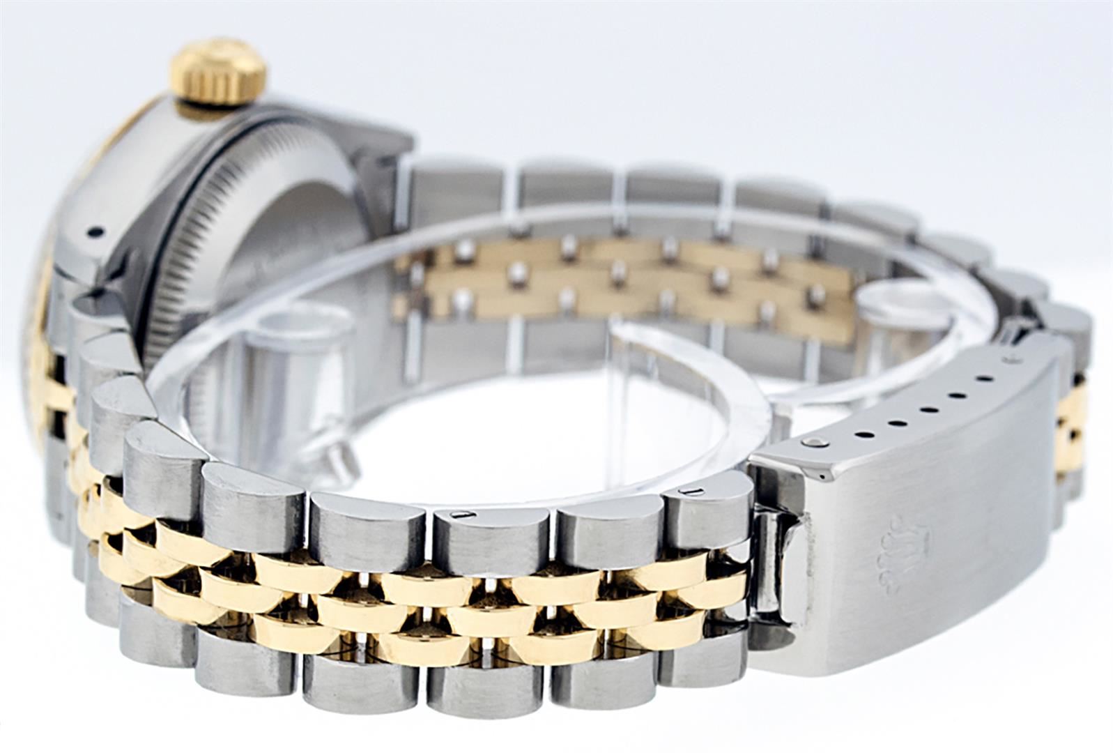 One Ladies Pre Owned Two Tone 14K Yellow Gold & Stainless Steel Rolex Polished, Serviced & Electronically Tested, Rolex 14K Yellow Gold & Stainless Steel Case: 26mm, Rolex Yellow Gold Crown, Rolex Bezel: 14K Yellow Gold Fluted Bezel. Custom Crystal: New Plexiglass With Date Window. Custom Hands: New Luminescent Hands. Rolex Movement: Automatic Winding Movement 2030. Custom Dial: Refinish To White Index With Dash Track & Lumi Dots. Date Window: 3 O'Clock Position Date Display, Model: Datejust. Condition: G-6 Extra Fine. Rolex Bracelet: Two Tone 14K Yellow Gold & Stainless Steel Jubilee Band. Bright Polish. 6.0 Inch Length, Adjustable. Standard Clasp, With Rolex Logo. This Watch Has Been Serviced Time Tested And Is In Excellent Condition It Is Free Of All Scratches And Dents.
