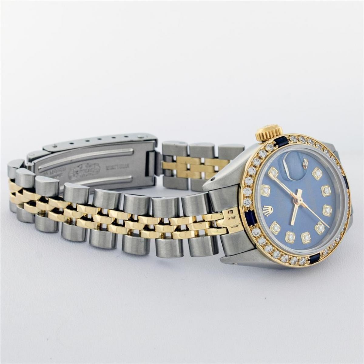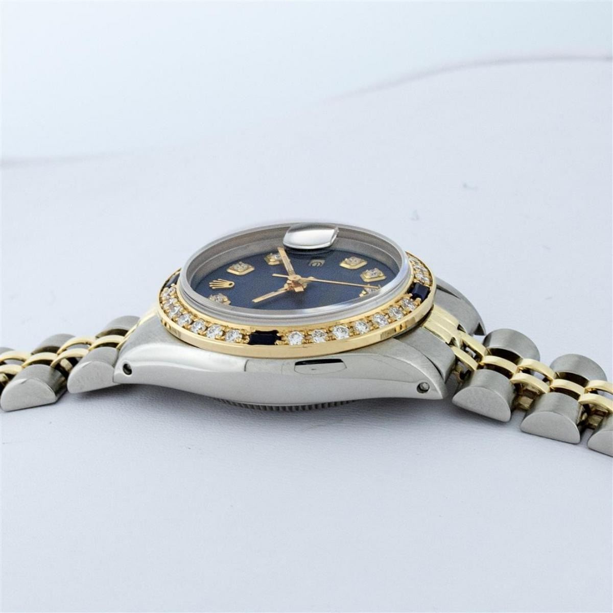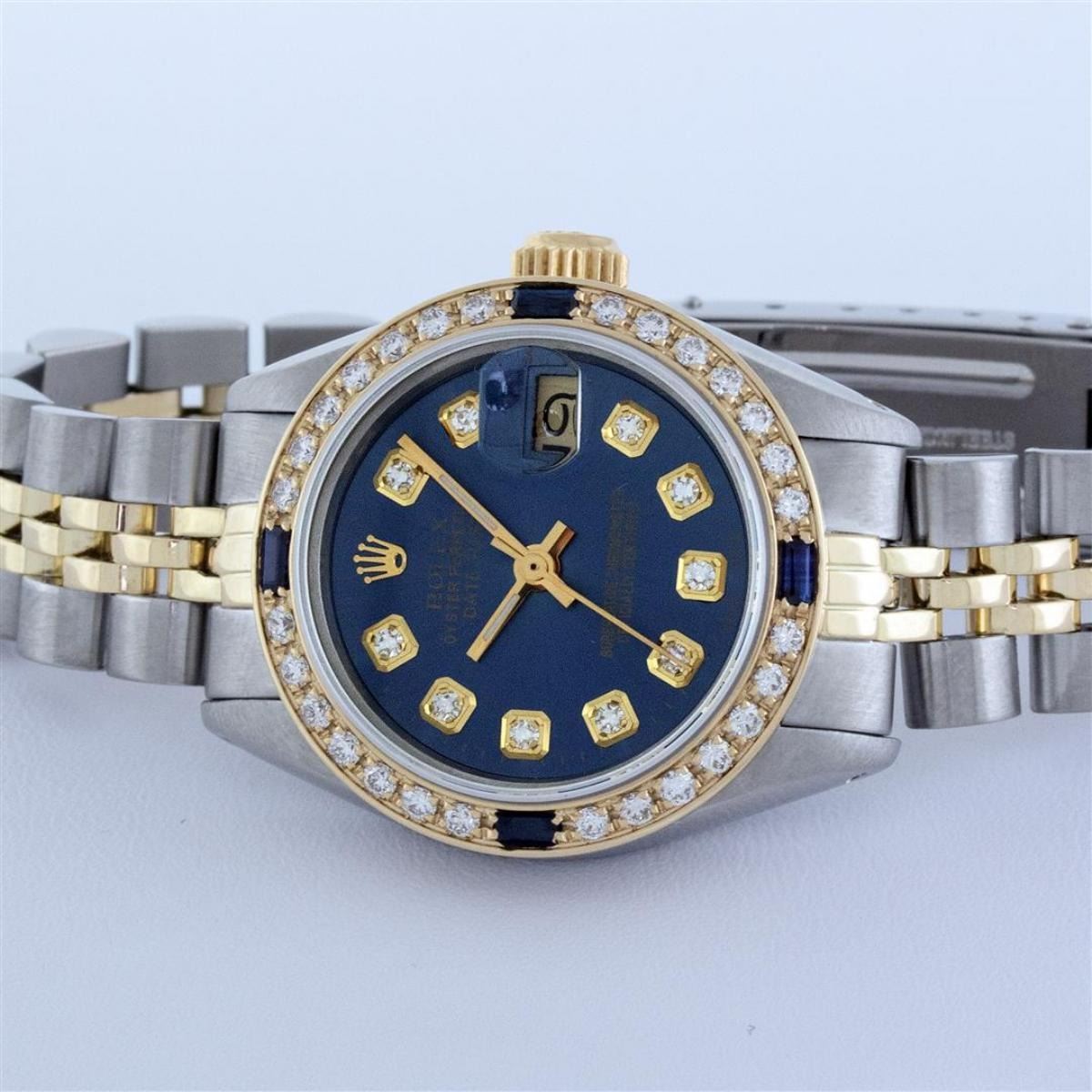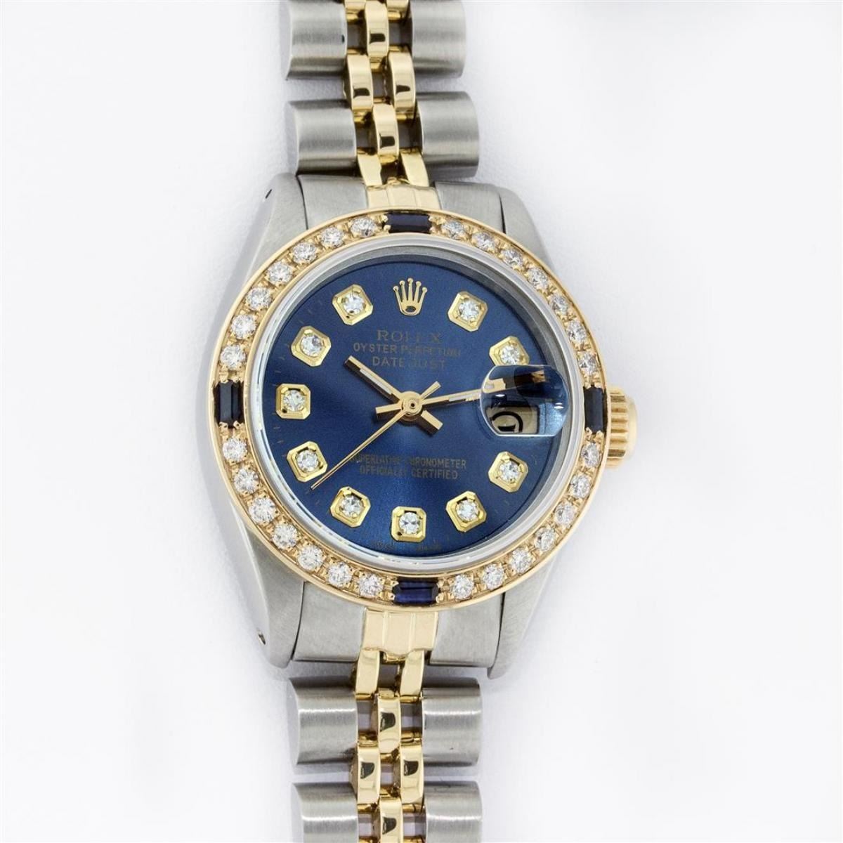 One Ladies Two Tone Rolex Oyster Perpetual Datejust Polished, Serviced & Electronically Tested, Yellow Gold & Stainless Steel Case: 26mm, Yellow Gold Crown, Custom Bezel: New 18K Yellow Gold Sapphire Beadset Diamond Bezel, Diamond + Gem Count: 28 Diamonds + 4 Sapphires Total Weight .70 Carat, Clarity: SI-VS, Color: G to H. Custom Crystal: New Scratch Resistant Synthetic Sapphire Cyclops Lens. Custom Hands: New Luminescent Hands. Movement: Automatic Winding Movement. Custom Dial: Blue Dial Set With Single Cut Diamond Hour Markers & Dash Track, Diamond Count: 10 Diamond in Dial, G To H In Color, SI-VS Clarity. Date Window: 3 O'Clock Position Date Display, Model: Datejust, Condition: G-6 Extra Fine. Bracelet: Two Tone Yellow Gold & Stainless Steel Jubilee Band. Bright Polish. 6.0 Inch Length, Adjustable. Standard Clasp, With Rolex Logo. This Watch Has Been Serviced Time Tested And Is In Excellent Condition It Is Free Of All Scratches And Dents.