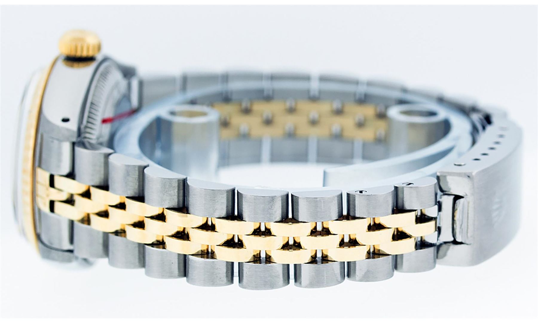 One Ladies Pre Owned Two Tone Yellow Gold And Stainless Steel Rolex Datejust Polished, Serviced & Electronically Tested, Rolex Yellow Gold & Stainless Steel Case: 26mm, Rolex Yellow Gold Crown, Rolex Bezel: Yellow Gold Fluted Bezel. Custom Crystal: New Crystal. Hands: Luminescent Hands. Rolex Movement: Automatic Winding Movement. Rolex Dial: Champagne Index With Roman Track & Lumi Dots. Date Window: 3 O'Clock Position Date Display, Model: Datejust. Condition: G-6 Extra Fine. Rolex Bracelet: Two Tone Yellow Gold & Stainless Steel Jubilee Band. Bright Polish. 6.0 Inch Length, Adjustable. Standard Clasp, With Rolex Logo. This Watch Has Been Serviced Time Tested And Is In Excellent Condition It Is Free Of All Scratches And Dents.