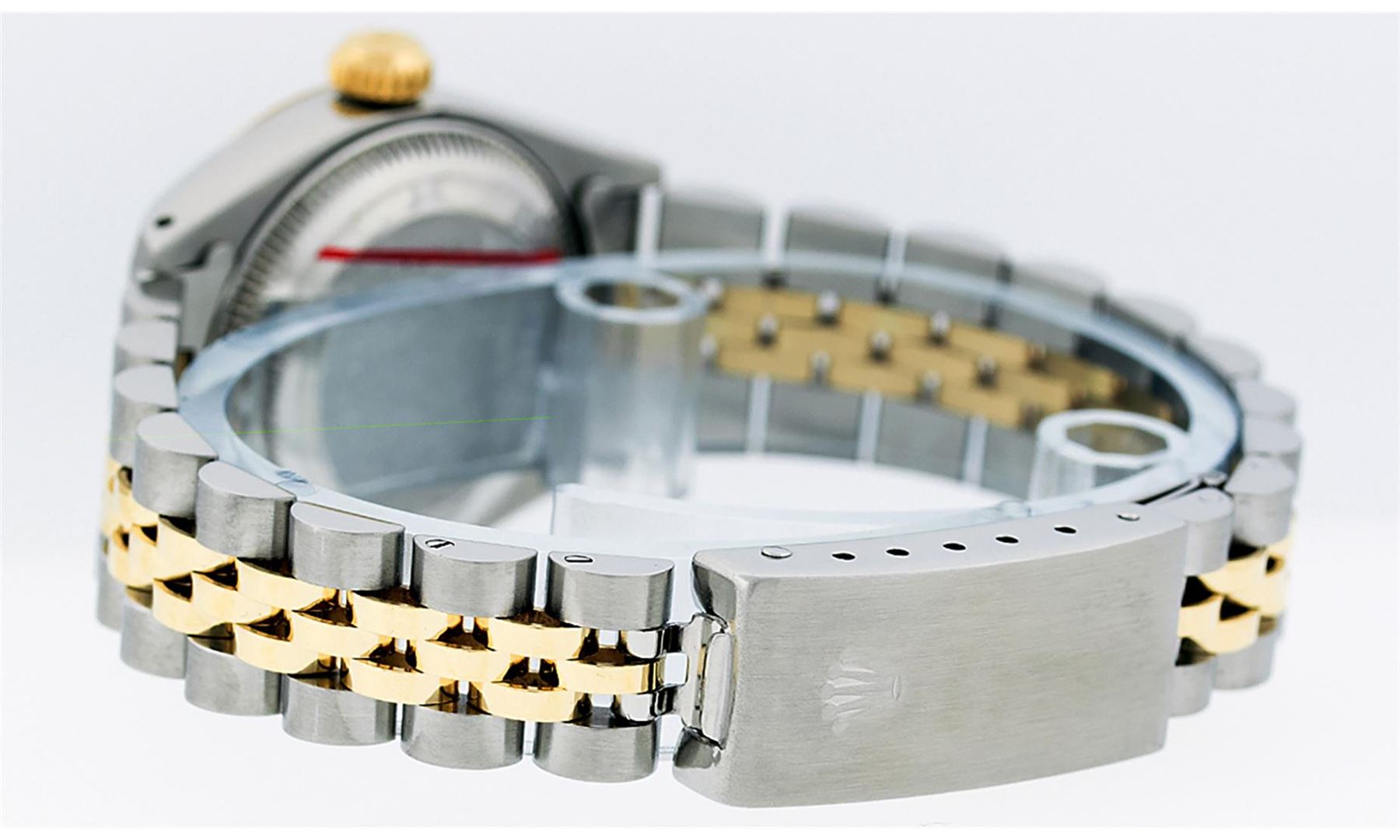 One Ladies Pre Owned Two Tone Yellow Gold And Stainless Steel Rolex Datejust Polished, Serviced & Electronically Tested, Rolex Yellow Gold & Stainless Steel Case: 26mm, Rolex Yellow Gold Crown, Rolex Bezel: Yellow Gold Fluted Bezel. Custom Crystal: New Crystal. Hands: Luminescent Hands. Rolex Movement: Automatic Winding Movement. Rolex Dial: Champagne Index With Roman Track & Lumi Dots. Date Window: 3 O'Clock Position Date Display, Model: Datejust. Condition: G-6 Extra Fine. Rolex Bracelet: Two Tone Yellow Gold & Stainless Steel Jubilee Band. Bright Polish. 6.0 Inch Length, Adjustable. Standard Clasp, With Rolex Logo. This Watch Has Been Serviced Time Tested And Is In Excellent Condition It Is Free Of All Scratches And Dents.