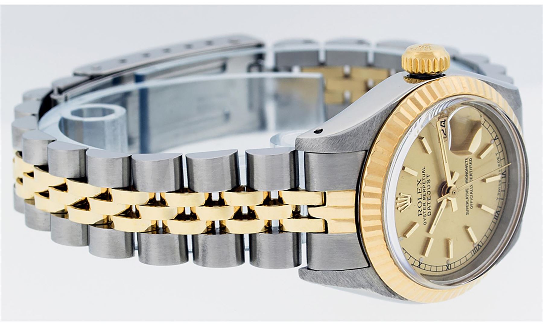 One Ladies Two Tone Rolex Datejust Polished, Serviced & Electronically Tested, Yellow Gold & Stainless Steel Case: 26mm, Yellow Gold Crown, Bezel: Yellow Gold Fluted Bezel. Custom Crystal: New Acrylic Cyclops Lens. Custom Hands: New Luminescent Hands. Movement: Automatic Winding Movement. Custom Dial: Refinished Champagne Index With Roman Track & Lumi Dots. Date Window: 3 O'Clock Position Date Display, Model: Datejust. Condition: G-6 Extra Fine. Bracelet: Two Tone Yellow Gold & Stainless Steel Jubilee Band. Bright Polish. 6.0 Inch Length, Adjustable. Standard Clasp, With Rolex Logo. This Watch Has Been Serviced Time Tested And Is In Excellent Condition It Is Free Of All Scratches And Dents.