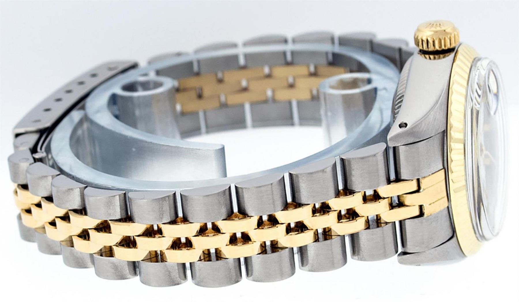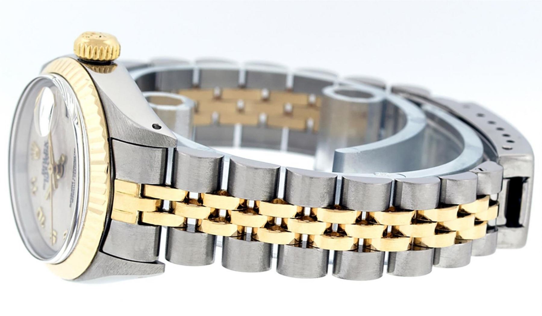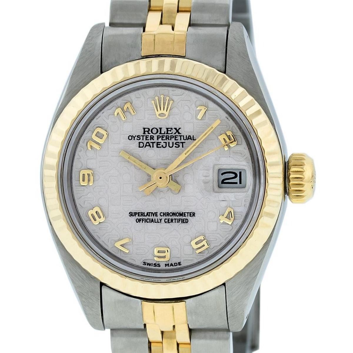 One Ladies Yellow Gold & Stainless Steel Two Tone Rolex Datejust Polished, Serviced & Electronically Tested, Yellow Gold & Stainless Steel Case: 26mm, Yellow Gold Crown, Bezel: Yellow Gold Fluted Bezel. Custom Crystal: New Acrylic Cyclops Lens. Hands: Luminescent Hands. Movement: Automatic Winding Movement. Dial: Cream Jubilee With Arabic Hour Markers. Date Window: 3 O'Clock Position Date Display, Model: Datejust. Condition: G-6 Extra Fine. Bracelet: Two Tone Yellow Gold & Stainless Steel Jubilee Band. Bright Polish. 6.0 Inch Length, Adjustable. Standard Clasp, With Rolex Logo. This Watch Has Been Serviced Time Tested And Is In Excellent Condition It Is Free Of All Scratches And Dents.
