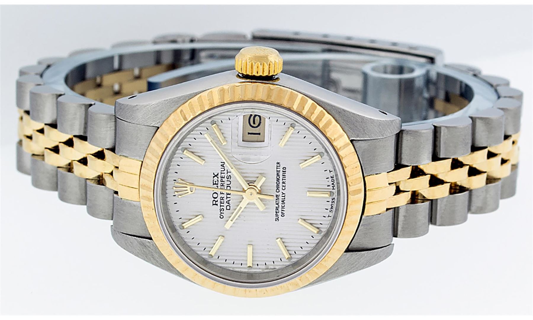 One Ladies Pre Owned Two Tone 14K Yellow Gold & Stainless Steel Rolex Polished, Serviced & Electronically Tested, 14 Yellow Gold & Stainless Steel Case: 26mm, Yellow Gold Crown, Bezel: 14K Yellow Gold Fluted Bezel. Crystal: Plastic With Magnified Date Window. Hands: Luminescent Hands. Rolex Movement: Automatic Winding Movement 2030. Rolex Dial: Silver Index Tapestry With Dash Track & Lumi Dots. Date Window: 3 O'Clock Position Date Display, Model: Datejust. Condition: G-6 Extra Fine. Rolex Bracelet: Two Tone 14K Yellow Gold & Stainless Steel Jubilee Band. Bright Polish. 6.0 Inch Length, Adjustable. Standard Clasp, With Rolex Logo. This Watch Has Been Serviced Time Tested And Is In Excellent Condition It Is Free Of All Scratches And Dents.
