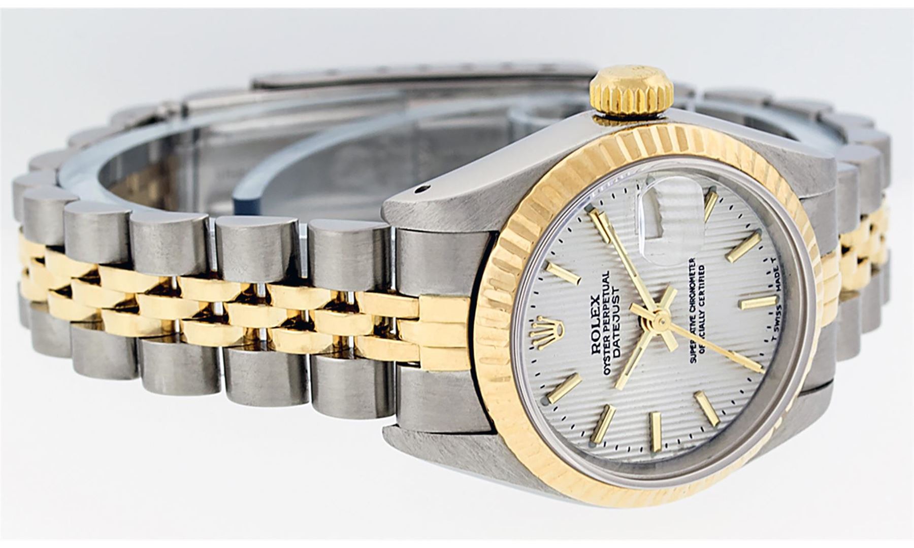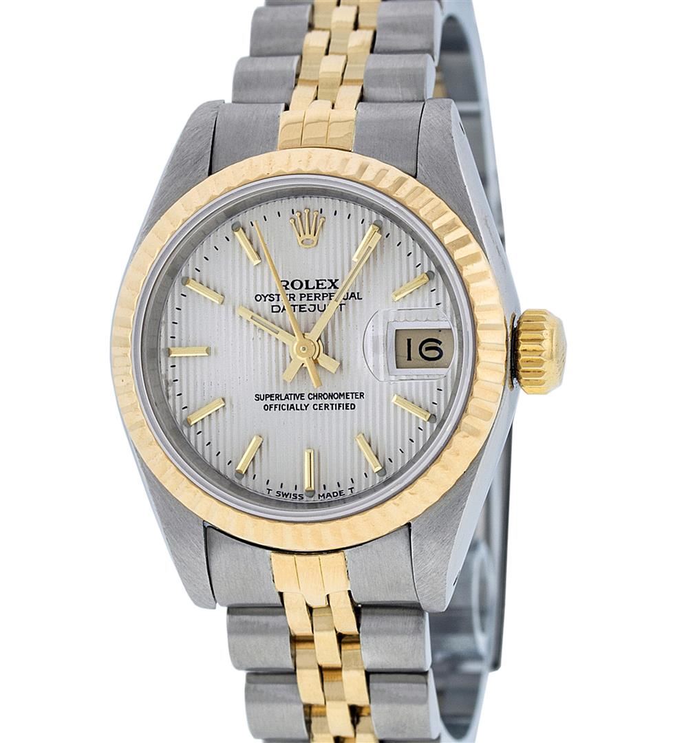 One Ladies Pre Owned Two Tone 14K Yellow Gold & Stainless Steel Rolex Polished, Serviced & Electronically Tested, 14 Yellow Gold & Stainless Steel Case: 26mm, Yellow Gold Crown, Bezel: 14K Yellow Gold Fluted Bezel. Crystal: Plastic With Magnified Date Window. Hands: Luminescent Hands. Rolex Movement: Automatic Winding Movement 2030. Rolex Dial: Silver Index Tapestry With Dash Track & Lumi Dots. Date Window: 3 O'Clock Position Date Display, Model: Datejust. Condition: G-6 Extra Fine. Rolex Bracelet: Two Tone 14K Yellow Gold & Stainless Steel Jubilee Band. Bright Polish. 6.0 Inch Length, Adjustable. Standard Clasp, With Rolex Logo. This Watch Has Been Serviced Time Tested And Is In Excellent Condition It Is Free Of All Scratches And Dents.