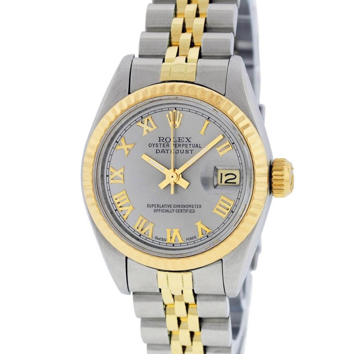 One Ladies Two Tone Rolex Datejust Polished, Serviced & Electronically Tested, Yellow Gold & Stainless Steel, Case Size: 26mm, Yellow Gold Crown, Bezel: Yellow Gold Fluted Bezel. Custom Crystal: New Acrylic Cyclops Lens. Custom Hands: New Luminescent Hands. Movement: Automatic Winding Movement. Custom Dial: Slate Grey Roman Dial. Date Window: 3 O'Clock Position Date Display, Model: Datejust. Condition: G-6 Extra Fine. Bracelet: Two Tone Yellow Gold & Stainless Steel Jubilee. Bright Polish. 6.0 Inch Length, Adjustable. Standard Clasp, With Rolex Logo. This Watch Has Been Serviced Time Tested And Is In Excellent Condition It Is Free Of All Scratches And Dents.
