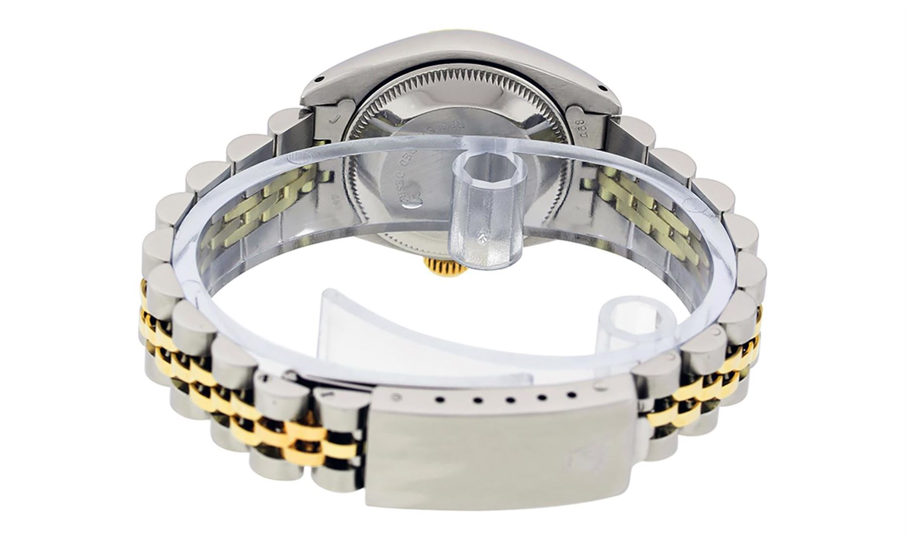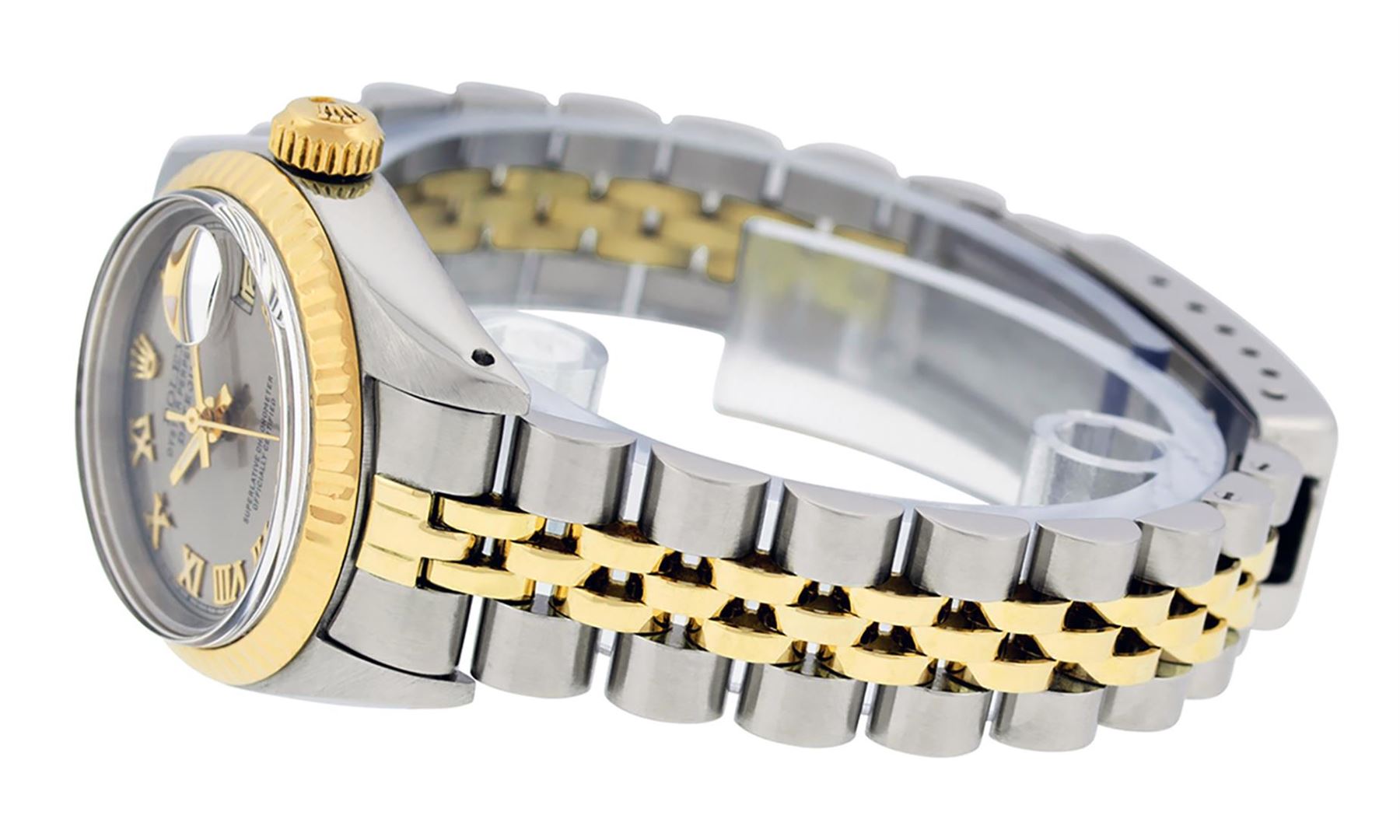 One Ladies Pre Owned Two Tone Rolex Datejust Polished, Serviced & Electronically Tested, Rolex Yellow Gold & Stainless Steel, Rolex Case Size: 26mm, Rolex Yellow Gold Crown, Rolex Bezel: Yellow Gold Fluted Bezel. Custom Crystal: New Acrylic Cyclops Lens. Custom Hands: New Luminescent Hands. Rolex Movement: Automatic Winding Movement. Rolex Dial: Slate Grey Roman Dial. Date Window: 3 O'Clock Position Date Display, Model: Datejust. Condition: G-6 Extra Fine. Rolex Bracelet: Two Tone Yellow Gold & Stainless Steel Jubilee. Bright Polish. 6.0 Inch Length, Adjustable. Standard Clasp, With Rolex Logo. This Watch Has Been Serviced Time Tested And Is In Excellent Condition It Is Free Of All Scratches And Dents.