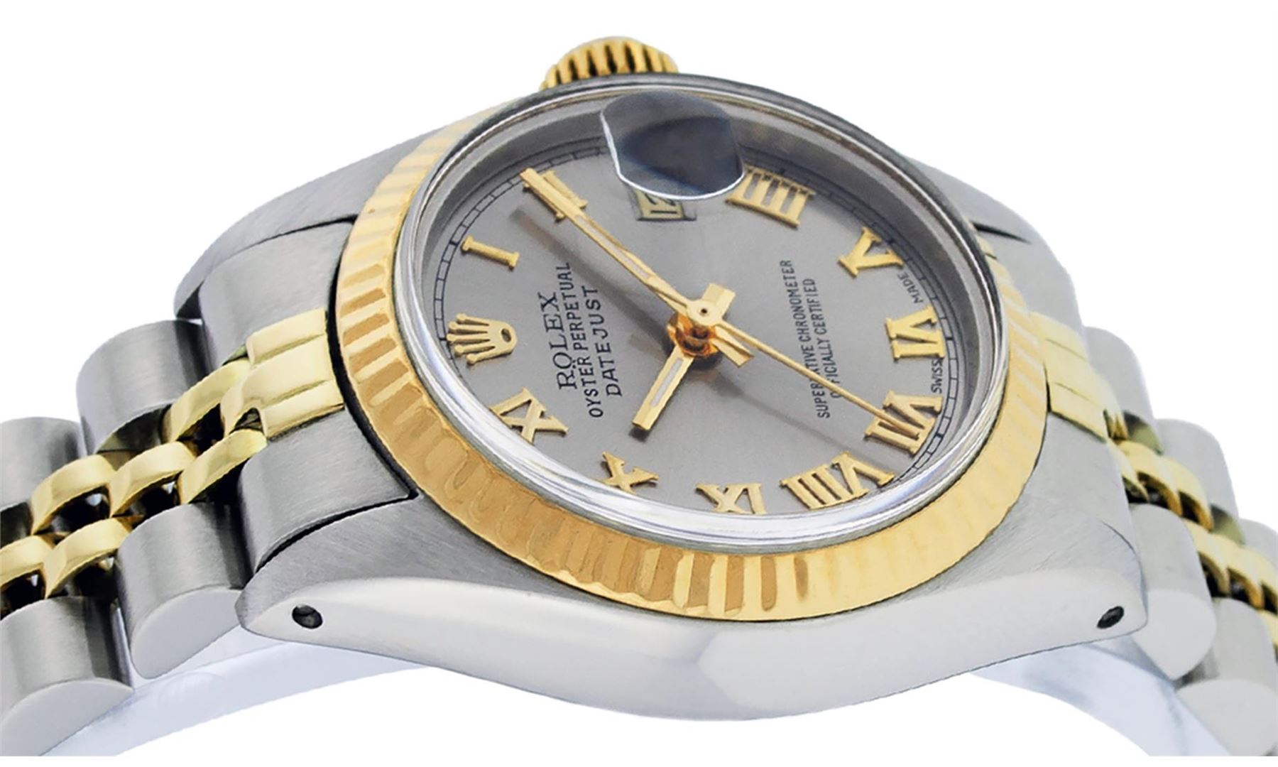 One Ladies Pre Owned Two Tone 14K Yellow Gold & Stainless Steel Rolex Polished, Serviced & Electronically Tested, Rolex 14K Yellow Gold & Stainless Steel, Rolex Case Size: 26mm, Rolex Yellow Gold Crown, Rolex Bezel: 14K Yellow Gold Fluted Bezel. Custom Crystal: New Plastic With Magnified Date Window. Hands: Luminescent Hands. Rolex Movement: Automatic Winding Movement 2030. Rolex Dial: Slate Grey Roman Dial With Square Track. Date Window: 3 O'Clock Position Date Display, Model: Date. Condition: G-6 Extra Fine. Rolex Bracelet: Two Tone 14K Yellow Gold & Stainless Steel Jubilee Band. Bright Polish. 6.0 Inch Length, Adjustable. Standard Clasp, With Rolex Logo. This Watch Has Been Serviced Time Tested And Is In Excellent Condition It Is Free Of All Scratches And Dents.