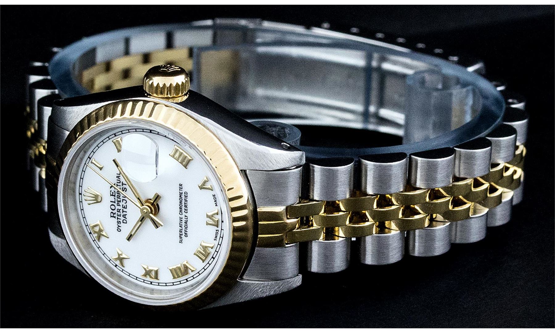One Ladies Two Tone Rolex Datejust Polished, Serviced & Electronically Tested, Yellow Gold & Stainless Steel Case: 26mm, Yellow Gold Crown, Bezel: Yellow Gold Fluted Bezel. Custom Crystal: New Acrylic Cyclops Lens. Custom Hands: New Luminescent Hands. Movement: Automatic Winding Movement. Dial: White Roman With Square Track. Date Window: 3 O'Clock Position Date Display, Model: Datejust. Condition: G-6 Extra Fine. Bracelet: Two Tone Yellow Gold & Stainless Steel Jubilee Band. Bright Polish. 6.0 Inch Length, Adjustable. Standard Clasp, With Rolex Logo. This Watch Has Been Serviced Time Tested And Is In Excellent Condition It Is Free Of All Scratches And Dents.