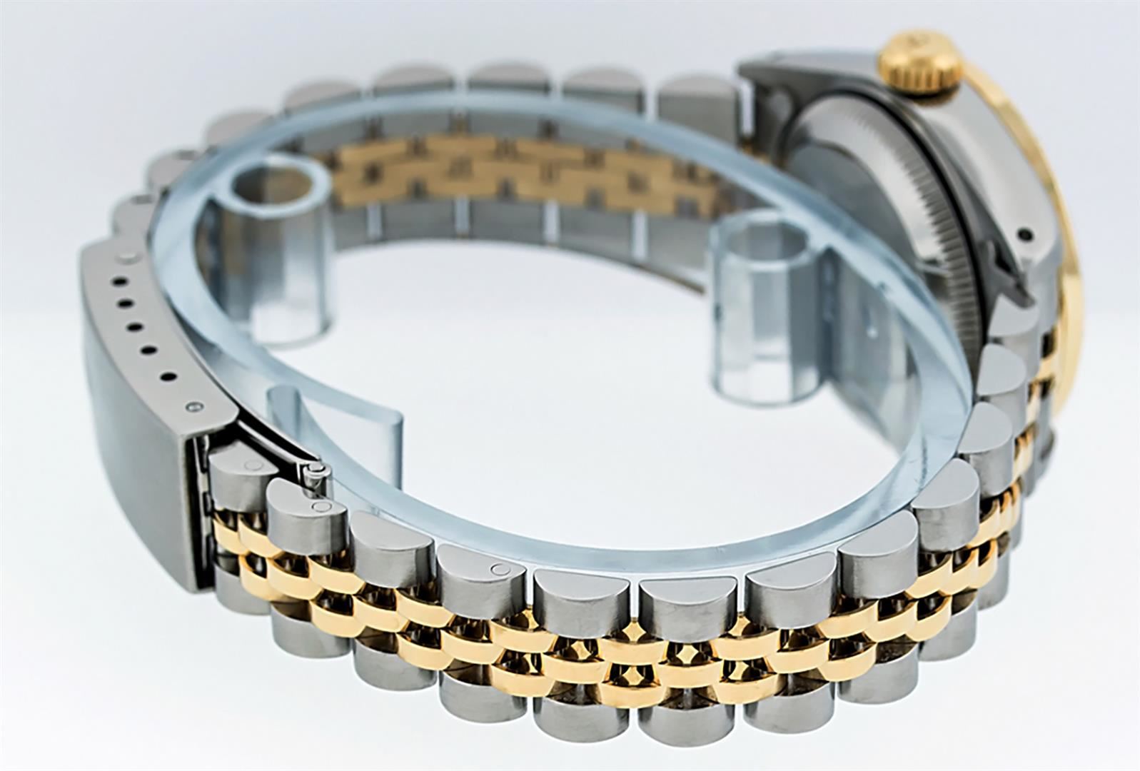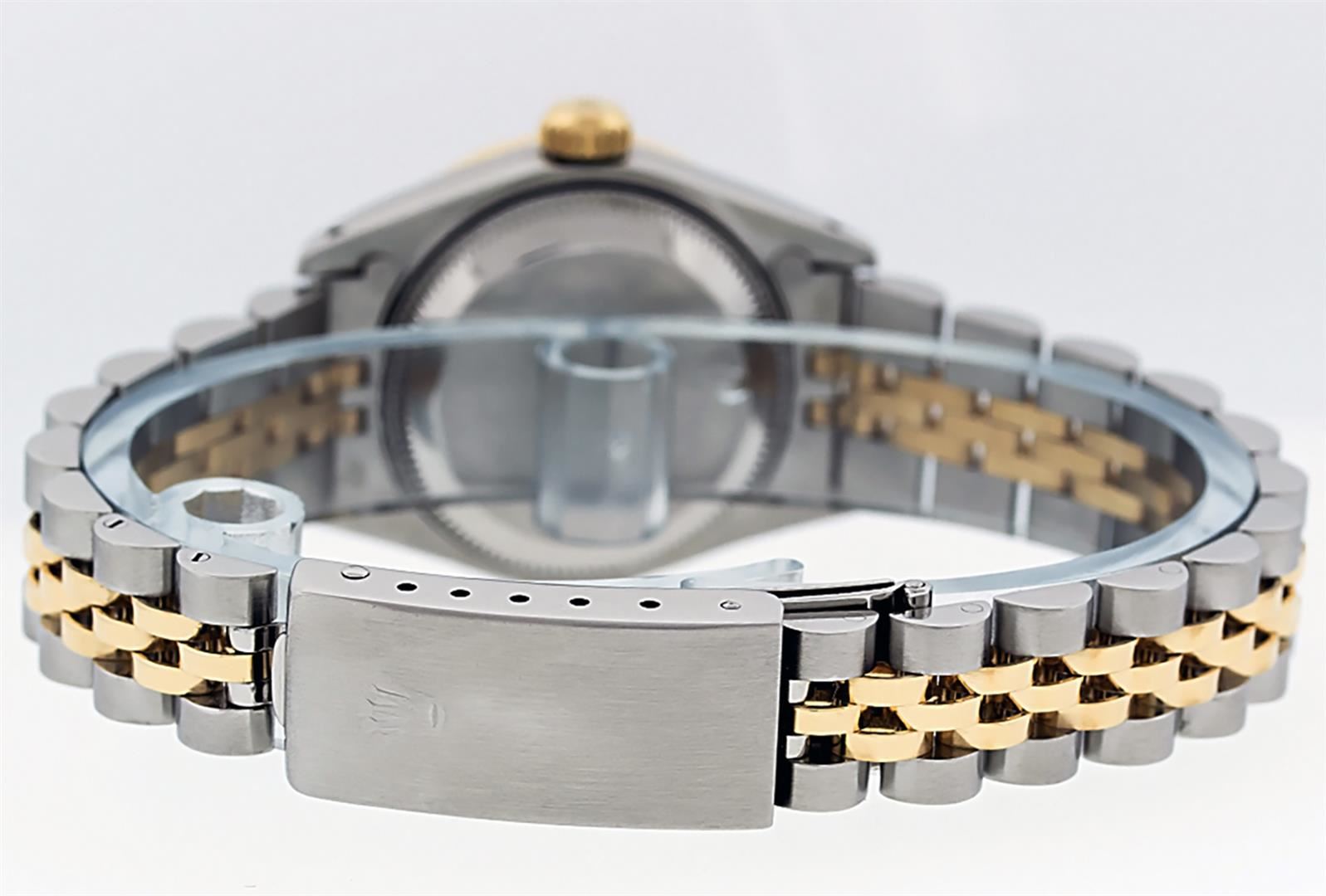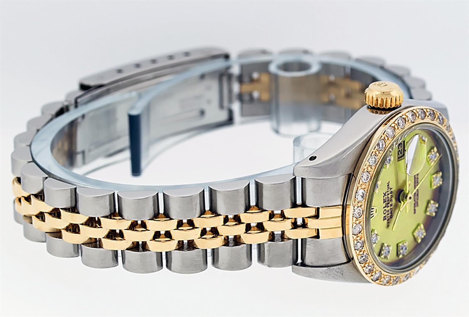 One Ladies Two Tone Rolex Datejust Polished, Serviced & Electronically Tested, Yellow Gold & Stainless Steel Case: 26mm, Yellow Gold Crown, Custom Bezel: New 18K .70ctw Yellow Gold Beadset Diamond Bezel, Diamond Count: 32 Diamonds, Total Weight 1.00 Carat, Clarity: SI-VS, Color: G to H. Custom Crystal: New Scratch Resistant Synthetic Sapphire Cyclops Lens. Custom Hands: New Luminescent Hands. Movement: Automatic Winding Movement. Custom Dial: Yellow VS Diamond Dial, Diamond Count: 10 Single Cut Diamonds in Dial, G To H In Color, VS Clarity. Date Window: 3 O'Clock Position Date Display, Model: Datejust, Condition: G-6 Extra Fine. Bracelet: Two Tone Yellow Gold & Stainless Steel Jubilee. Bright Polish. 6.0 Inch Length, Adjustable. Standard Clasp, With Rolex Logo. This Watch Has Been Serviced Time Tested And Is In Excellent Condition It Is Free Of All Scratches And Dents.