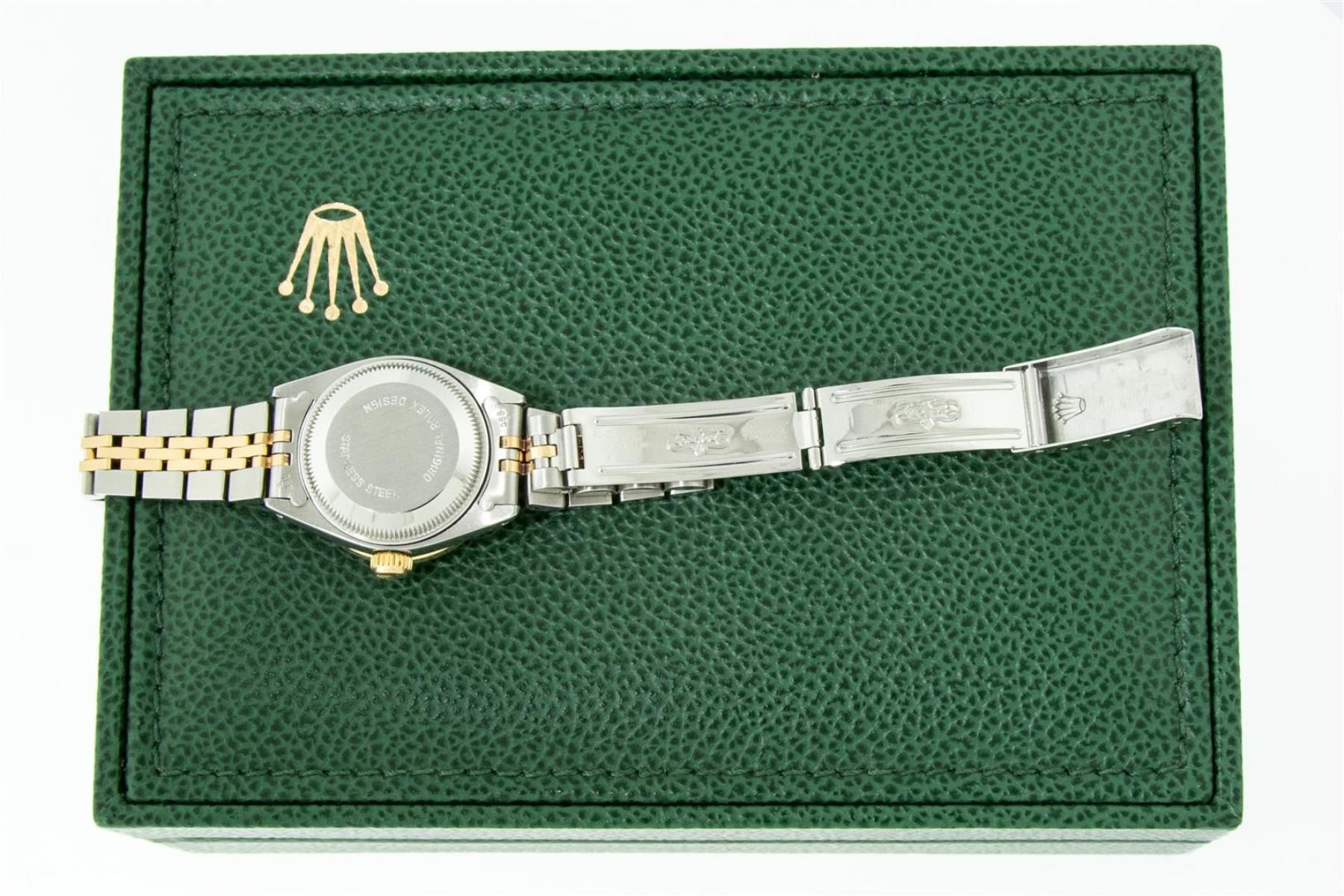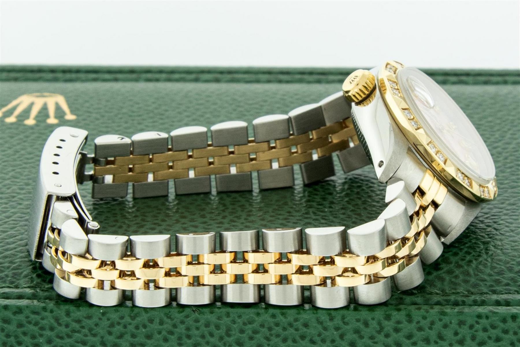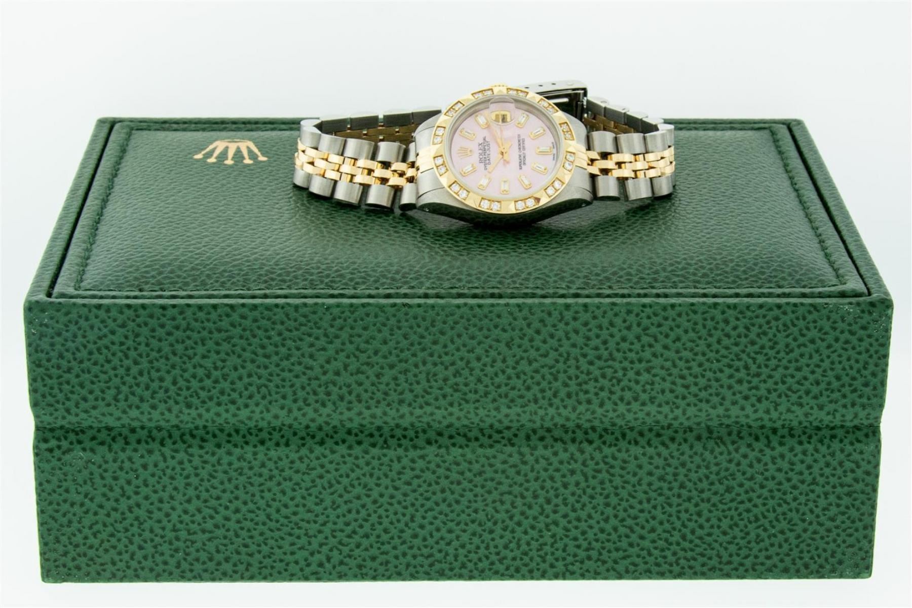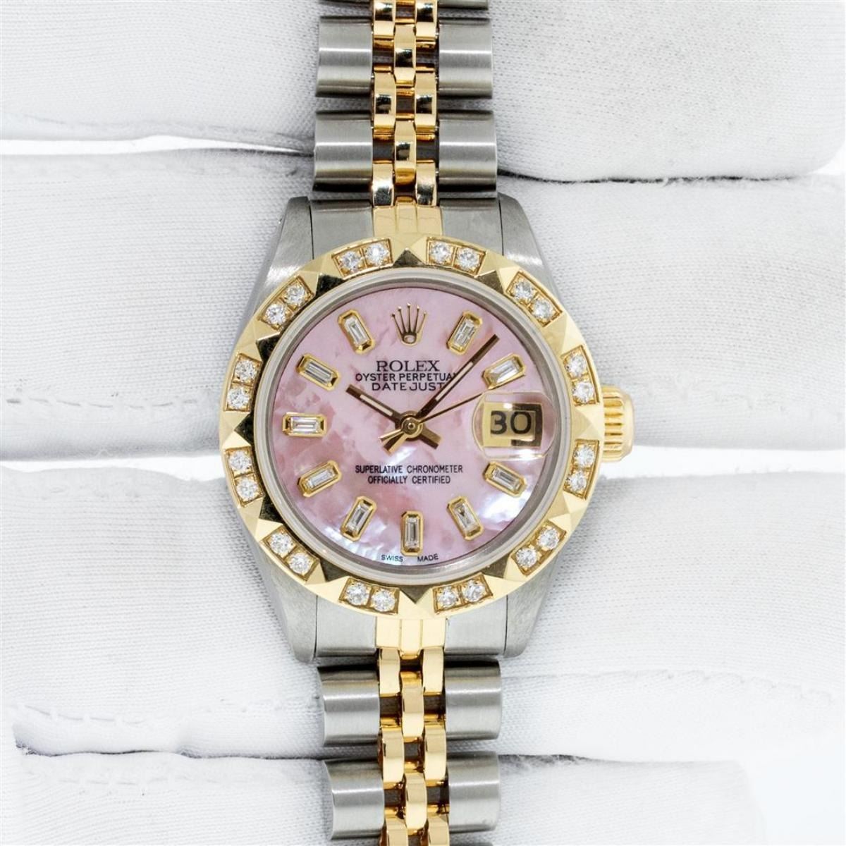 One Ladies Yellow Gold Two Tone and Stainless Steel Rolex Datejust Polished, Serviced & Electronically Tested, Yellow Gold & Stainless Steel Case: 26mm, Yellow Gold Crown, Custom Bezel: 18K Yellow Gold Pyramid Diamond Bezel, Diamond Count: 24 Diamonds Total Weight .50 Carat, Clarity: SI-VS, Color: G to H. Custom Crystal: New Scratch Resistant Synthetic Sapphire Cyclops Lens. Custom Hands: New Luminescent Hands. Movement: Automatic Winding Movement. Custom Dial: Pink Mother Of Pearl Baguette Diamond Hour Markers. 10 Baguette Diamonds In Dial, Clarity: SI-VS, Color: G to H. Date Window: 3 O'Clock Position Date Display, Model: Datejust. Condition: G-6 Extra Fine. Bracelet: Two Tone Yellow Gold & Stainless Steel Jubilee. Bright Polish. 6.0 Inch Length, Adjustable. Standard Clasp, With Rolex Logo. This Watch Has Been Serviced Time Tested And Is In Excellent Condition It Is Free Of All Scratches And Dents. This Watch Comes With A Rolex Box.