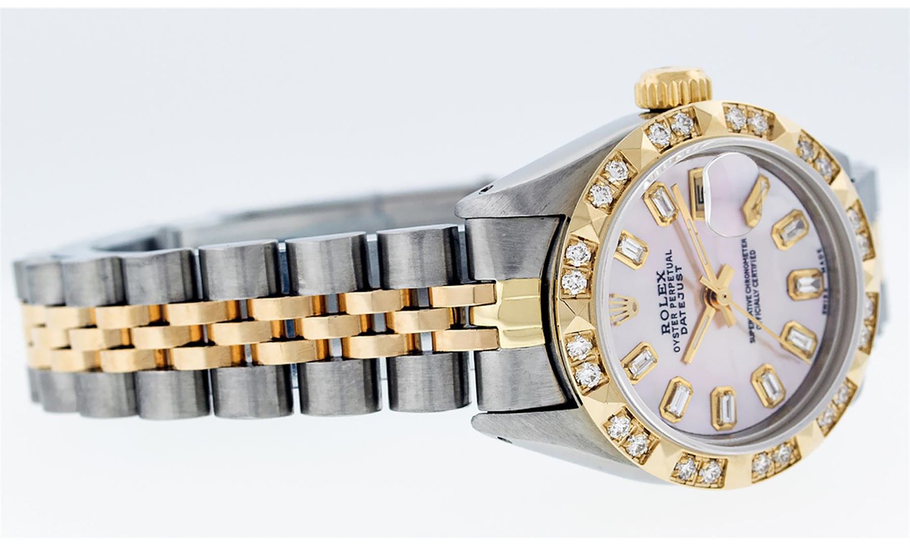 One Ladies Yellow Gold Two Tone and Stainless Steel Rolex Datejust Polished, Serviced & Electronically Tested, Yellow Gold & Stainless Steel Case: 26mm, Yellow Gold Crown, Custom Bezel: 18K Yellow Gold Pyramid Diamond Bezel, Diamond Count: 24 Diamonds Total Weight .50 Carat, Clarity: SI-VS, Color: G to H. Custom Crystal: New Scratch Resistant Synthetic Sapphire Cyclops Lens. Custom Hands: New Luminescent Hands. Movement: Automatic Winding Movement. Custom Dial: Pink Mother Of Pearl Baguette Diamond Hour Markers. 10 Baguette Diamonds In Dial, Clarity: SI-VS, Color: G to H. Date Window: 3 O'Clock Position Date Display, Model: Datejust. Condition: G-6 Extra Fine. Bracelet: Two Tone Yellow Gold & Stainless Steel Jubilee. Bright Polish. 6.0 Inch Length, Adjustable. Standard Clasp, With Rolex Logo. This Watch Has Been Serviced Time Tested And Is In Excellent Condition It Is Free Of All Scratches And Dents.