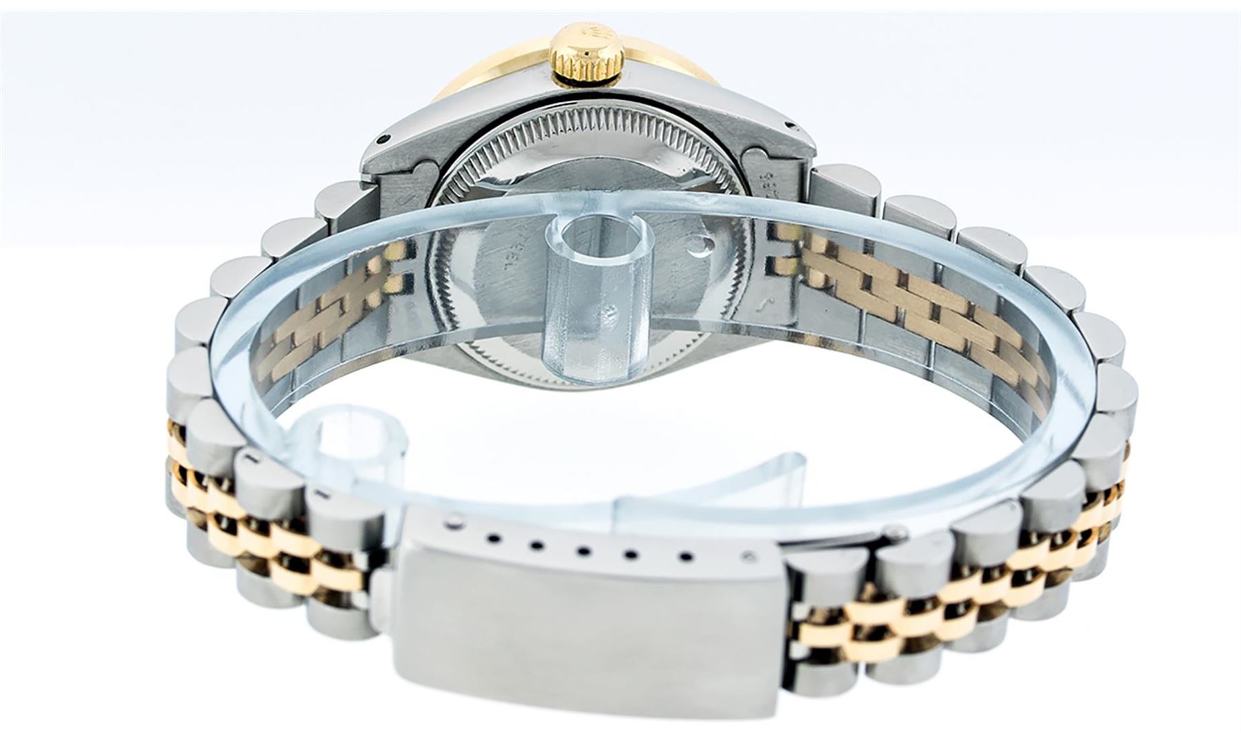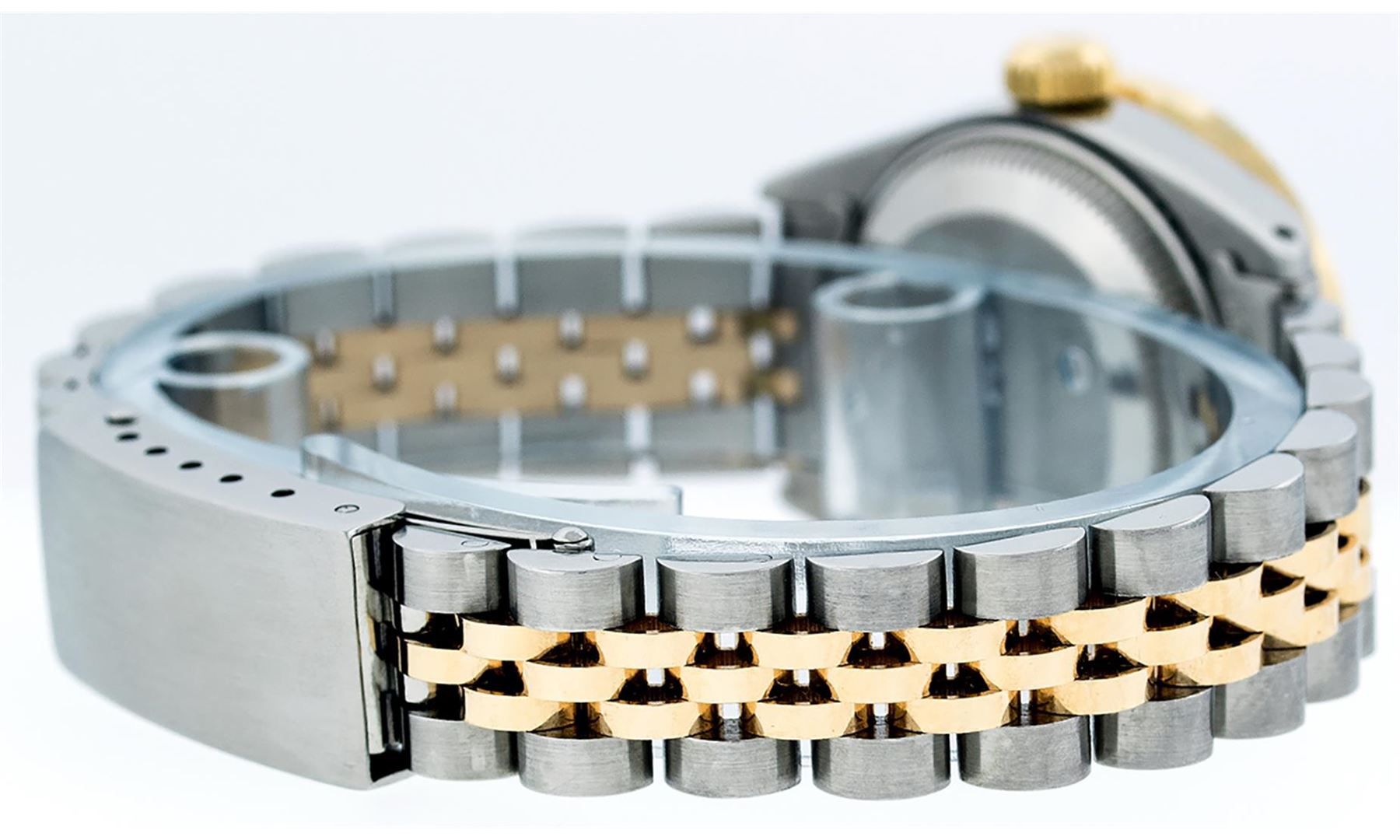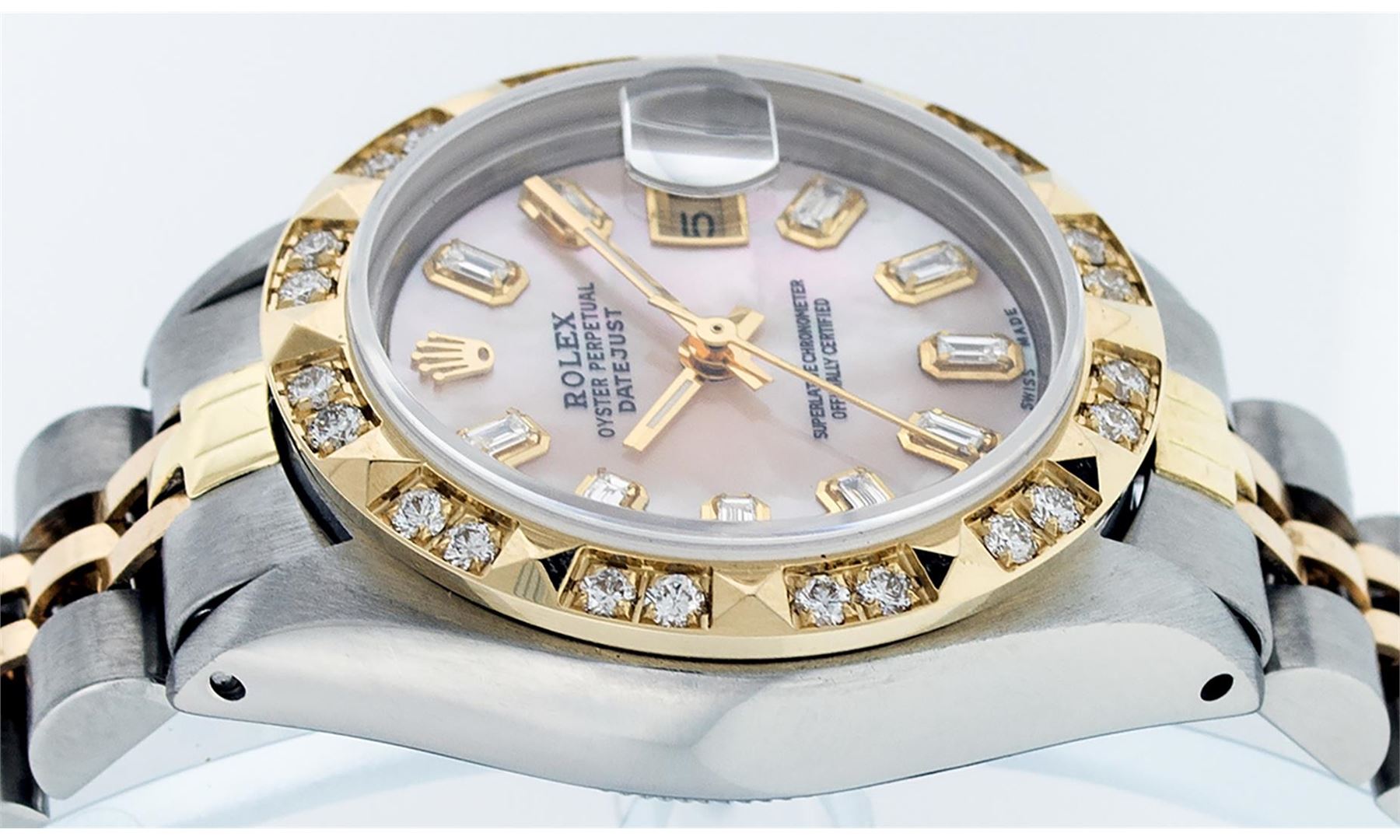 One Ladies Yellow Gold Two Tone and Stainless Steel Rolex Datejust Polished, Serviced & Electronically Tested, Yellow Gold & Stainless Steel Case: 26mm, Yellow Gold Crown, Custom Bezel: 18K Yellow Gold Pyramid Diamond Bezel, Diamond Count: 24 Diamonds Total Weight .50 Carat, Clarity: SI-VS, Color: G to H. Custom Crystal: New Scratch Resistant Synthetic Sapphire Cyclops Lens. Custom Hands: New Luminescent Hands. Movement: Automatic Winding Movement. Custom Dial: Pink Mother Of Pearl Baguette Diamond Hour Markers. 10 Baguette Diamonds In Dial, Clarity: SI-VS, Color: G to H. Date Window: 3 O'Clock Position Date Display, Model: Datejust. Condition: G-6 Extra Fine. Bracelet: Two Tone Yellow Gold & Stainless Steel Jubilee. Bright Polish. 6.0 Inch Length, Adjustable. Standard Clasp, With Rolex Logo. This Watch Has Been Serviced Time Tested And Is In Excellent Condition It Is Free Of All Scratches And Dents.