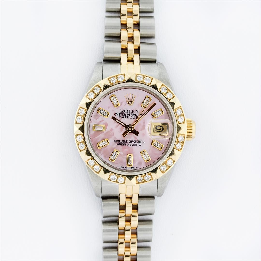 One Ladies Yellow Gold Two Tone and Stainless Steel Rolex Datejust Polished, Serviced & Electronically Tested, Yellow Gold & Stainless Steel Case: 26mm, Yellow Gold Crown, Custom Bezel: 18K Yellow Gold Pyramid Diamond Bezel, Diamond Count: 24 Diamonds Total Weight .50 Carat, Clarity: SI-VS, Color: G to H. Custom Crystal: New Scratch Resistant Synthetic Sapphire Cyclops Lens. Custom Hands: New Luminescent Hands. Movement: Automatic Winding Movement. Custom Dial: Pink Mother Of Pearl Baguette Diamond Hour Markers. 10 Baguette Diamonds In Dial, Clarity: SI-VS, Color: G to H. Date Window: 3 O'Clock Position Date Display, Model: Datejust. Condition: G-6 Extra Fine. Bracelet: Two Tone Yellow Gold & Stainless Steel Jubilee. Bright Polish. 6.0 Inch Length, Adjustable. Standard Clasp, With Rolex Logo. This Watch Has Been Serviced Time Tested And Is In Excellent Condition It Is Free Of All Scratches And Dents.