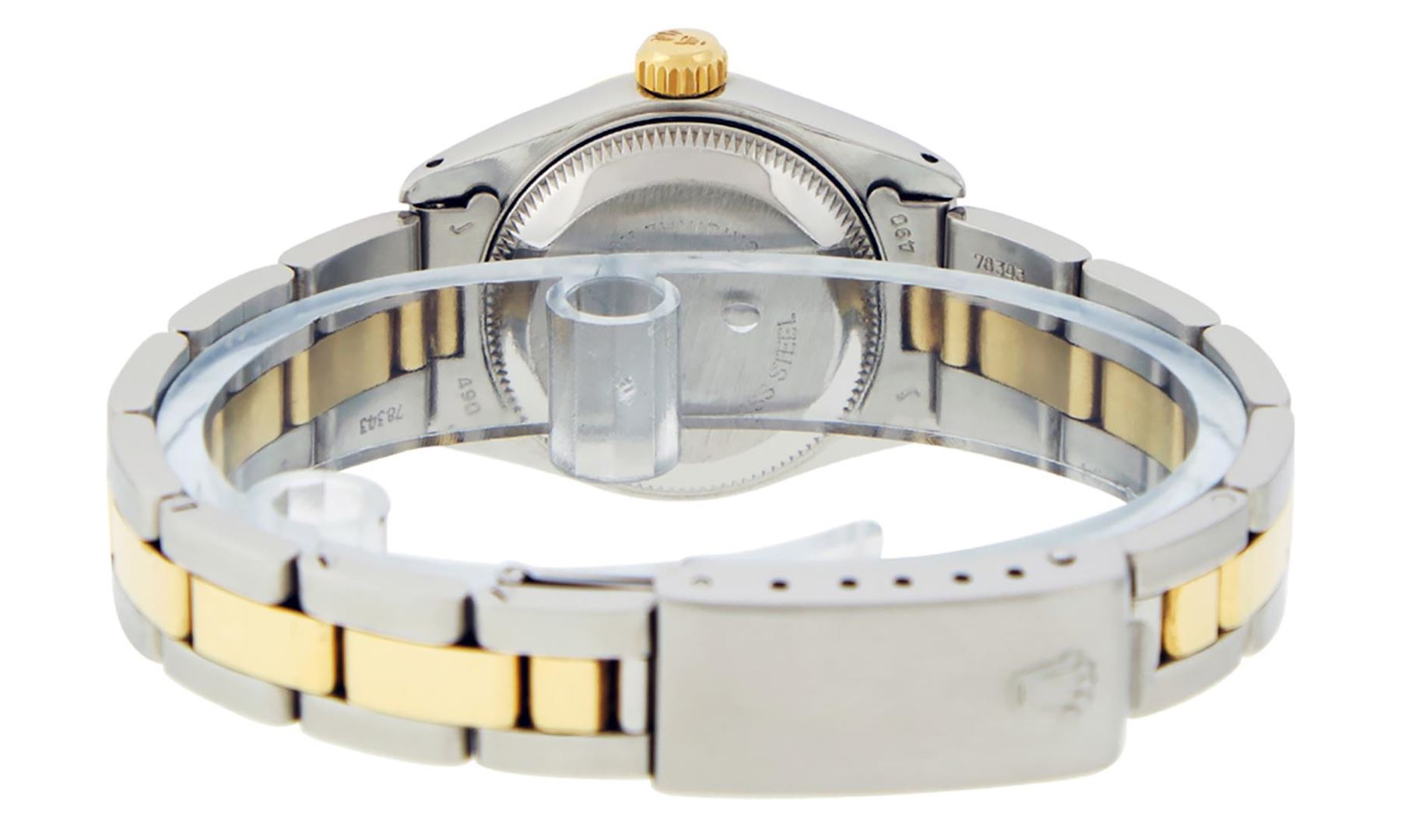 One Ladies Pre Owned Two Tone Yellow Gold And Stainless Steel Rolex Datejust Polished, Serviced & Electronically Tested, Rolex Yellow Gold & Stainless Steel Case: 26mm, Rolex Yellow Gold Crown, Rolex Bezel: Yellow Gold Fluted Bezel. Custom Crystal: New Acrylic Magnified Date Window. Custom Hands: New Luminescent Hands. Rolex Movement: Automatic Winding Movement. Custom Dial: Refinished Black With Custom Added Diamonds, Diamond Count: 10 Single Cut Diamonds, Color: G to H, Clarity: VS. Date Window: 3 O'Clock Position Date Display, Model: Datejust. Condition: G-6 Extra Fine. Rolex Bracelet: Two Tone Yellow Gold & Stainless Steel Oyster Band. Bright Polish. 6.0 Inch Length, Adjustable. Standard Clasp, With Rolex Logo. This Watch Has Been Serviced Time Tested And Is In Excellent Condition It Is Free Of All Scratches And Dents.