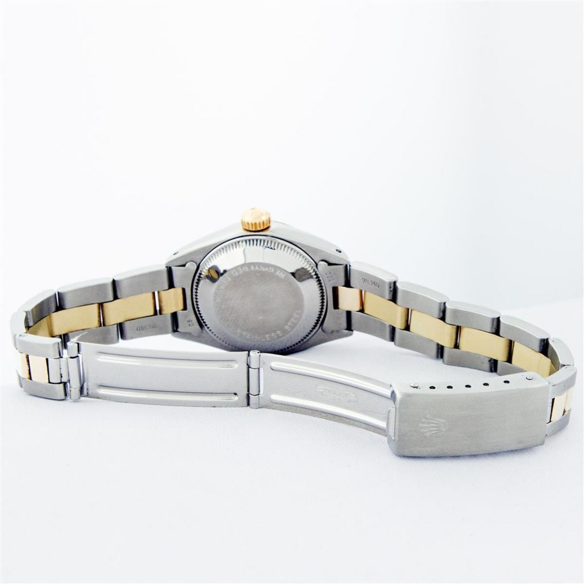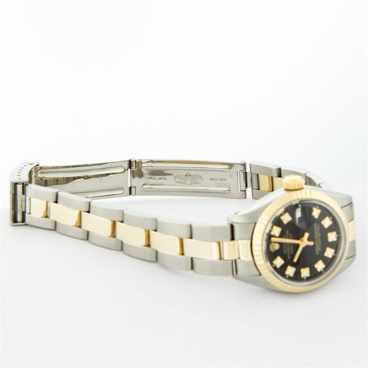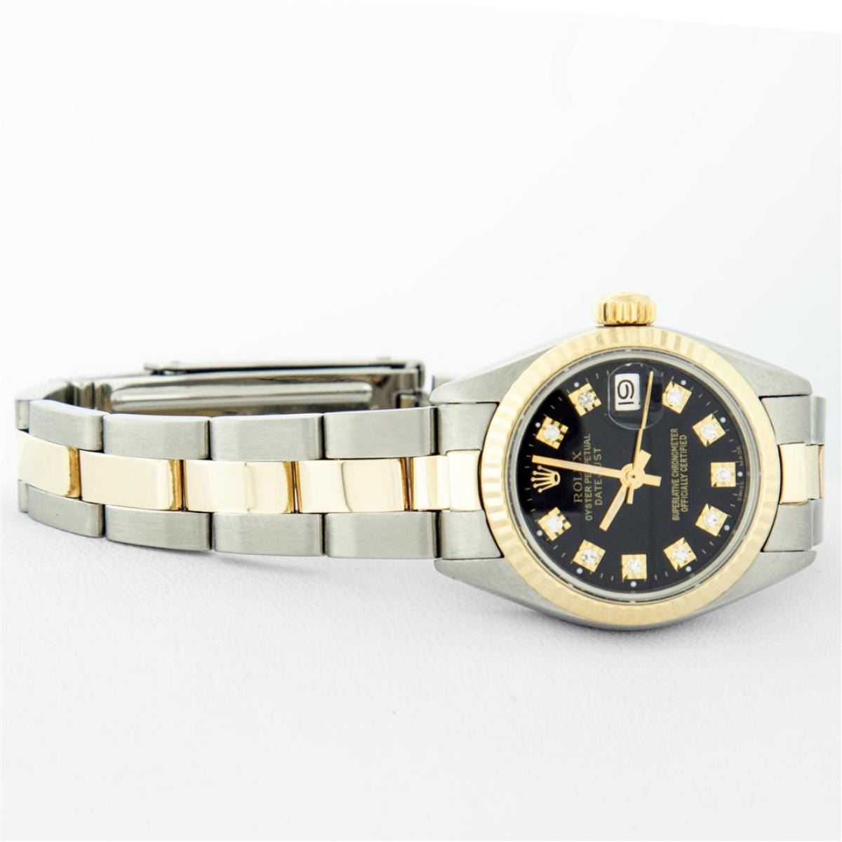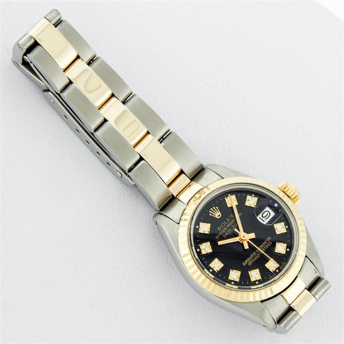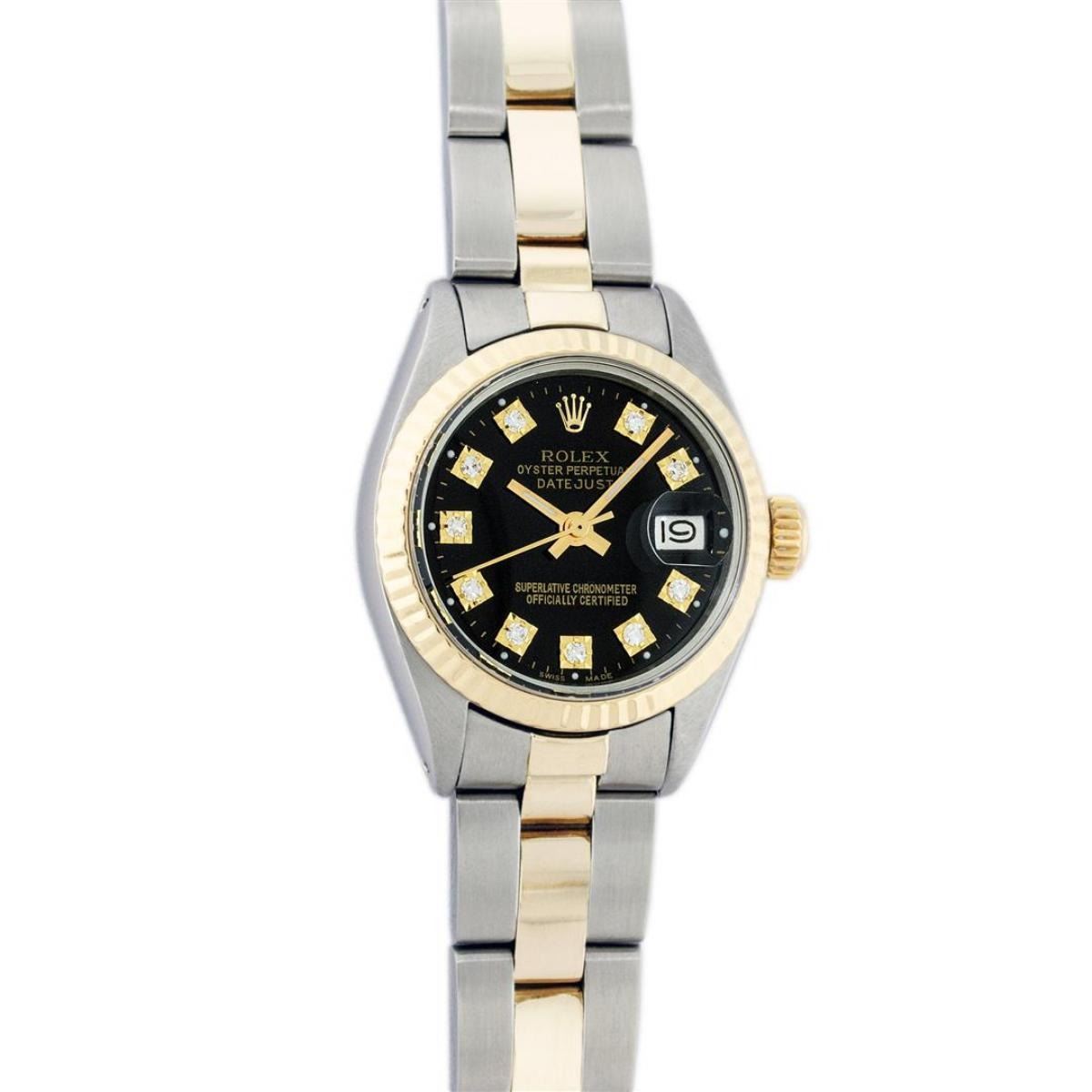 One Ladies Two Tone Yellow Gold And Stainless Steel Rolex Datejust Polished, Serviced & Electronically Tested, Yellow Gold & Stainless Steel Case: 26mm, Yellow Gold Crown, Bezel: Yellow Gold Fluted Bezel. Custom Crystal: New Acrylic Cyclops Lens. Custom Hands: New Luminescent Hands. Movement: Automatic Winding Movement. Custom Dial: Black With Diamond Hour Markers, Diamond Count: 10 Single Cut Diamonds, Color: G to H, Clarity: VS. Date Window: 3 O'Clock Position Date Display, Model: Datejust. Condition: G-6 Extra Fine. Bracelet: Two Tone Yellow Gold & Stainless Steel Oyster Band. Bright Polish. 6.0 Inch Length, Adjustable. Standard Clasp, With Rolex Logo. This Watch Has Been Serviced Time Tested And Is In Excellent Condition It Is Free Of All Scratches And Dents.