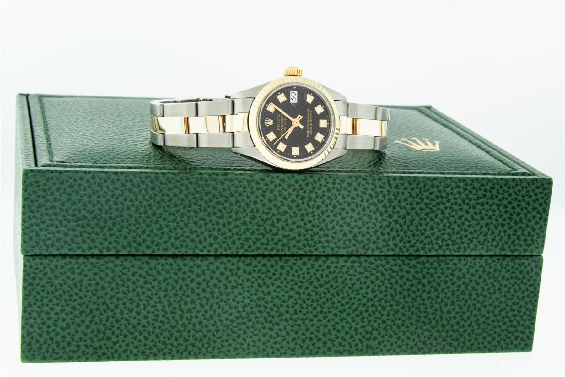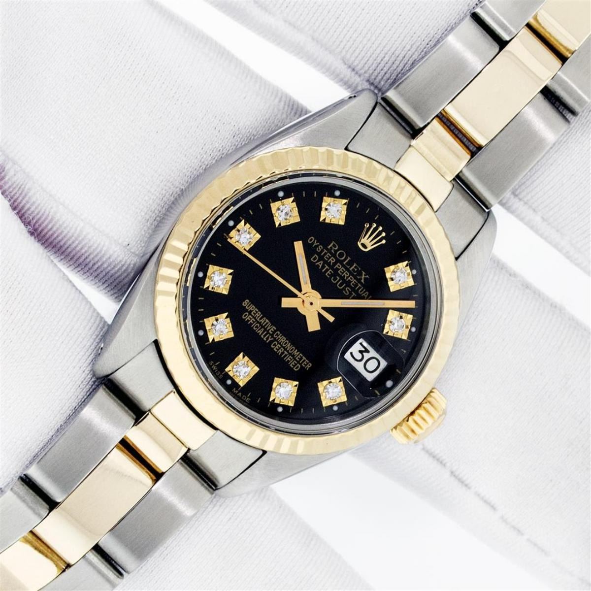 One Ladies Two Tone Yellow Gold And Stainless Steel Rolex Datejust Polished, Serviced & Electronically Tested, Yellow Gold & Stainless Steel Case: 26mm, Yellow Gold Crown, Bezel: Yellow Gold Fluted Bezel. Custom Crystal: New Acrylic Cyclops Lens. Custom Hands: New Luminescent Hands. Movement: Automatic Winding Movement. Custom Dial: Black With Diamond Hour Markers, Diamond Count: 10 Single Cut Diamonds, Color: G to H, Clarity: VS. Date Window: 3 O'Clock Position Date Display, Model: Datejust. Condition: G-6 Extra Fine. Bracelet: Two Tone Yellow Gold & Stainless Steel Oyster Band. Bright Polish. 6.0 Inch Length, Adjustable. Standard Clasp, With Rolex Logo. This Watch Has Been Serviced Time Tested And Is In Excellent Condition It Is Free Of All Scratches And Dents.