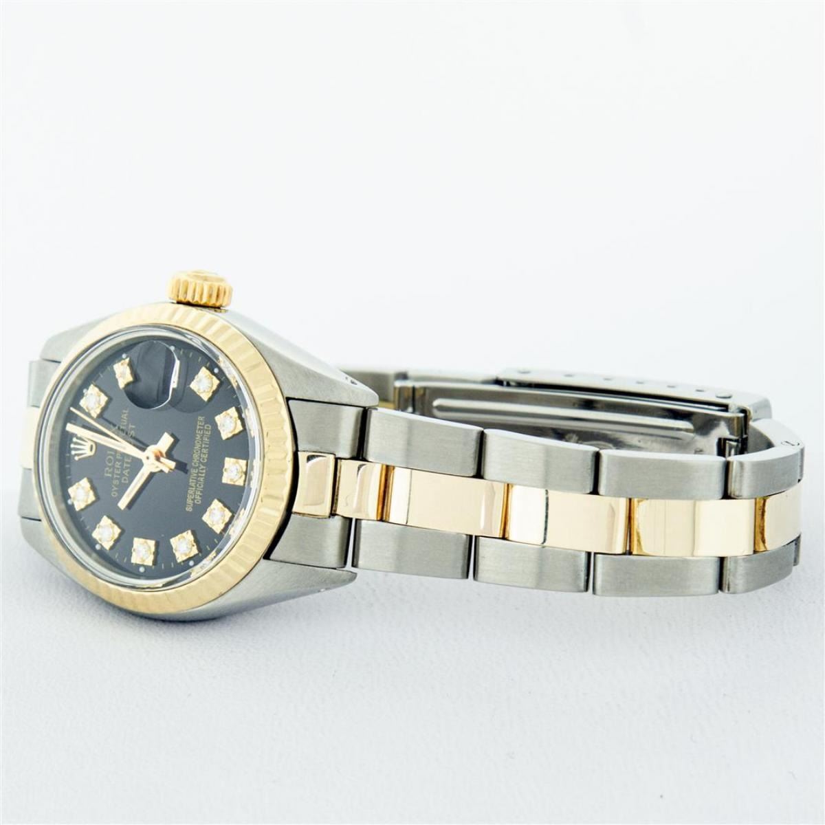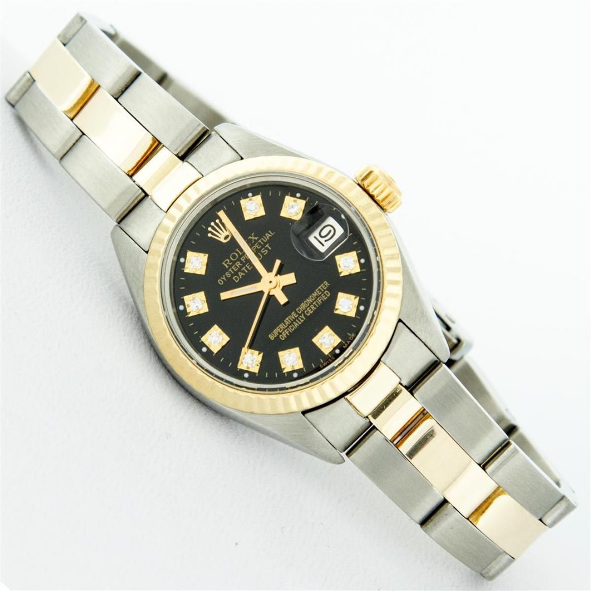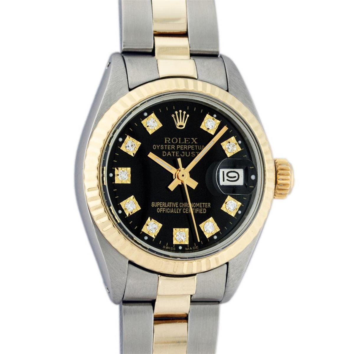 One Ladies Two Tone Yellow Gold And Stainless Steel Rolex Datejust Polished, Serviced & Electronically Tested, Yellow Gold & Stainless Steel Case: 26mm, Yellow Gold Crown, Bezel: Yellow Gold Fluted Bezel. Custom Crystal: New Acrylic Cyclops Lens. Custom Hands: New Luminescent Hands. Movement: Automatic Winding Movement. Custom Dial: Black With Diamond Hour Markers, Diamond Count: 10 Single Cut Diamonds, Color: G to H, Clarity: VS. Date Window: 3 O'Clock Position Date Display, Model: Datejust. Condition: G-6 Extra Fine. Bracelet: Two Tone Yellow Gold & Stainless Steel Oyster Band. Bright Polish. 6.0 Inch Length, Adjustable. Standard Clasp, With Rolex Logo. This Watch Has Been Serviced Time Tested And Is In Excellent Condition It Is Free Of All Scratches And Dents.
