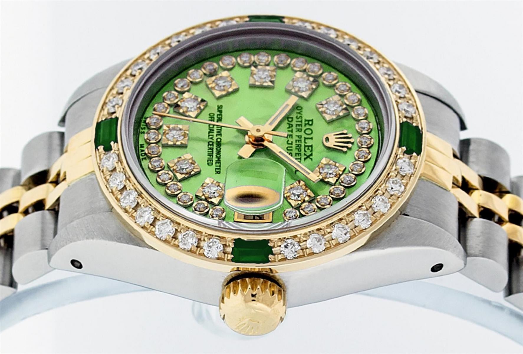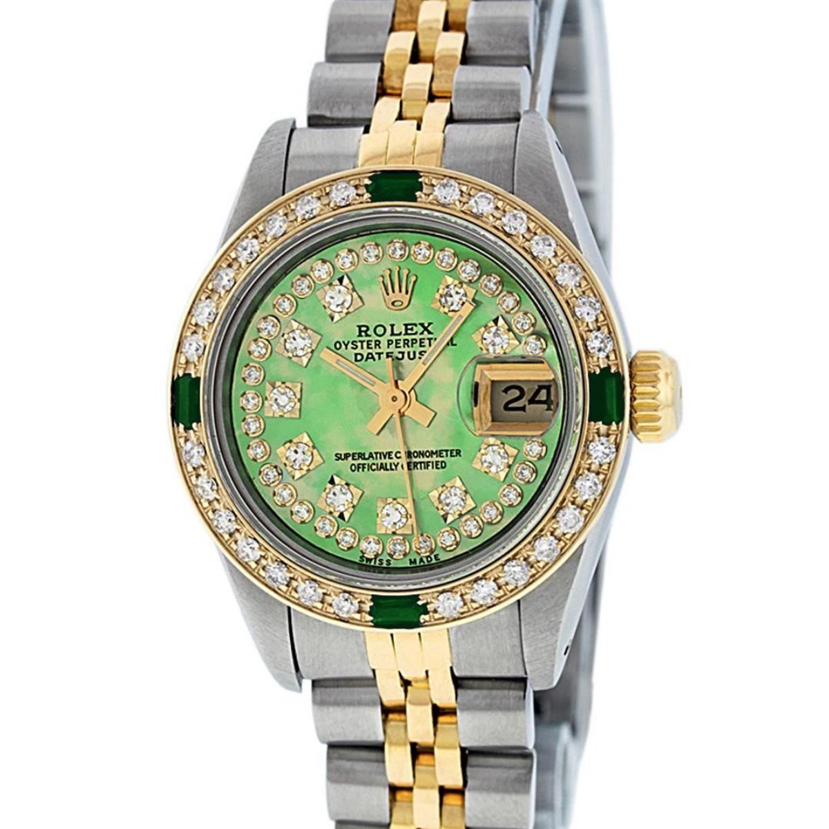 One Ladies Two Tone Rolex Datejust Polished, Serviced & Electronically Tested, Yellow Gold & Stainless Steel Case: 26mm, Yellow Gold Crown, Custom Bezel: New 18K Yellow Gold Emerald Beadset Diamond Bezel, Diamond + Gem Count: 28 Diamonds + 4 Emeralds, Total Weight .70 Carat, Clarity: SI-VS, Color: G to H. Custom Crystal: New Scratch Resisant Synthetic Sapphire Cyclops Lens. Custom Hands: New Luminescent Hands. Movement: Automatic Winding Movement. Custom Dial: Green Mother Of Pearl String Diamond Dial, Diamond Count: 43 Diamond in Dial, G To H In Color, VS Clarity. Date Window: 3 O'Clock Position Date Display, Model: Datejust, Condition: G-6 Extra Fine. Bracelet: Two Tone Yellow Gold & Stainless Steel Jubilee. Bright Polish. 6.0 Inch Length, Adjustable. Standard Clasp, With Rolex Logo. This Watch Has Been Serviced Time Tested And Is In Excellent Condition It Is Free Of All Scratches And Dents.